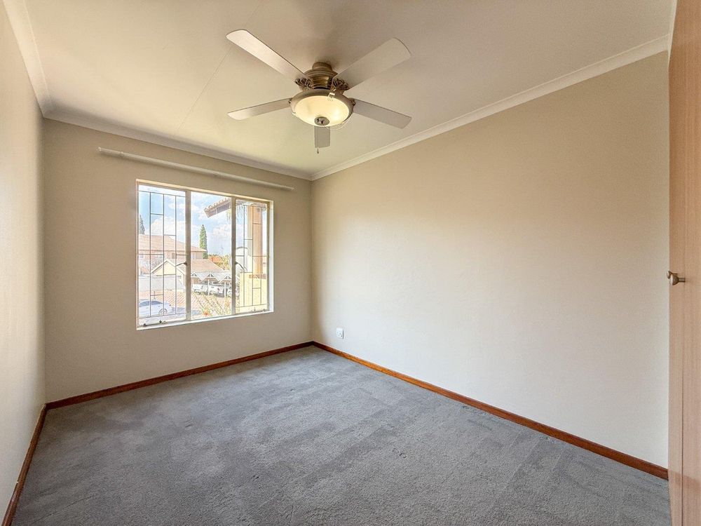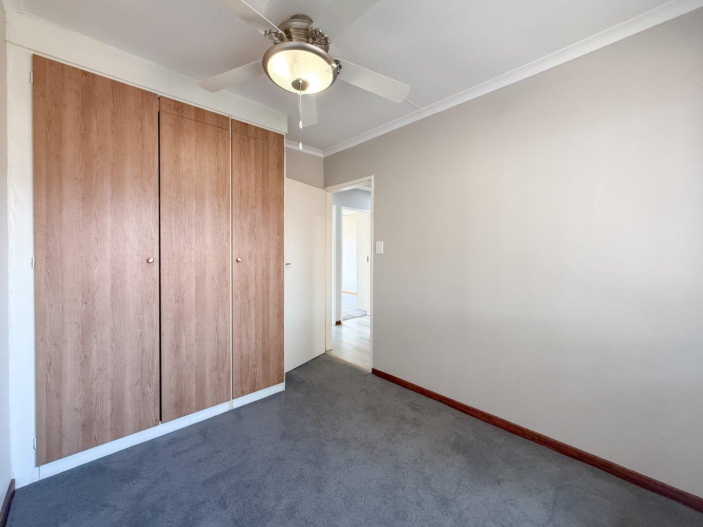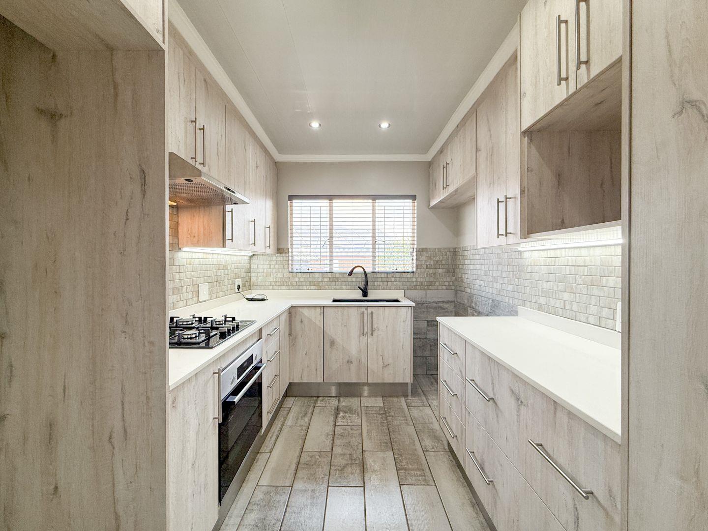 The open-plan living and dining area flows seamlessly to a covered patio with a built-in braai, where you can unwind and enjoy the most beautiful sunsets. The kitchen features a gas stove, space for two appliances, a single-door fridge and ample cupboards (with caesarstone tops).