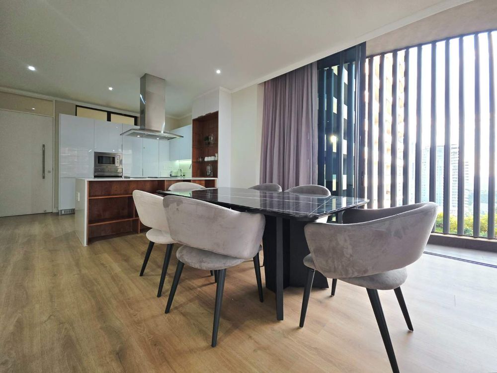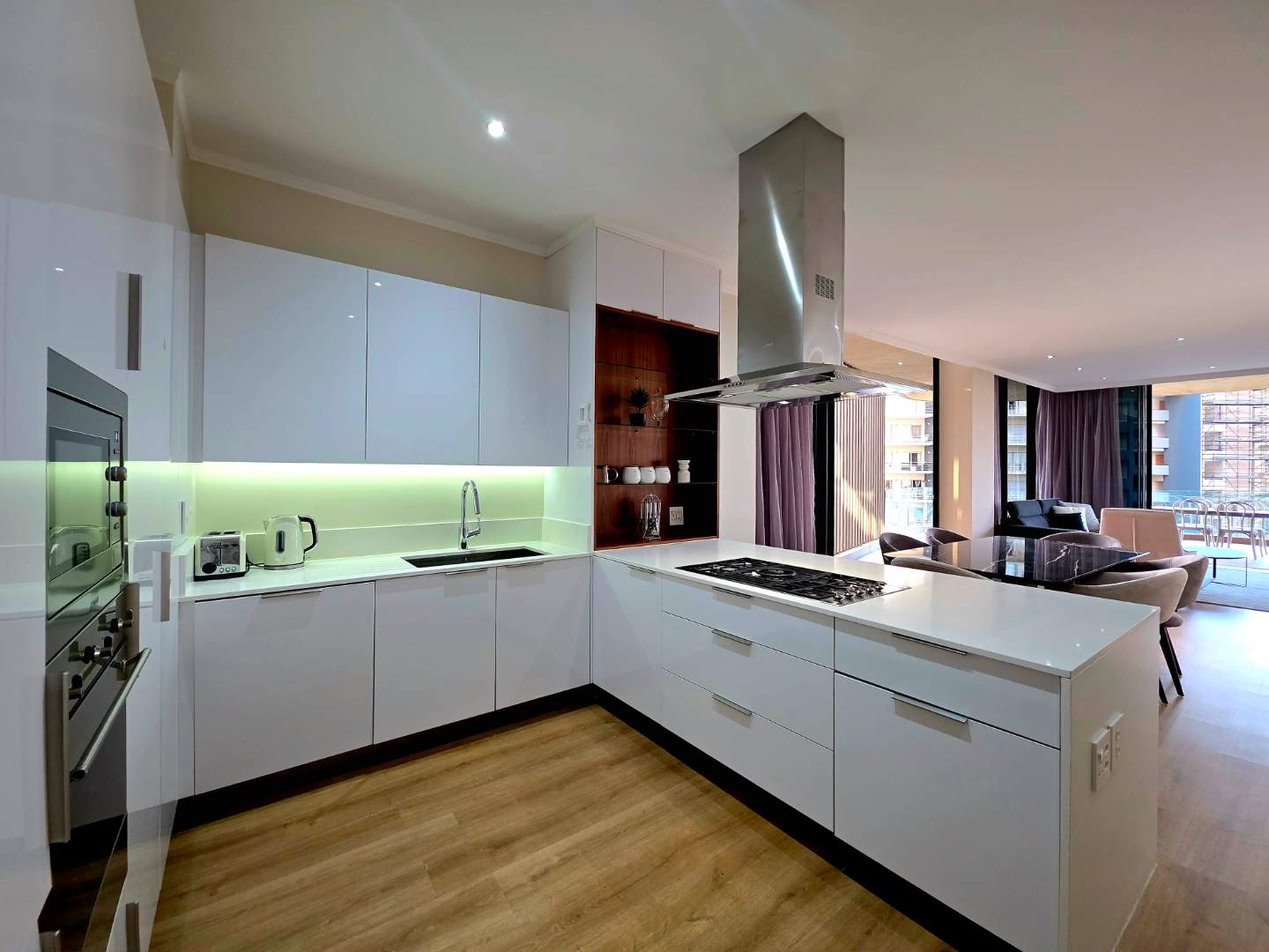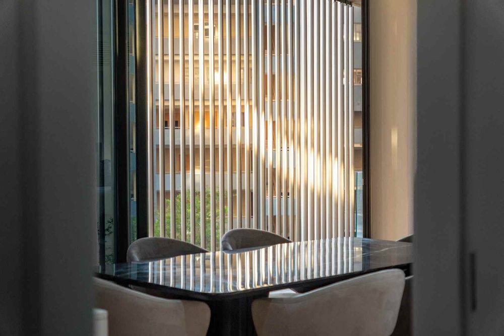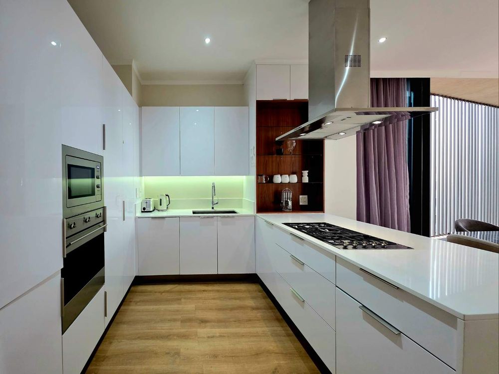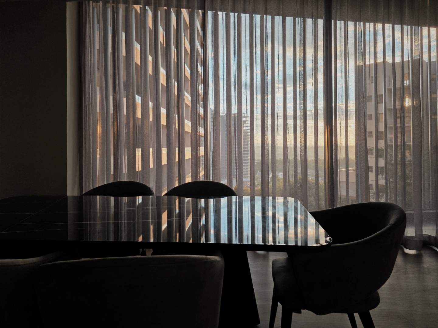 Designer Interiors: Sold fully furnished, the residence features a sophisticated palette—white glossy kitchen, charcoal dining table, plush velvet seating, and ethereal floor-to-ceiling drapery.