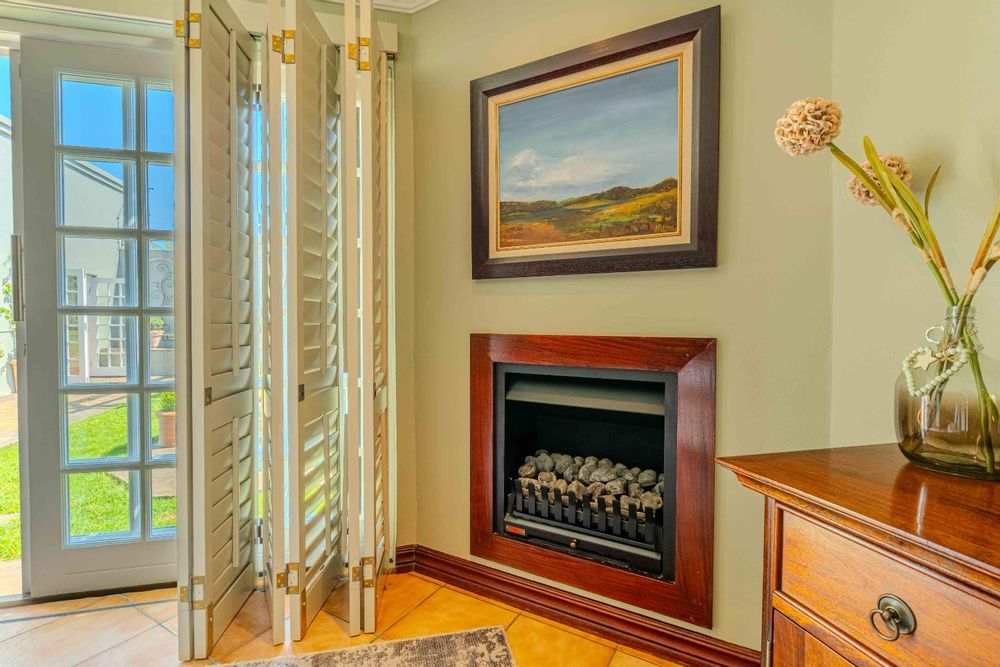The heart of the home lies in the gorgeous green kitchen equipped with shaker style cabinets, integrated Liebherr fridge freezer, and chef-worthy Ceasar stone countertops. The low-maintenance garden beckons with a sparkling pool featuring a water feature, a charming wooden gazebo, and Plaisir du Jardin pots adding a touch of nature's beauty. The main bedroom offers a cozy retreat with a gas fireplace, opening out onto the picturesque garden, complete with American shutters and Mahogany built-in cupboards.