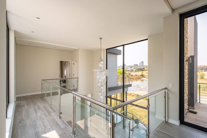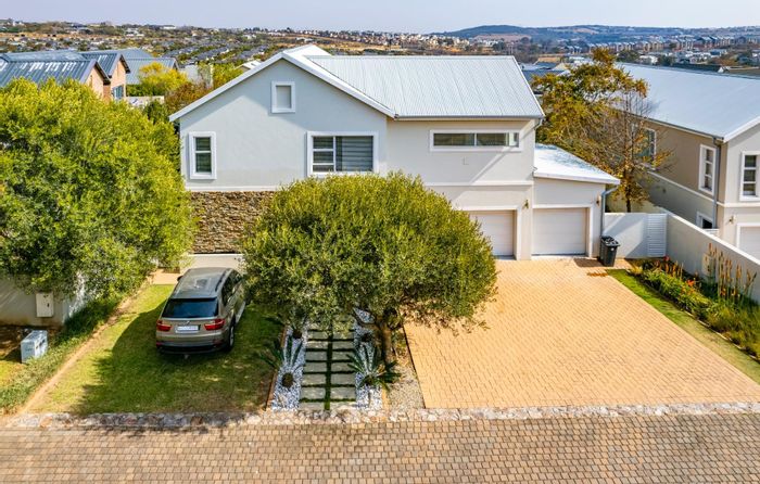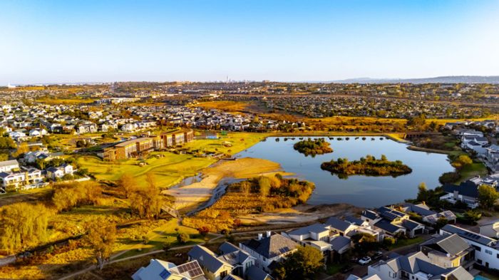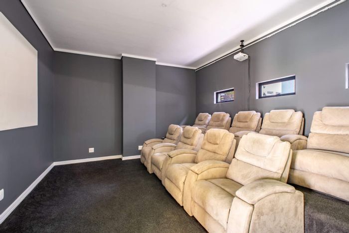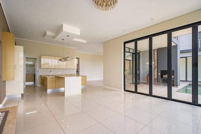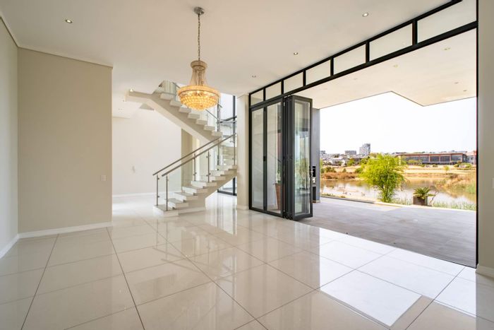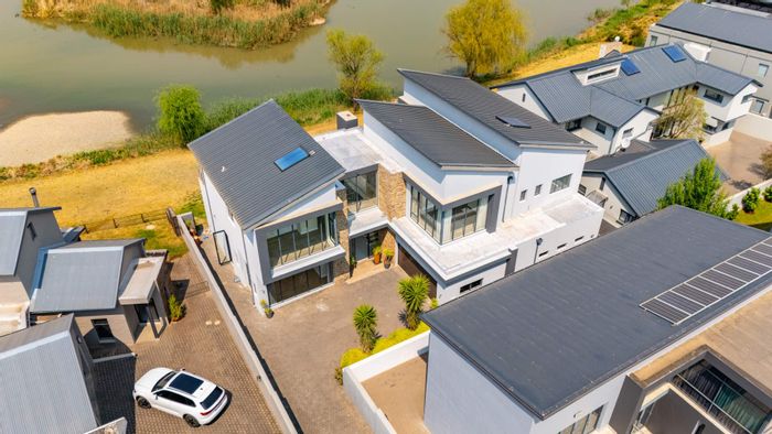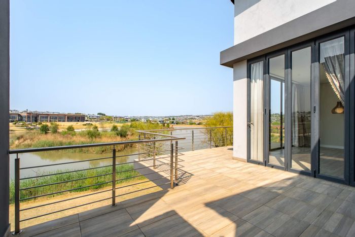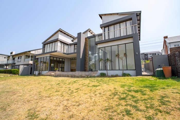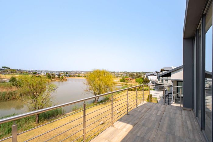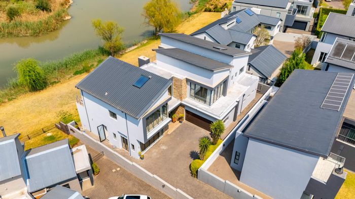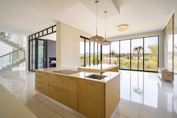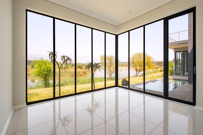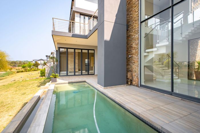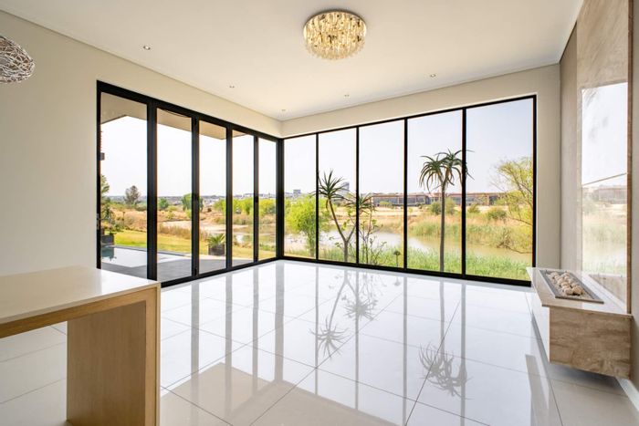 Dam-front entertainer in Waterfall Country Village Estate, steps from the clubhouse, with pool, covered braai patio, cinema room and premium kitchen. Five bedrooms, double garage.
