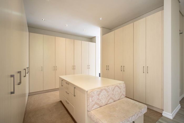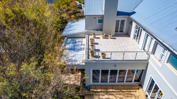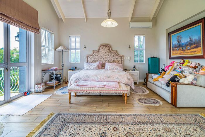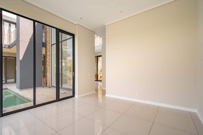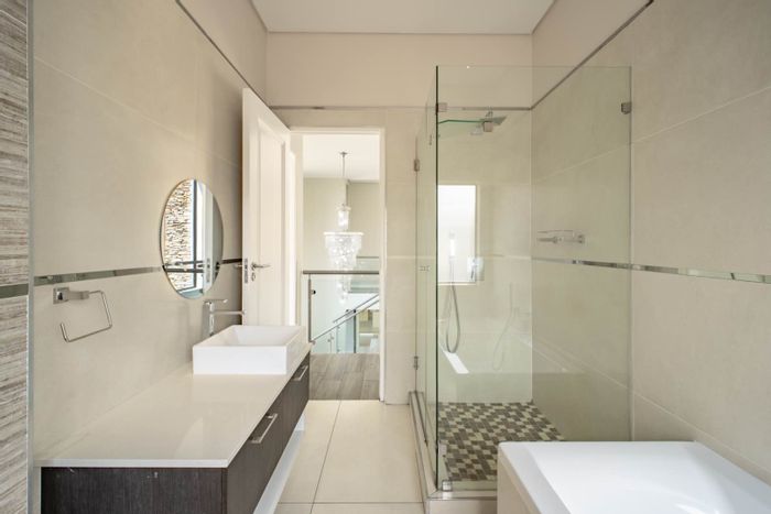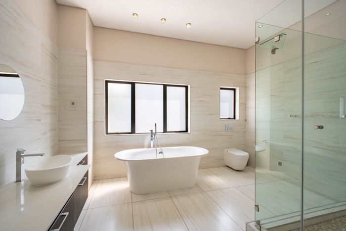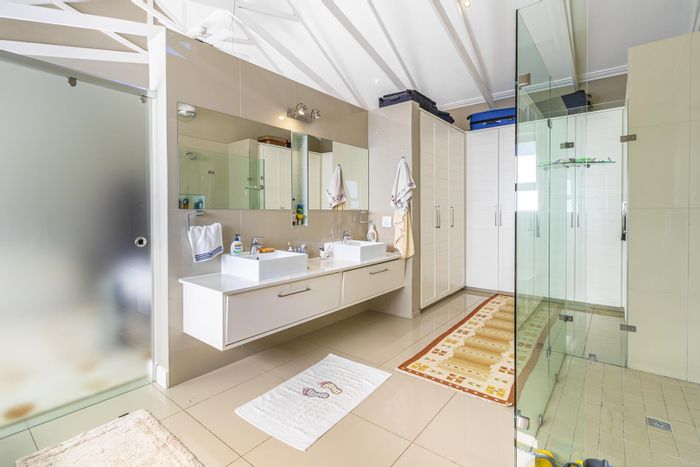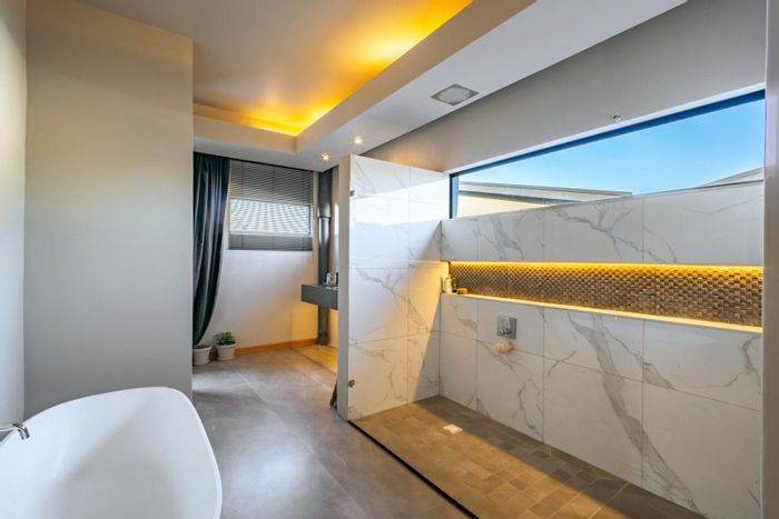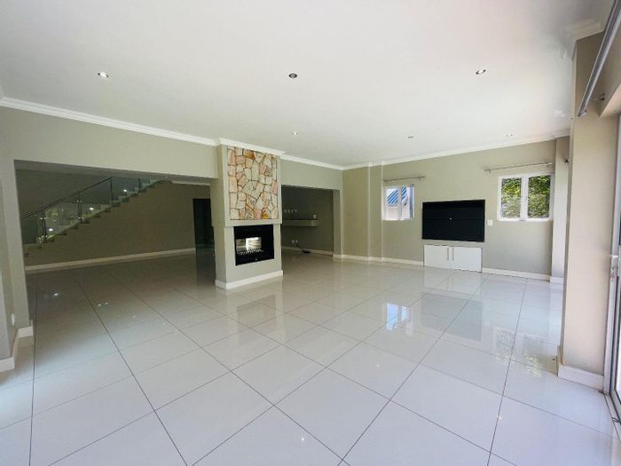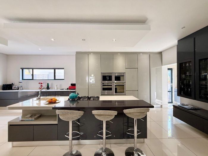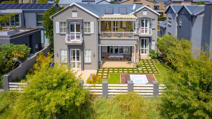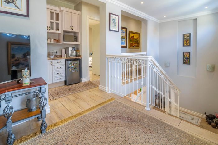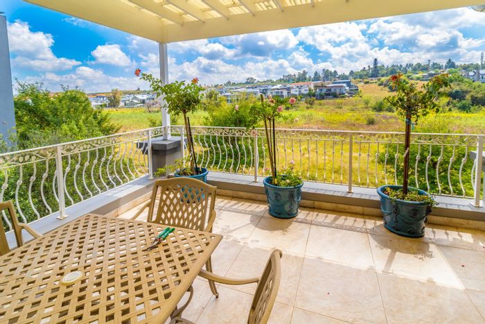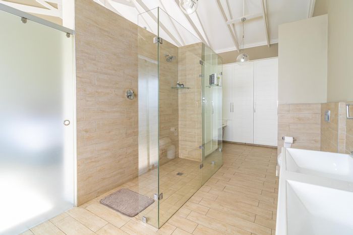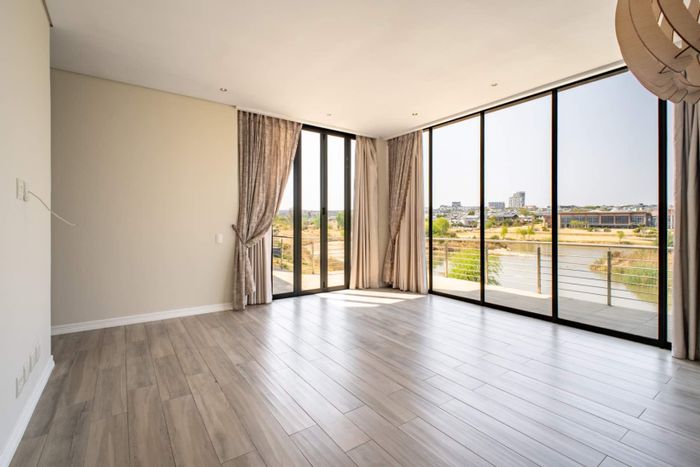 Dam-front entertainer in Waterfall Country Village Estate, steps from the clubhouse, with pool, covered braai patio, cinema room and premium kitchen. Five bedrooms, double garage.