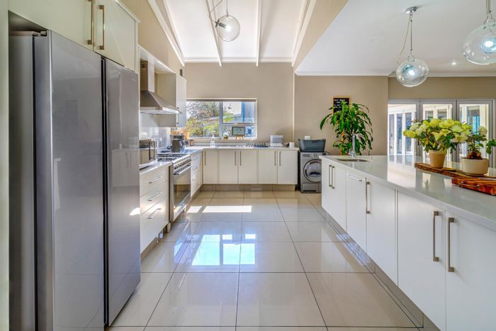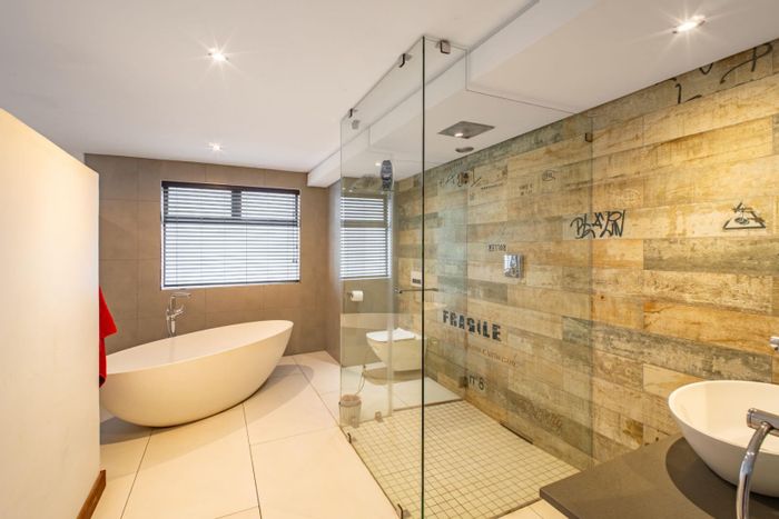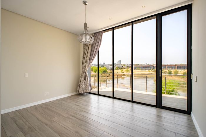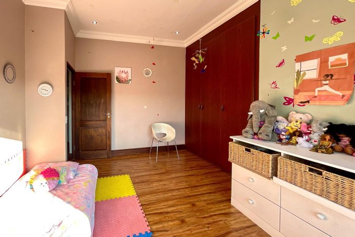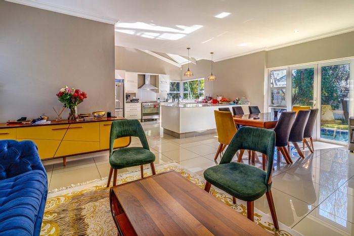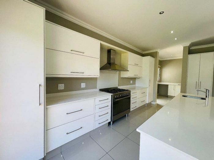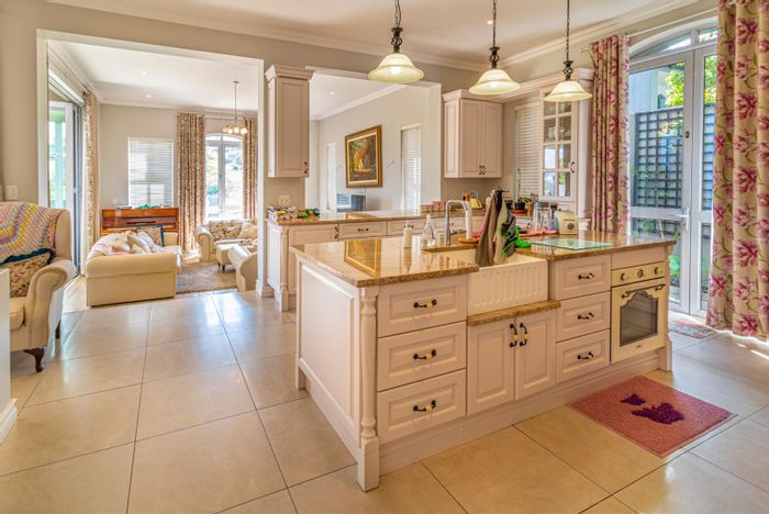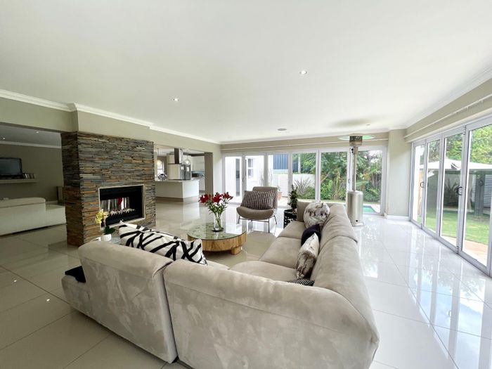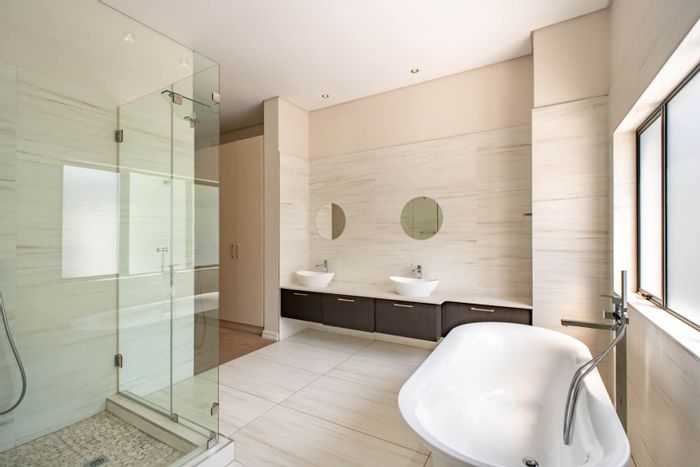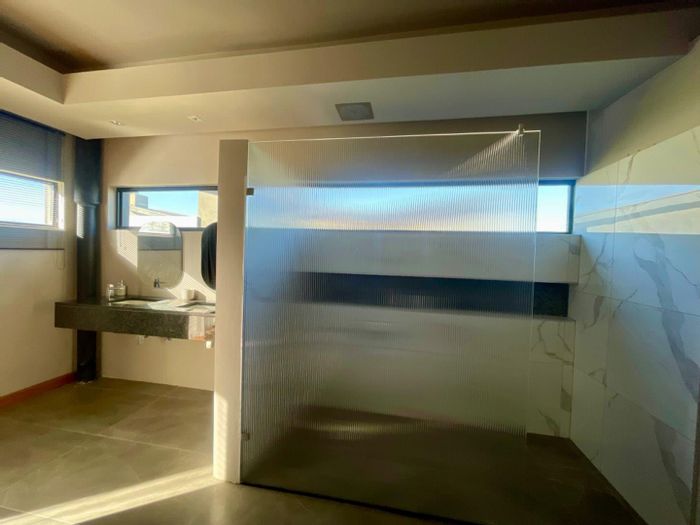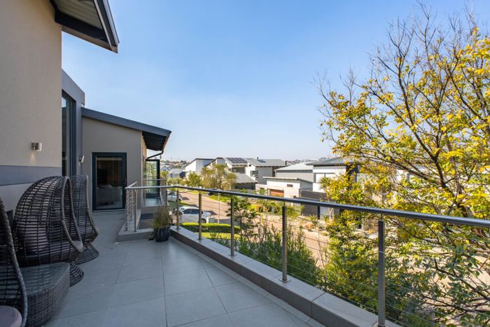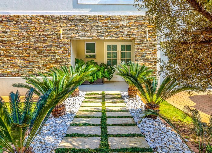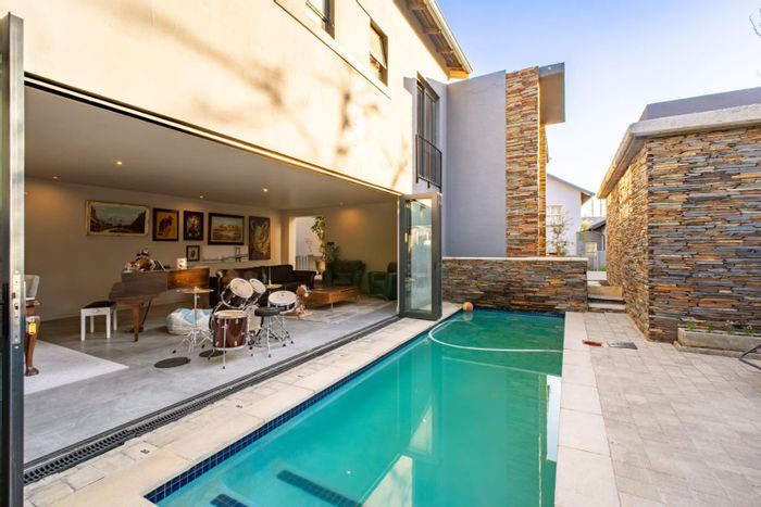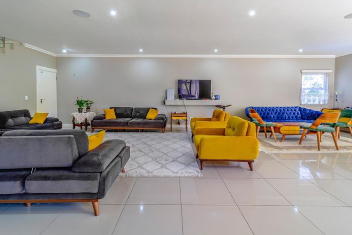 Dam-front entertainer in Waterfall Country Village Estate, steps from the clubhouse, with pool, covered braai patio, cinema room and premium kitchen. Five bedrooms, double garage.