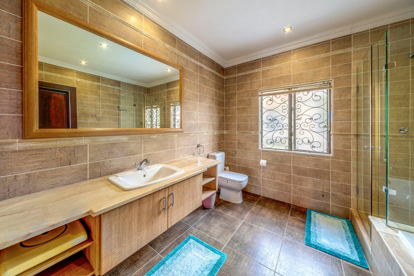 Upstairs, the beautifully crafted stairs lead to spacious bedrooms, each a haven of comfort and style. The en-suite bathrooms feature showers, basins, and toilets, along with ample wardrobe space.