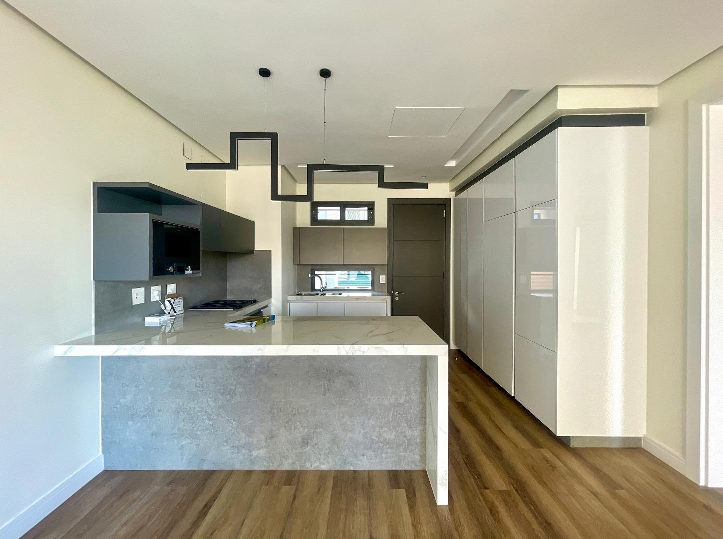 Modern kitchen, big countertop with space for bar stools.