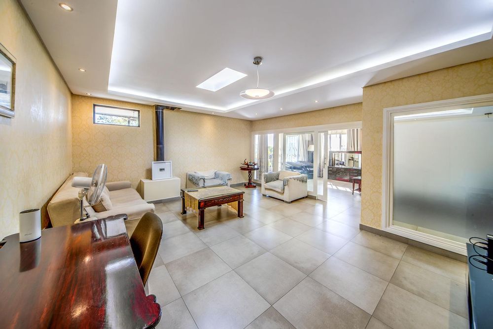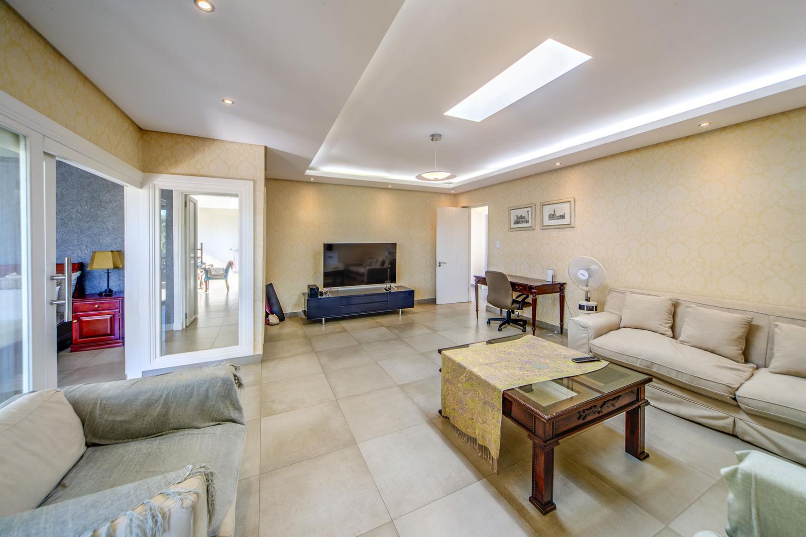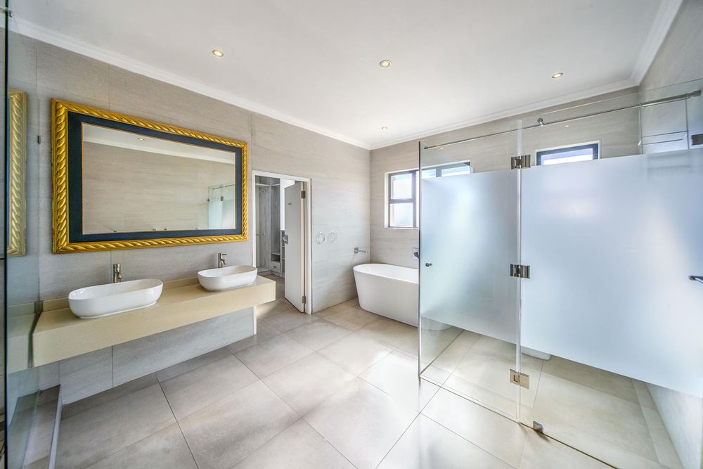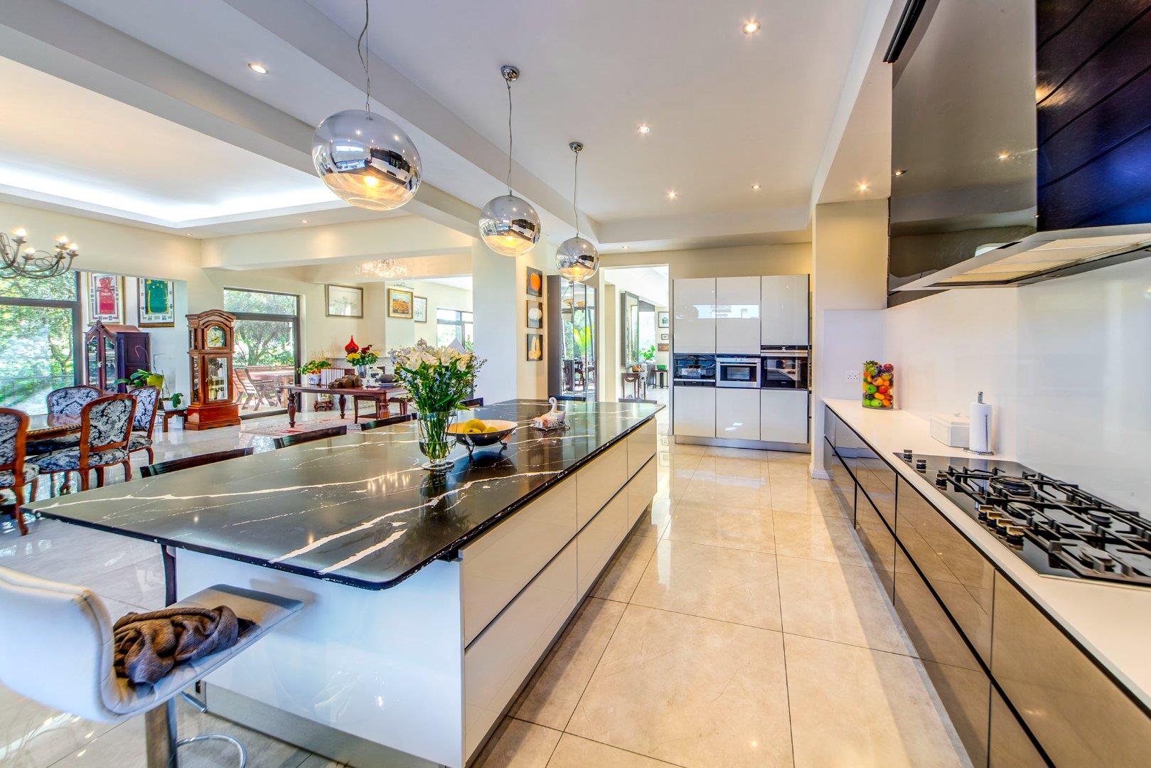 On the ground floor we enter through a grand entrance hall with triple volume ceilings leading into a spacious bar and entertainment area. Open plan dining and living areas with a stylish modern kitchen with integrated Siemens appliances boasting a sizeable dining island. Exquisite finishes accompanied by a storage room and space for a lift. Outdoor we have a large patio area with scenic views of the greenbelt. Guest room with bathroom situated downstairs. Ample lighting throughout the house.