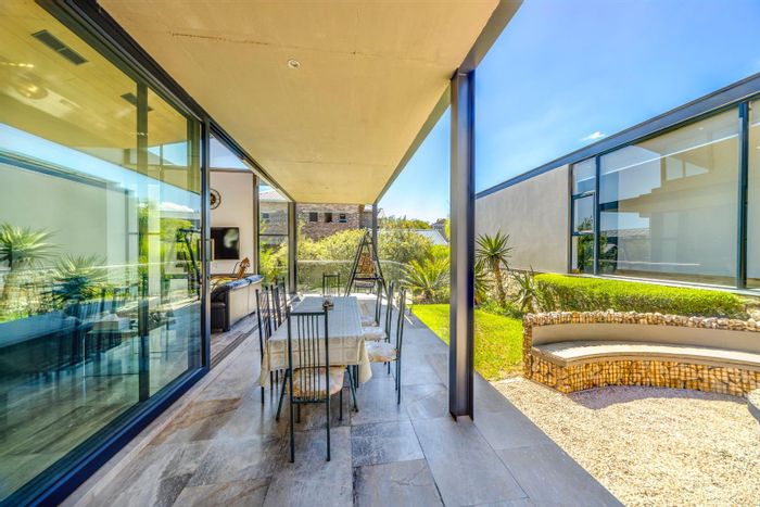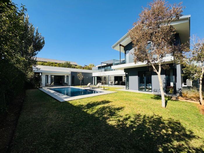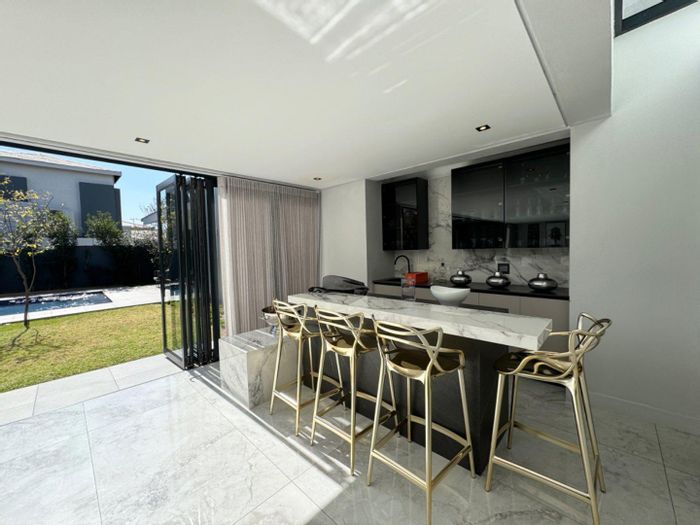 The entertainment space is lined with stack doors that open to reveal a generously sized garden and a delightful swimming pool, ideal for hosting outdoor gatherings.
