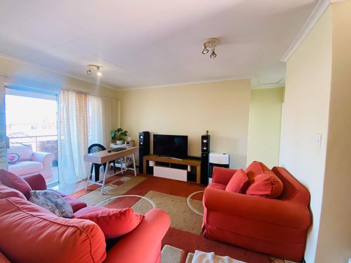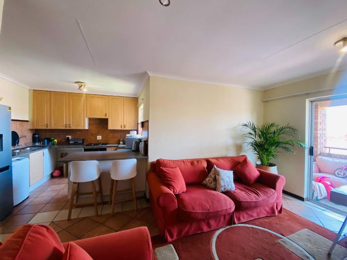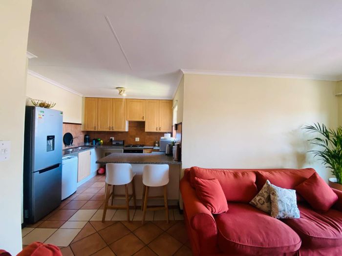 Secure Mooikloof Estate living with pool, tennis courts and leafy views — top-floor two-bedroom townhouse featuring a modern kitchen nook, full bath and double garage.
