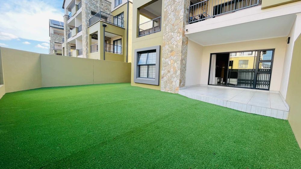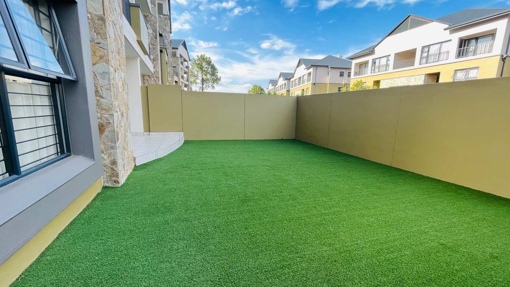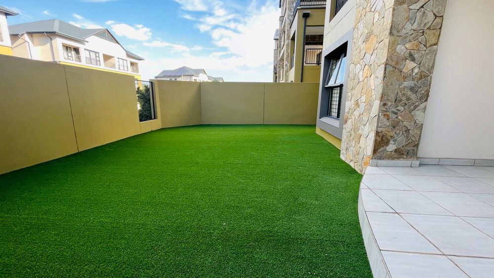 The apartment features an open-plan living area that seamlessly extends to an outdoor space, complete with low-maintenance Astroturf. This setup is perfect for entertaining guests or enjoying a quiet afternoon outdoors.