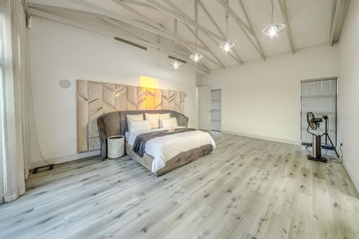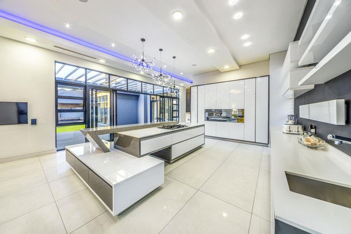 The heart of the home beats with elegance in the wine cellar, where your most treasured vintages await their moment. An enclosed bar area and formal lounge provide perfect settings for entertaining, while the open-plan kitchen boasts state-of-the-art AEG appliances, a separate scullery, and a gas fireplace that adds warmth to every meal. The dining room and TV lounge flow seamlessly from the kitchen, with stack doors opening to a covered patio. Here, a built-in braai and sink overlook the serene pool and boma area, inviting endless days of relaxation and entertainment under the African sky.