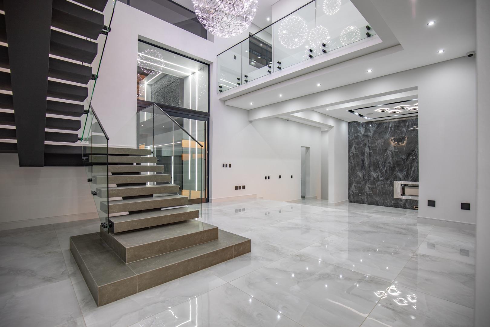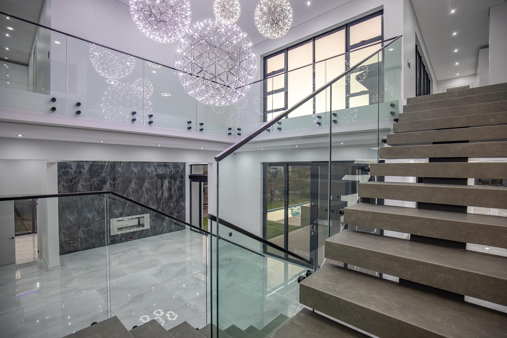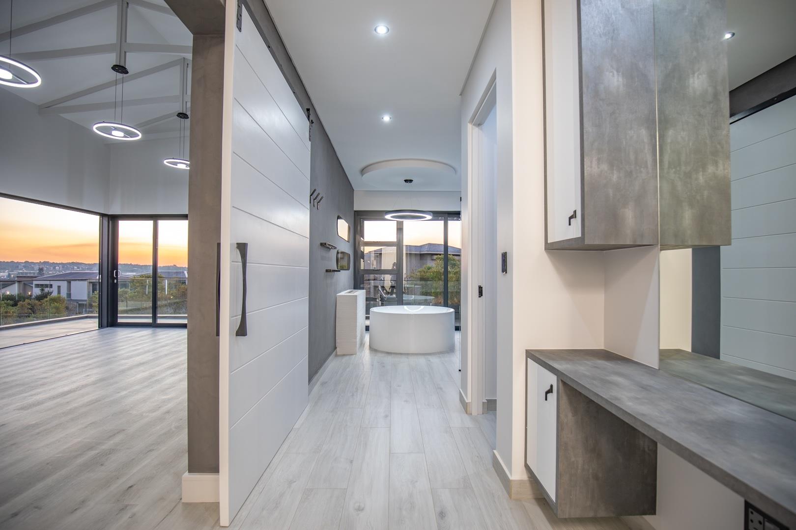 Functionality is prioritized with a borehole complete with storage tanks and a purification system supplying water for the entire house. A Control4 home automation system manages security, lighting, and entertainment, complemented by a state-of-the-art security setup with 12 Wi-Fi cameras and an alarm system. Backup power is ensured with 4.5kW solar panels and an 8kW inverter for peace of mind.