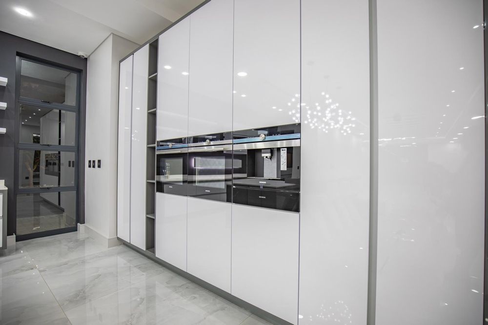 The open-plan kitchen is a true masterpiece, seamlessly blending style and functionality. It is equipped with integrated state-of-the-art appliances, including a coffee machine, microwave, steam oven, warming drawers, a pop-up extractor, and soft-close cabinetry. A secondary stove in the scullery further enhances practicality. This space flows effortlessly into the dining area, family room, and an additional lounge, culminating in an enclosed patio fitted with a built-in gas braai and its own extractor—perfect for entertaining guests in comfort and style.
