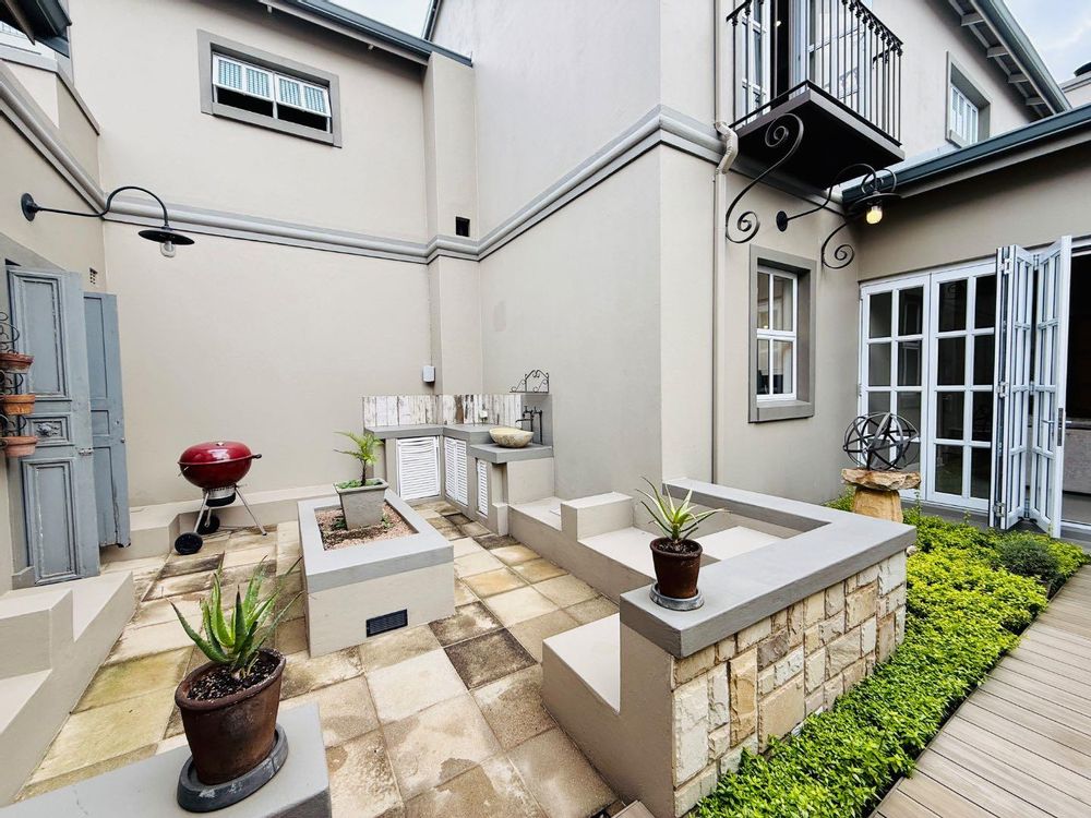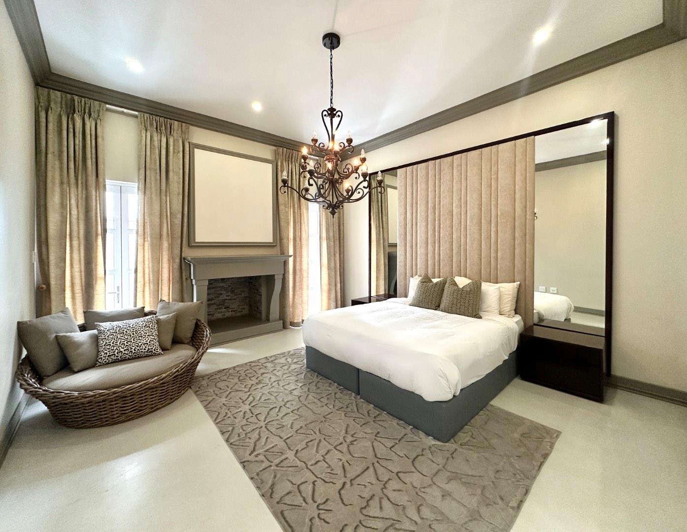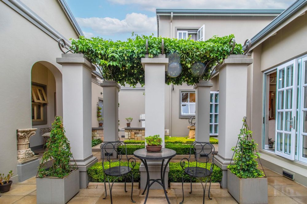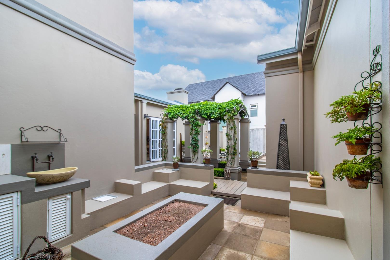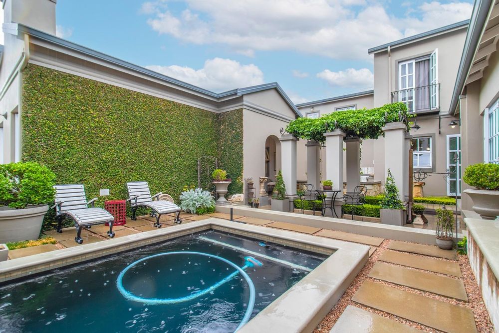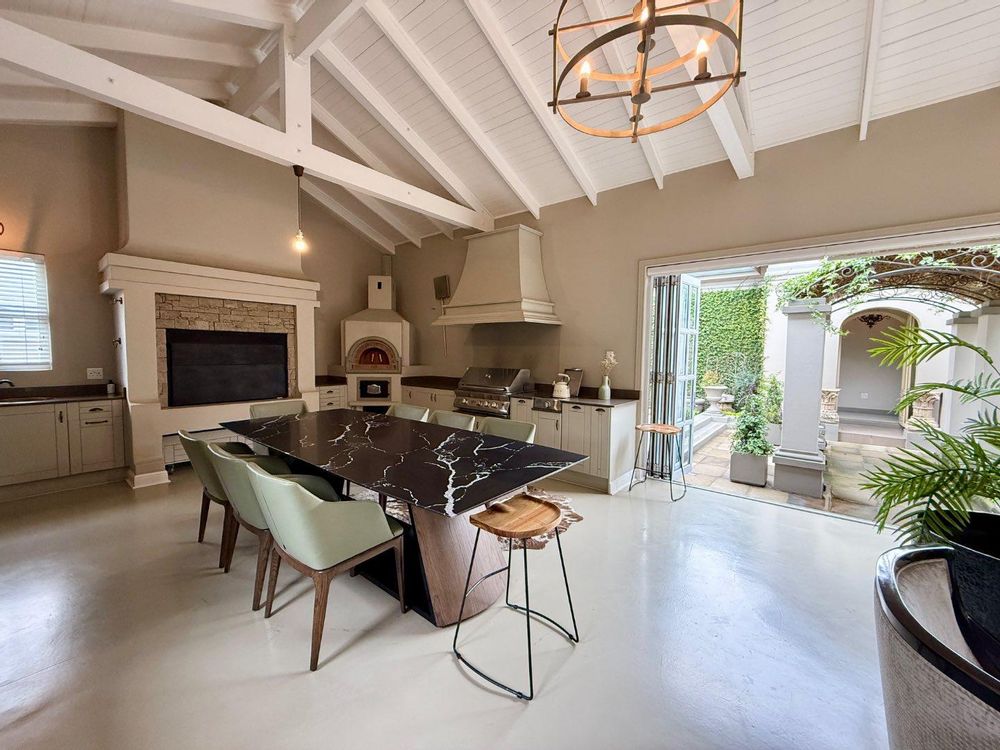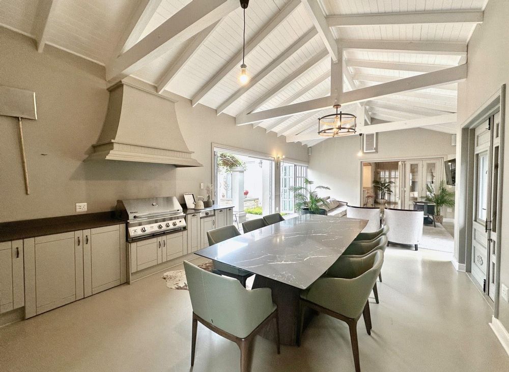 The entertainment side of the house boasts a spacious lounge, with a closed combustion fireplace, that flows seamlessly into an indoor braai room. Equipped with a wood-burning fireplace, gas braai and pizza oven, gas hob, and water point connection for your coffee or ice machine, this comfortable space is perfect for hosting social gatherings of note. The heated swimming pool, with its understated design and black interior, is the perfect place to relax, and the separate guest suite offers a serene and opulent retreat for your guests. The staff quarters, which can also serve as a gym, are fitted with an ensuite shower and overhead fan.
