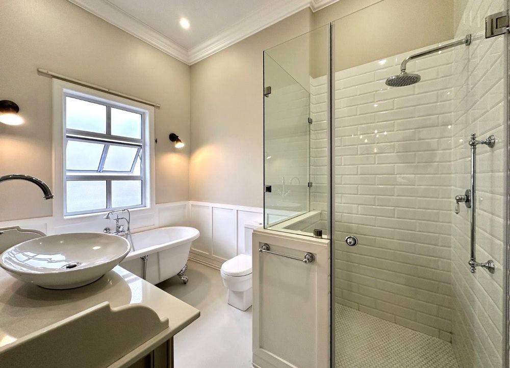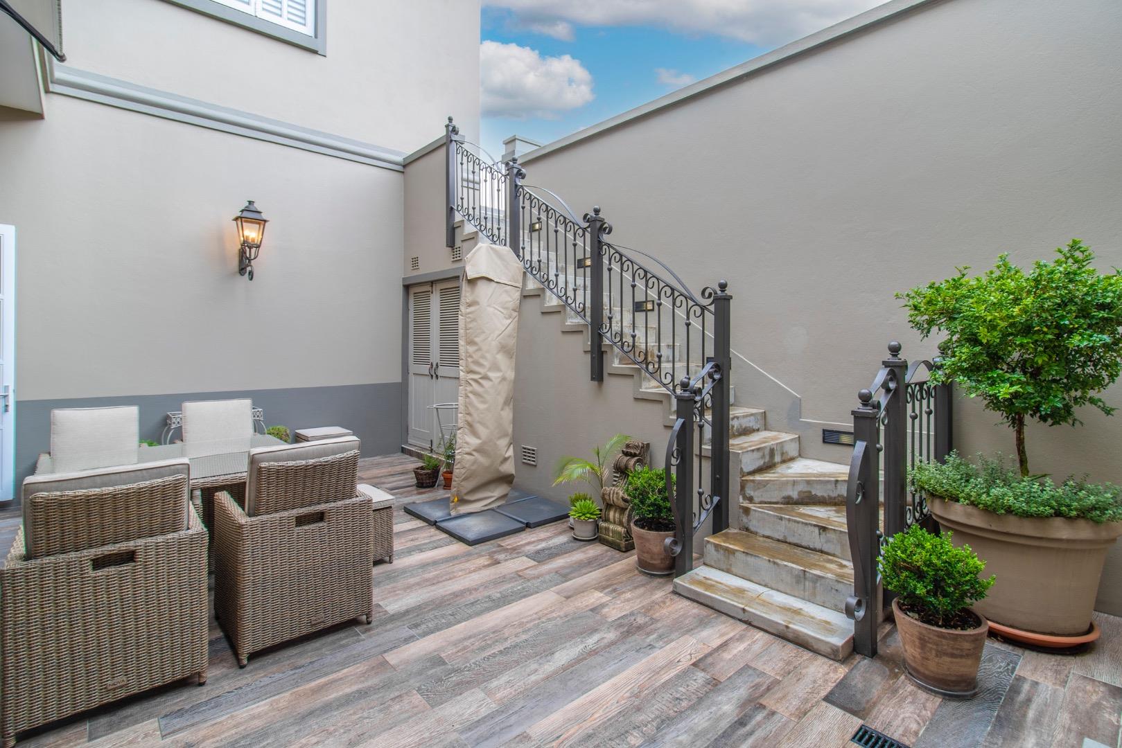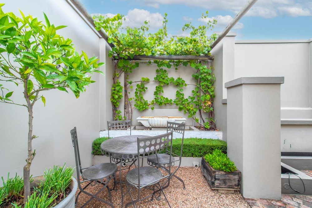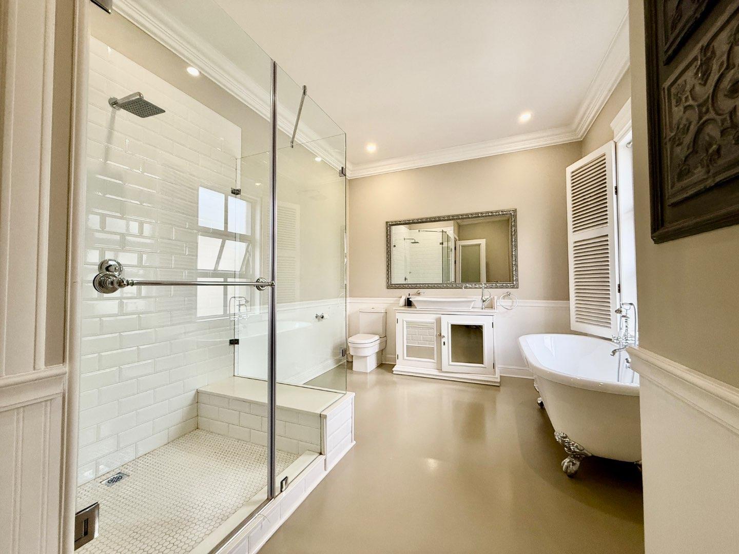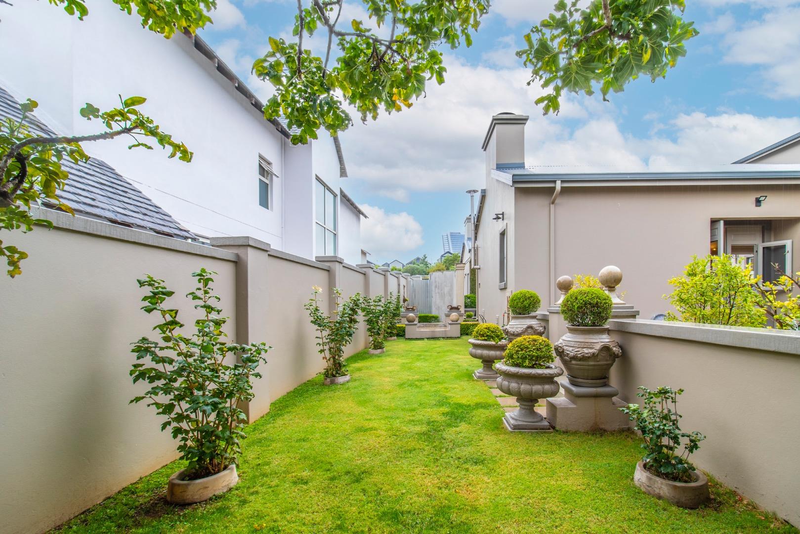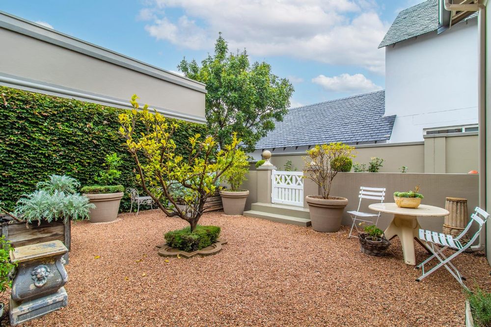 The entertainment side of the house boasts a spacious lounge, with a closed combustion fireplace, that flows seamlessly into an indoor braai room. Equipped with a wood-burning fireplace, gas braai and pizza oven, gas hob, and water point connection for your coffee or ice machine, this comfortable space is perfect for hosting social gatherings of note. The heated swimming pool, with its understated design and black interior, is the perfect place to relax, and the separate guest suite offers a serene and opulent retreat for your guests. The staff quarters, which can also serve as a gym, are fitted with an ensuite shower and overhead fan.