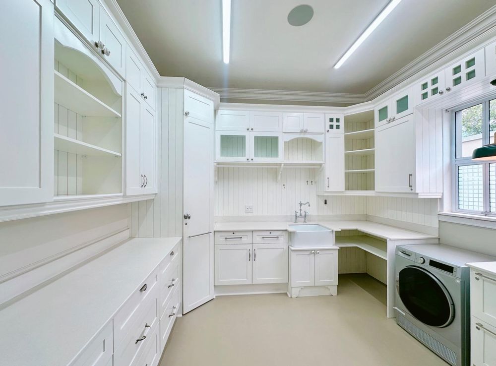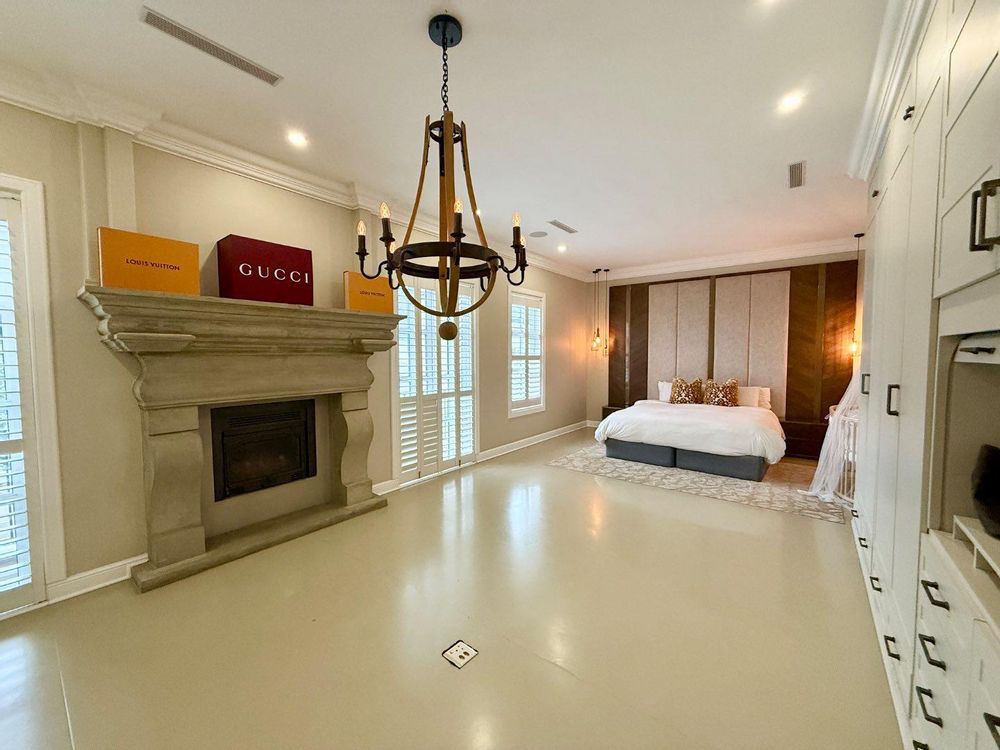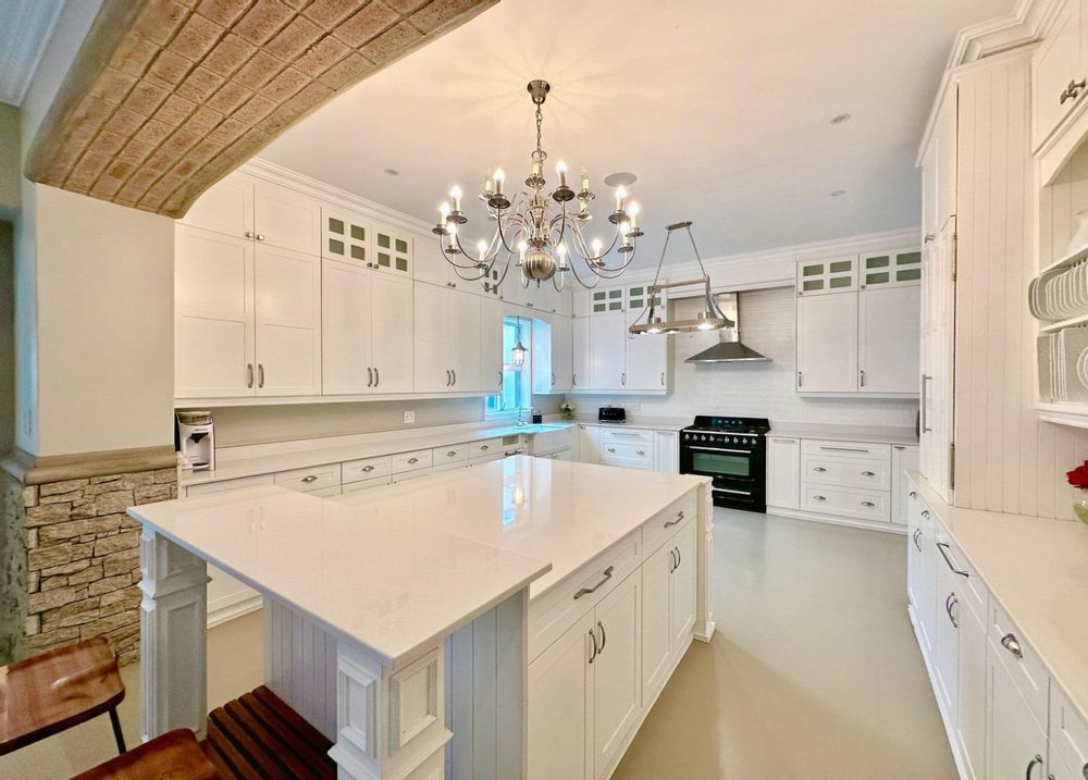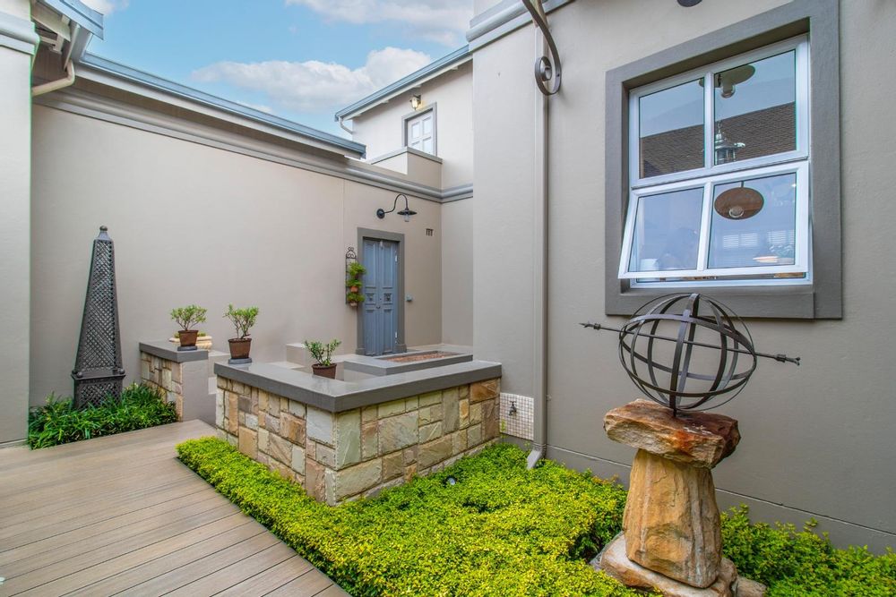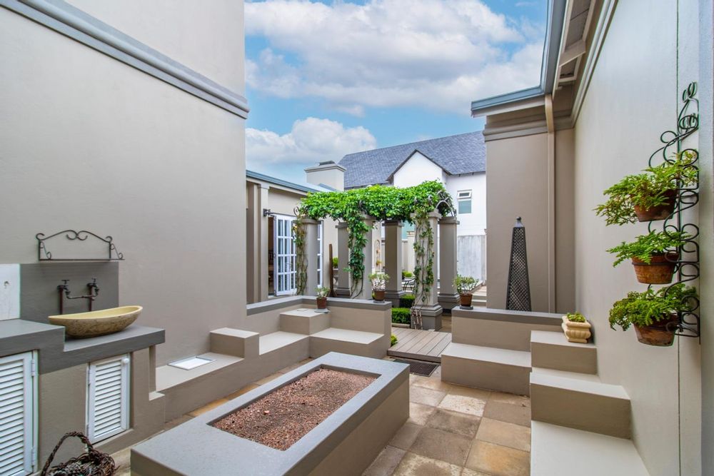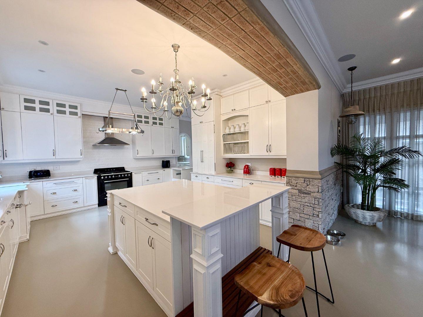 The open plan kitchen and lounge are the epitome of luxury, with the closed combustion fireplace within a dramatic concrete mantle taking center stage. The kitchen, with its sleek white cabinetry and stone countertops, is anchored by an imposing central island and black gas-electric cooker. You'll find a charming coffee station cleverly concealed in a cupboard, as well as a cozy breakfast nook and well-organized walk-in pantry. The scullery and laundry, each in their own room, are flooded with natural light and boast built-in cupboards, offering ample storage space.