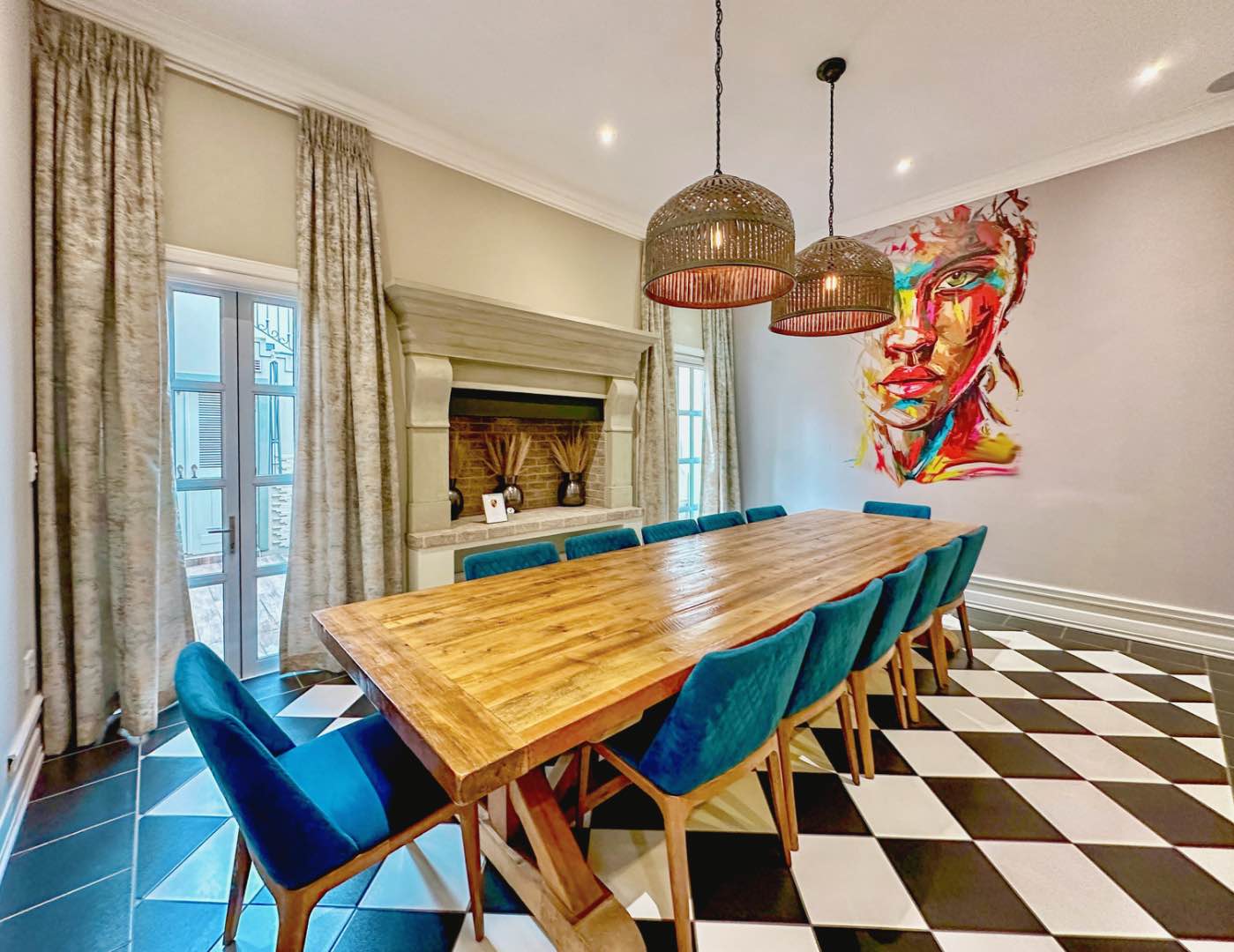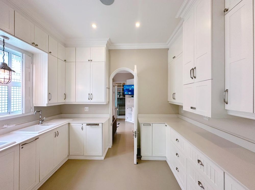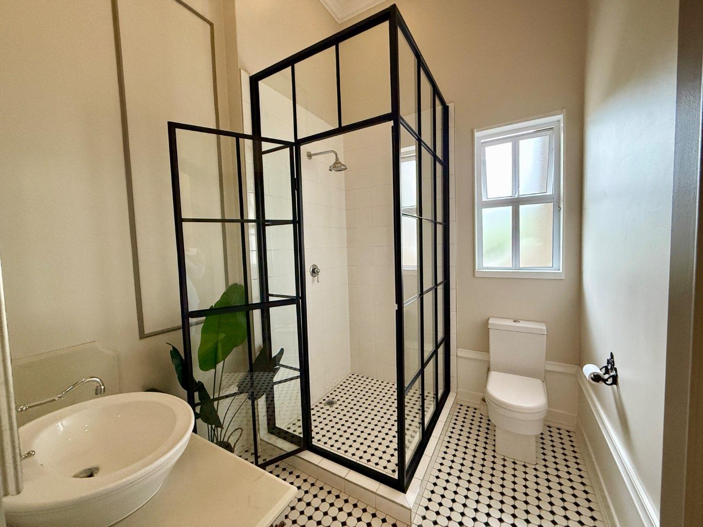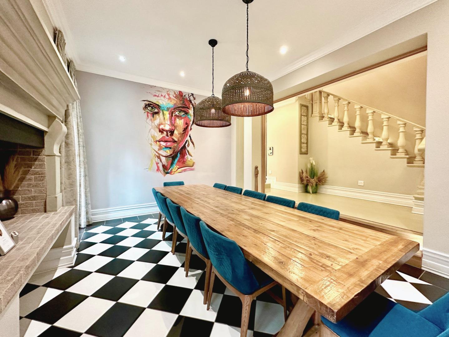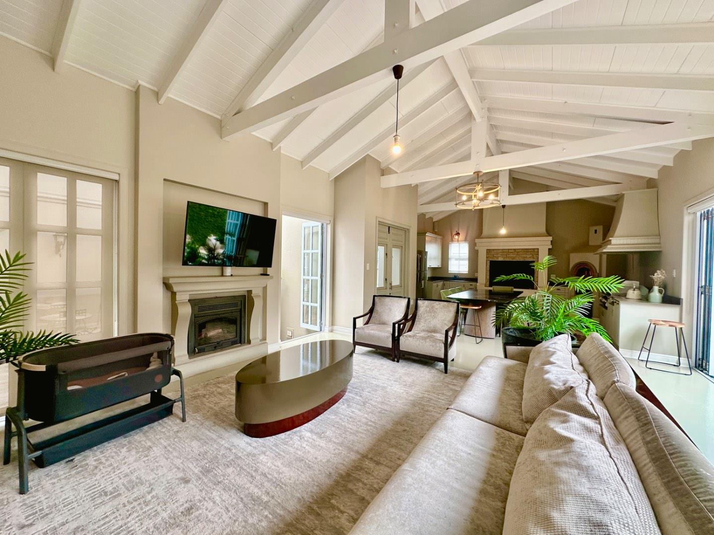 The open plan kitchen and lounge are the epitome of luxury, with the closed combustion fireplace within a dramatic concrete mantle taking center stage. The kitchen, with its sleek white cabinetry and stone countertops, is anchored by an imposing central island and black gas-electric cooker. You'll find a charming coffee station cleverly concealed in a cupboard, as well as a cozy breakfast nook and well-organized walk-in pantry. The scullery and laundry, each in their own room, are flooded with natural light and boast built-in cupboards, offering ample storage space.