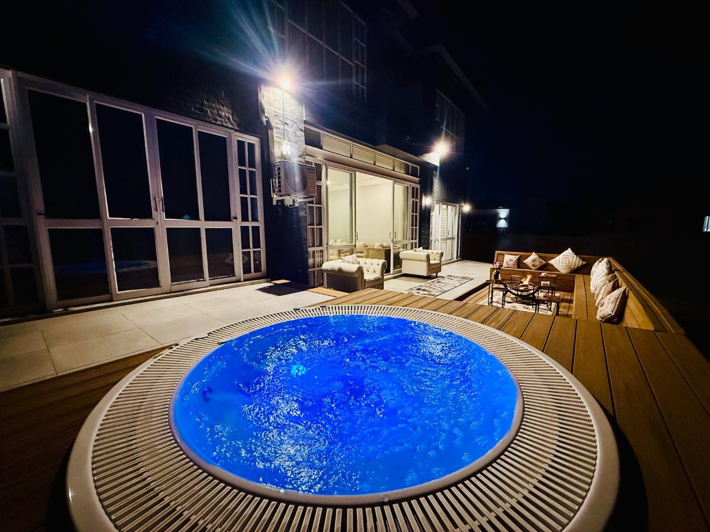 The ground floor includes a guest bedroom with an en suite with a shower, a separate guest toilet, and handy storage under the staircase. The back entertainment area is a standout feature, offering a jacuzzi, fire pit, and built-in seating, perfect for entertaining or relaxing. The front garden is truly impressive, one of the largest in the estate, offering vast open space and incredible potential for further development or landscaping.