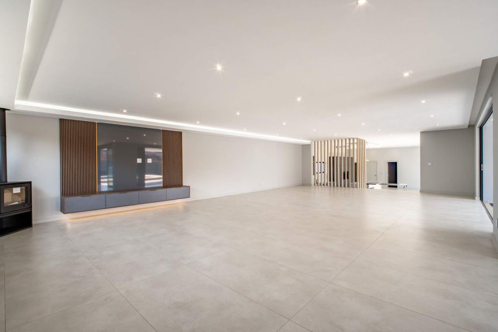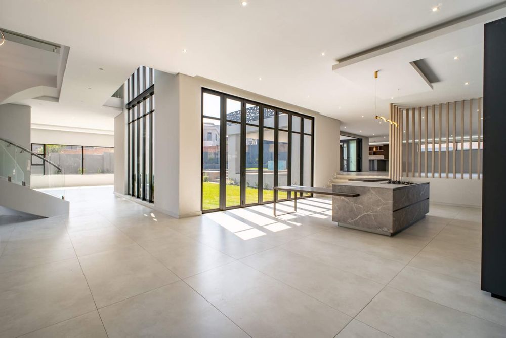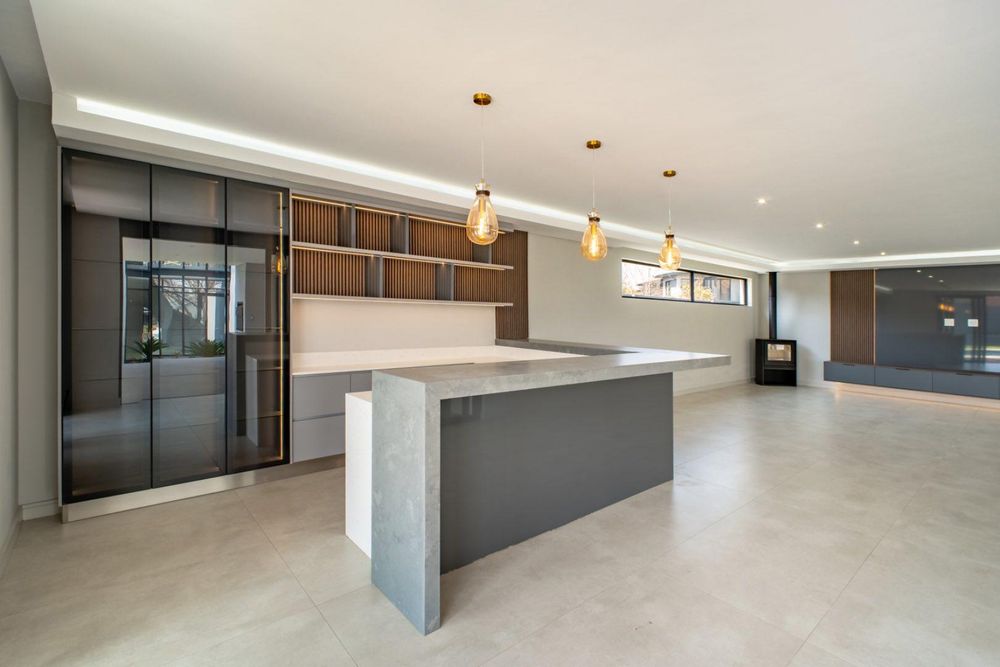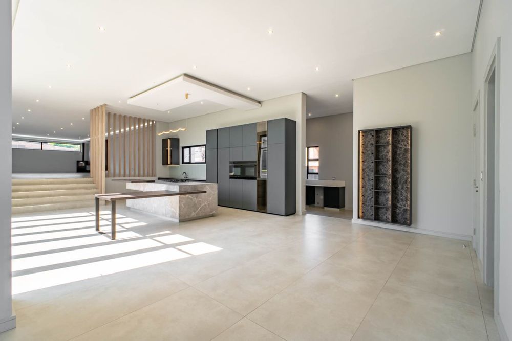 To the right of the entrance, the home opens into a magnificent living and entertainment space anchored by a designer open-plan kitchen, complete with a separate scullery and pantry, Siemens appliances, and a gas stove. This culinary haven flows effortlessly into the dining and entertainment areas, where a formal lounge, TV lounge, and bespoke bar create the perfect setting for both intimate family moments and lavish gatherings. A private cinema room adds to the exclusivity, offering a retreat for movie nights at home.