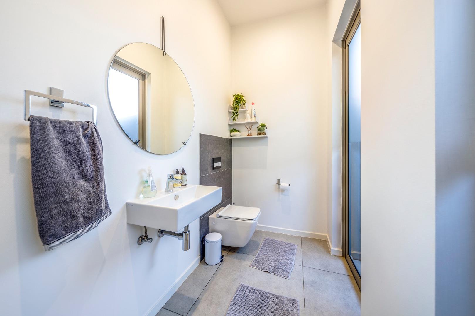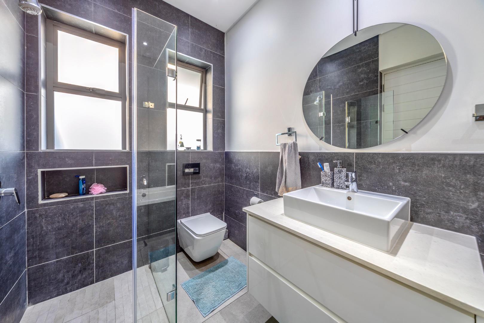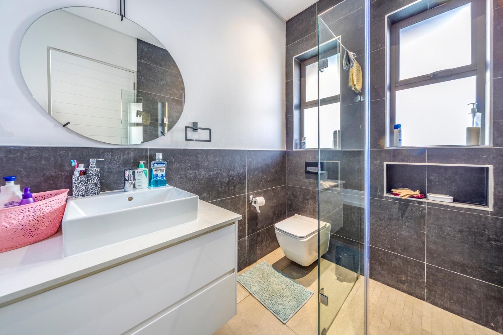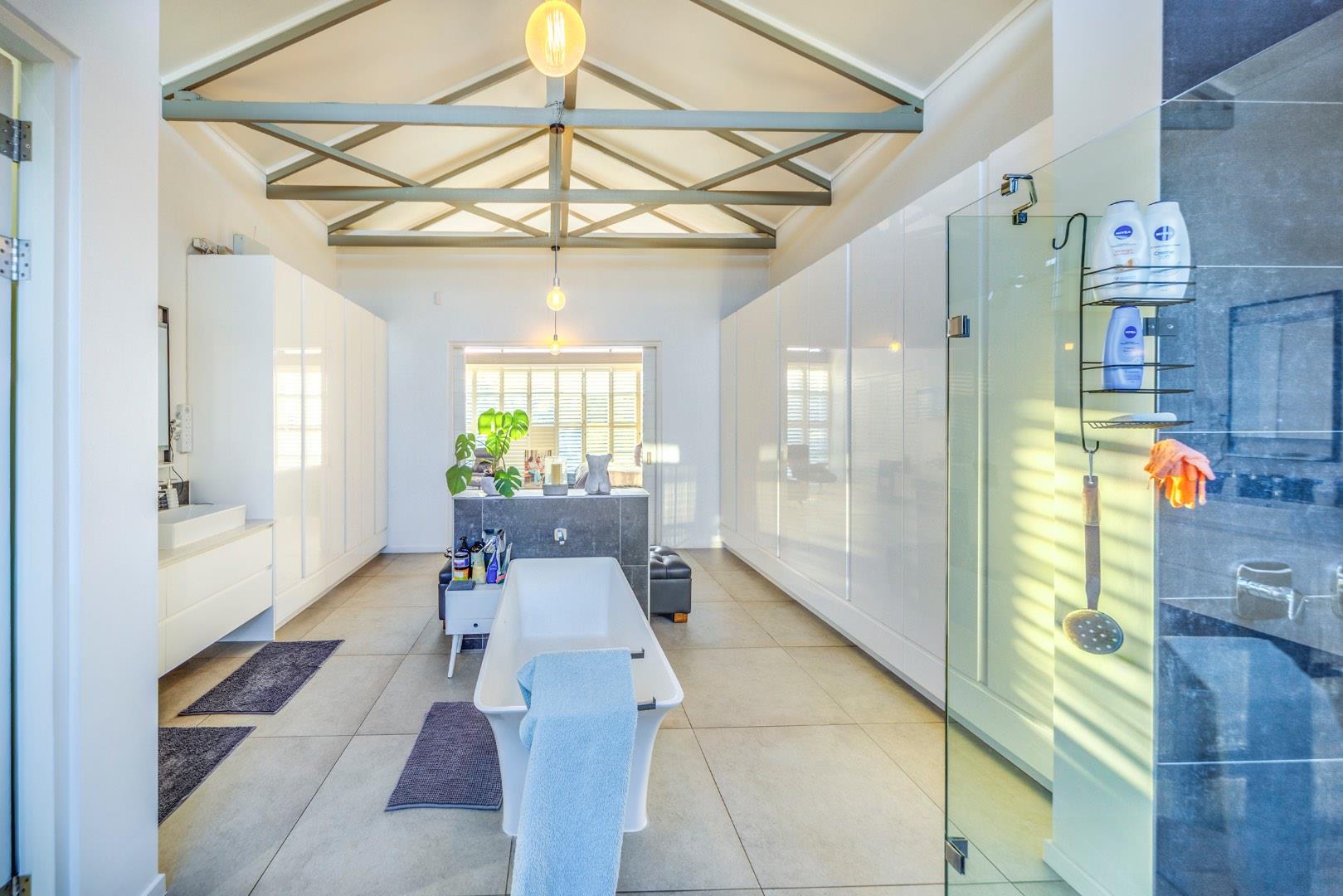 The ground floor also boasts a TV lounge that can be closed off with pocket doors for added privacy. Stack doors open up to a covered patio, creating a seamless indoor-outdoor living experience. The patio features a heated pool, seating area, and a built-in braai, making it perfect for entertaining guests. A conveniently located guest toilet completes the ground floor amenities.