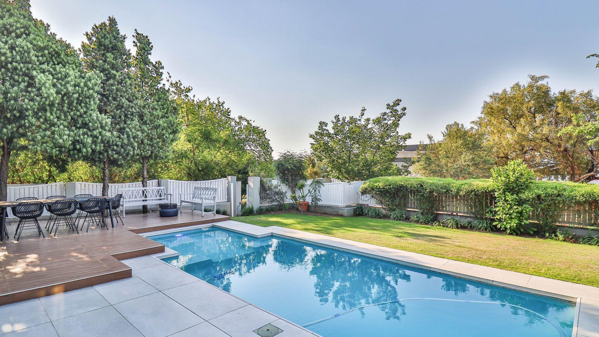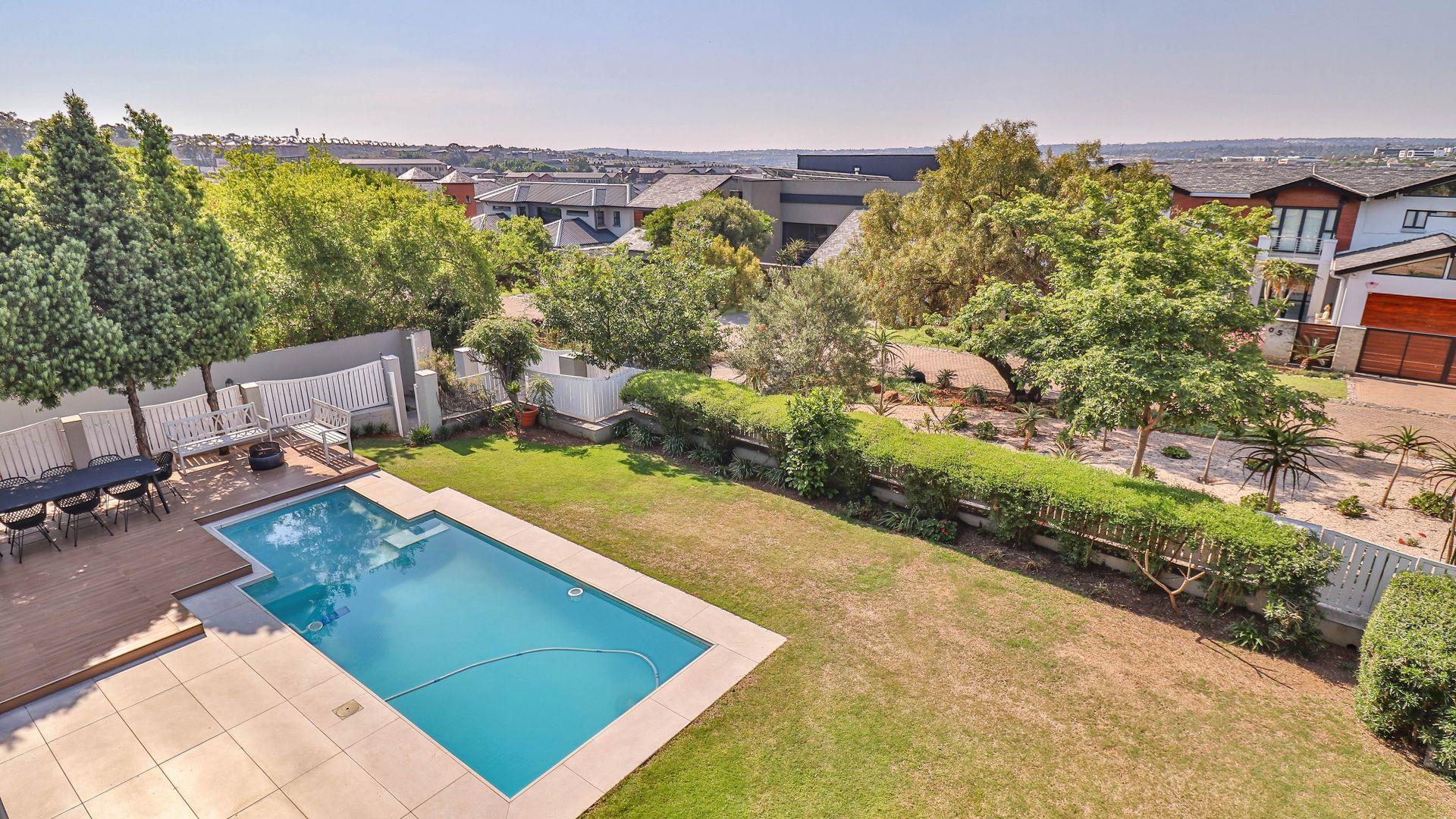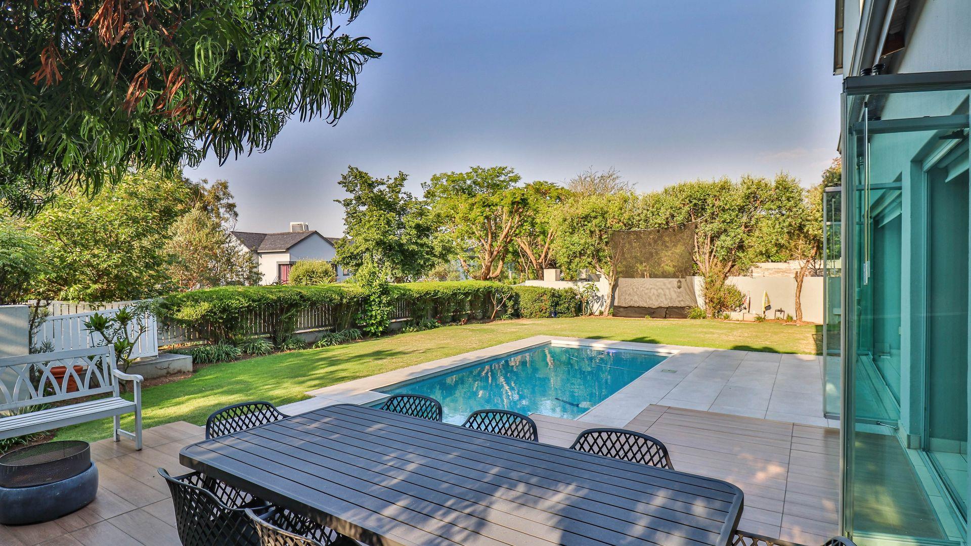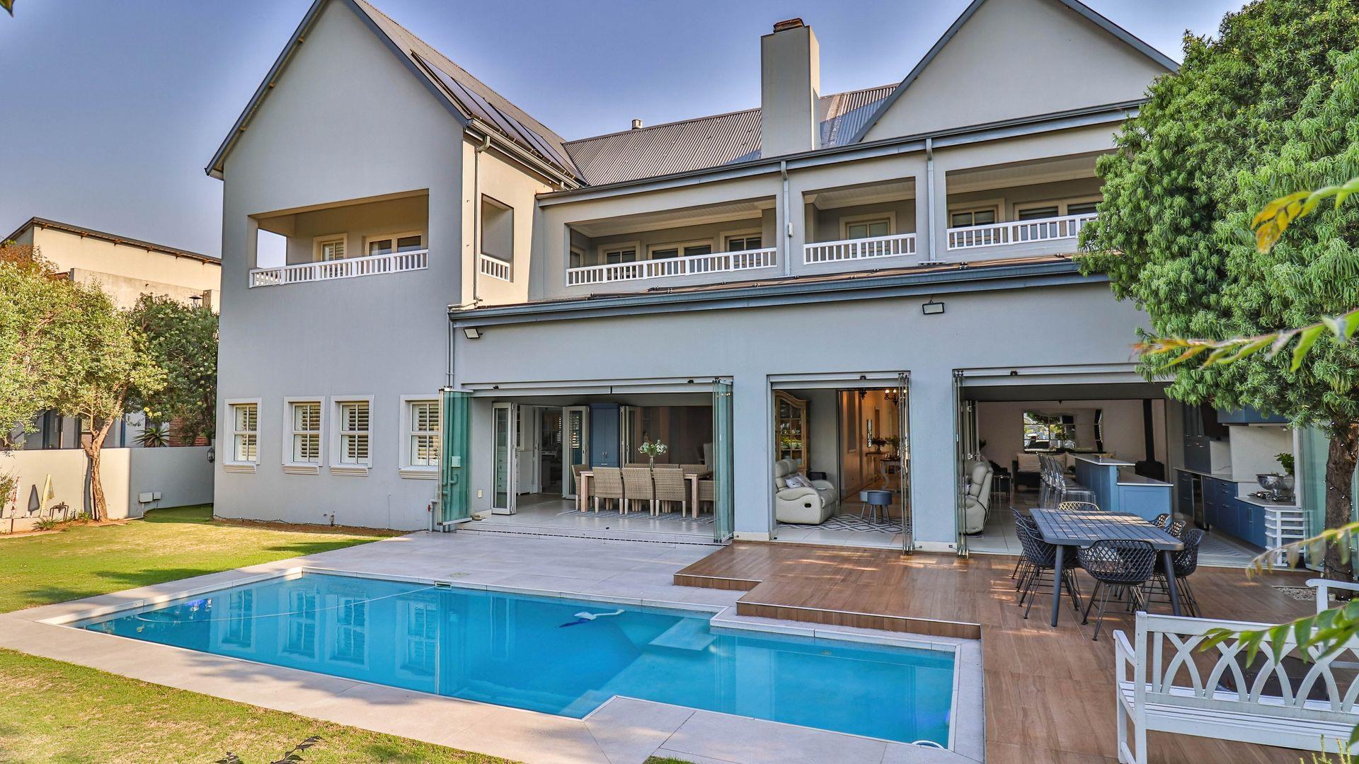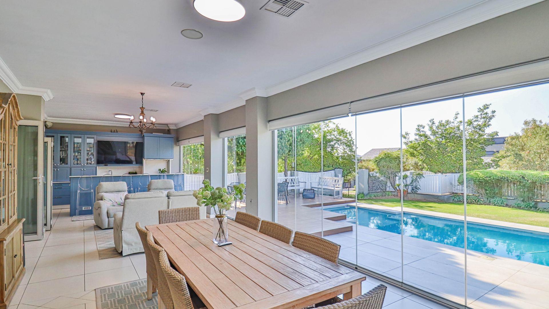 The expansive ground floor is perfectly suited to entertaining, with generous living, bar, and entertainment spaces opening seamlessly through stacking glass doors onto the landscaped garden, sun deck, and private heated swimming pool. This effortless indoor-outdoor flow allows for year-round enjoyment of the Highveld climate in a setting designed for both relaxation and hosting.