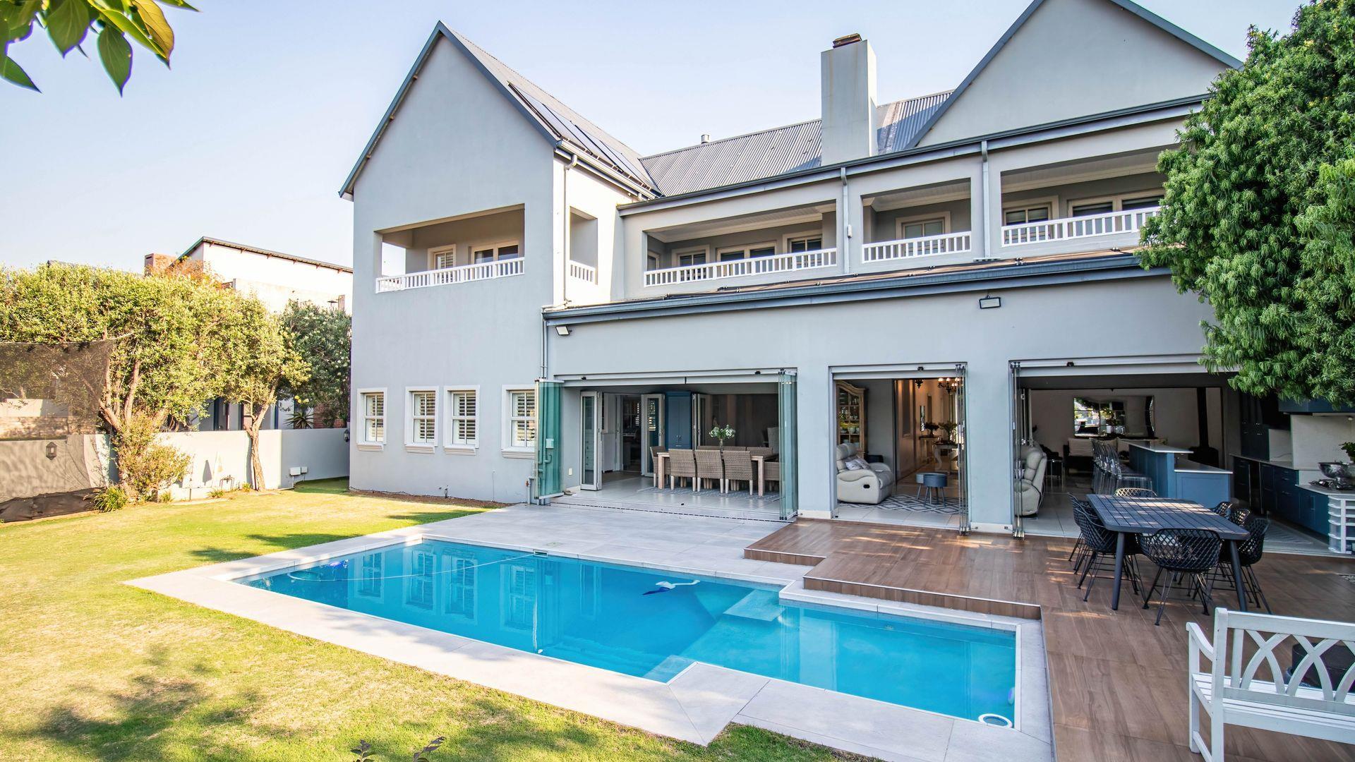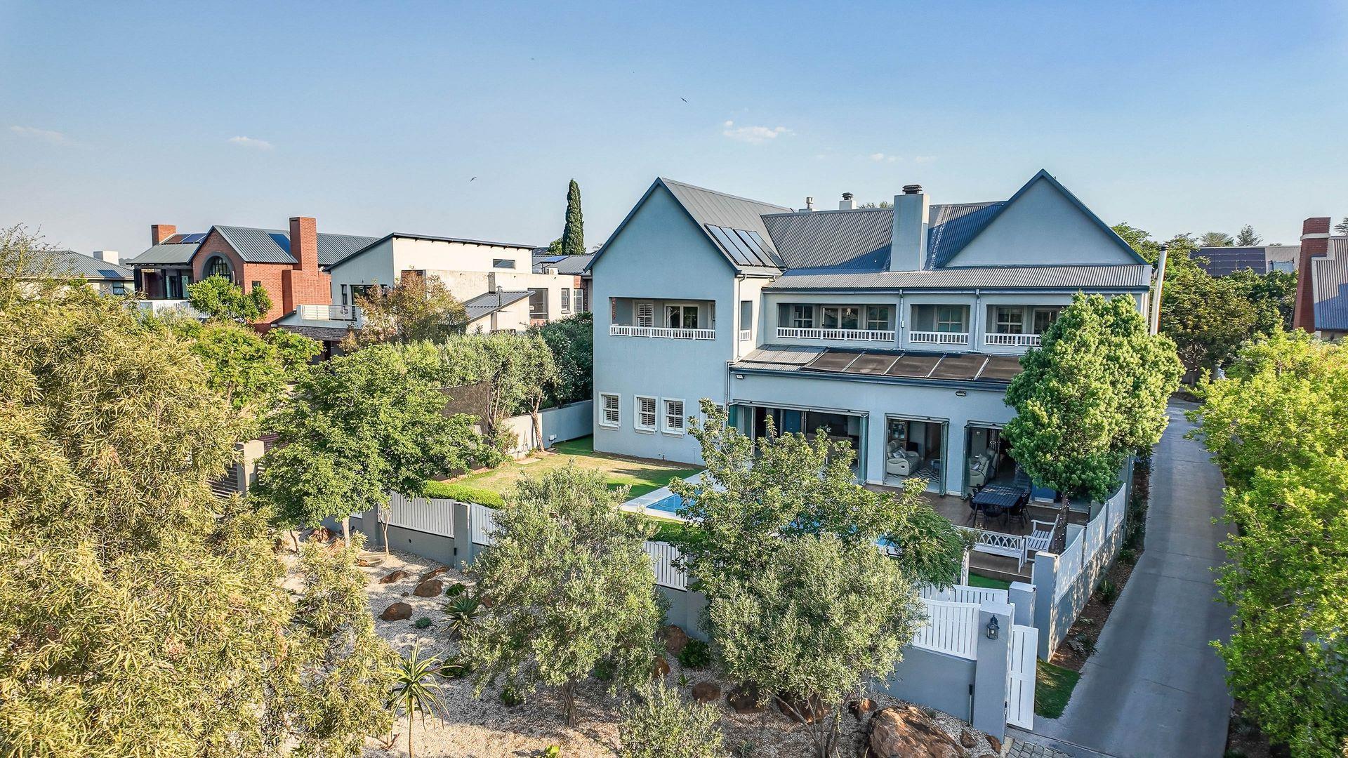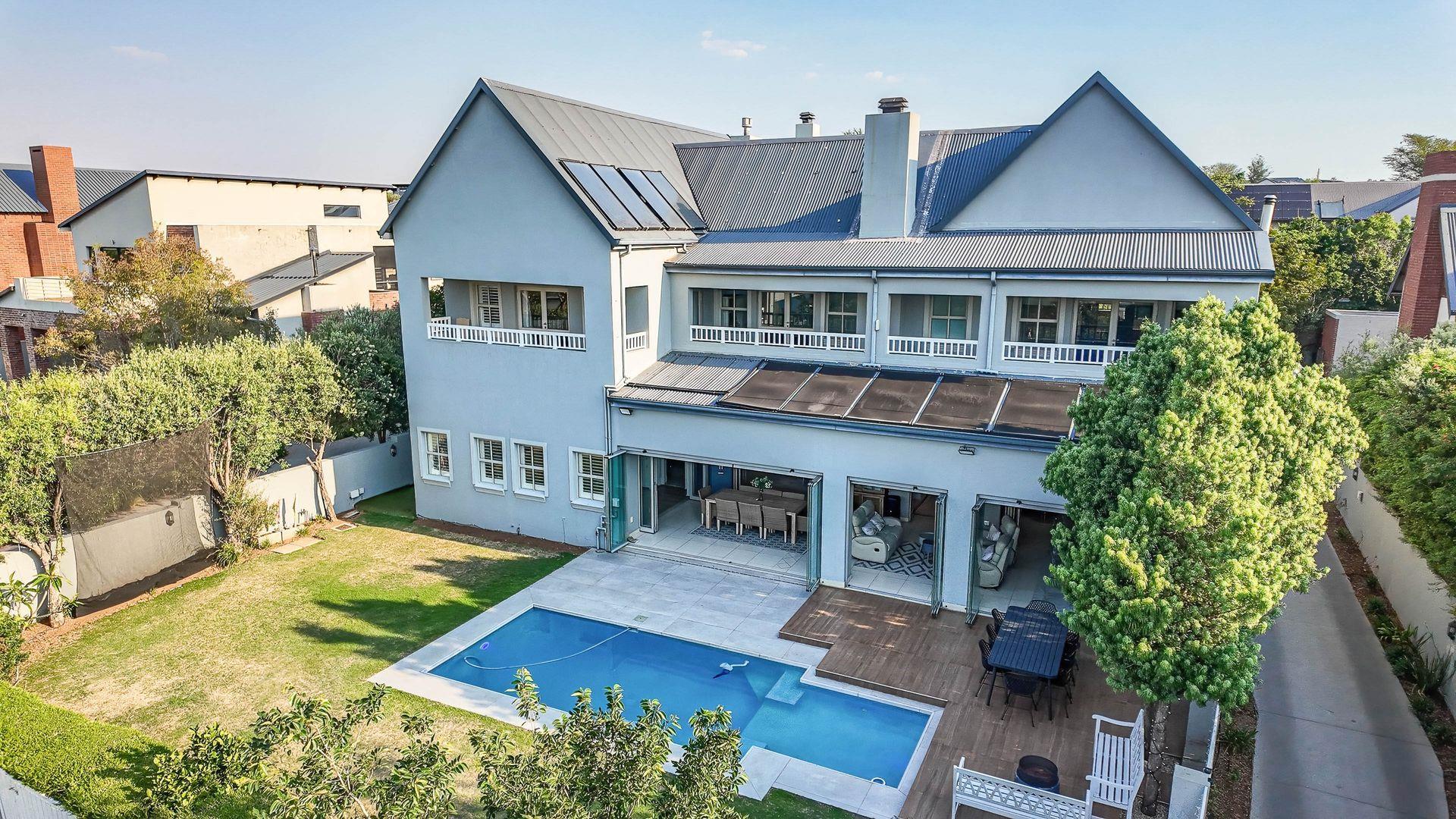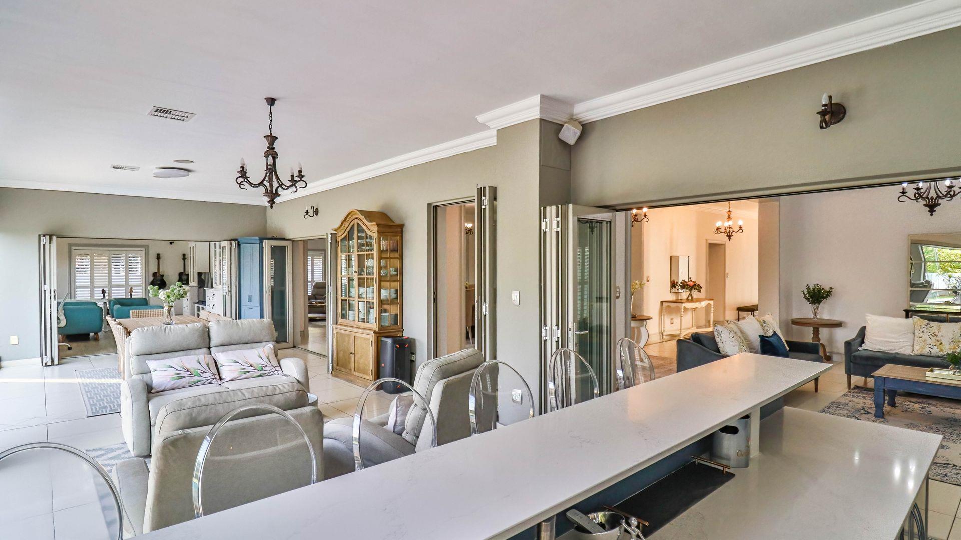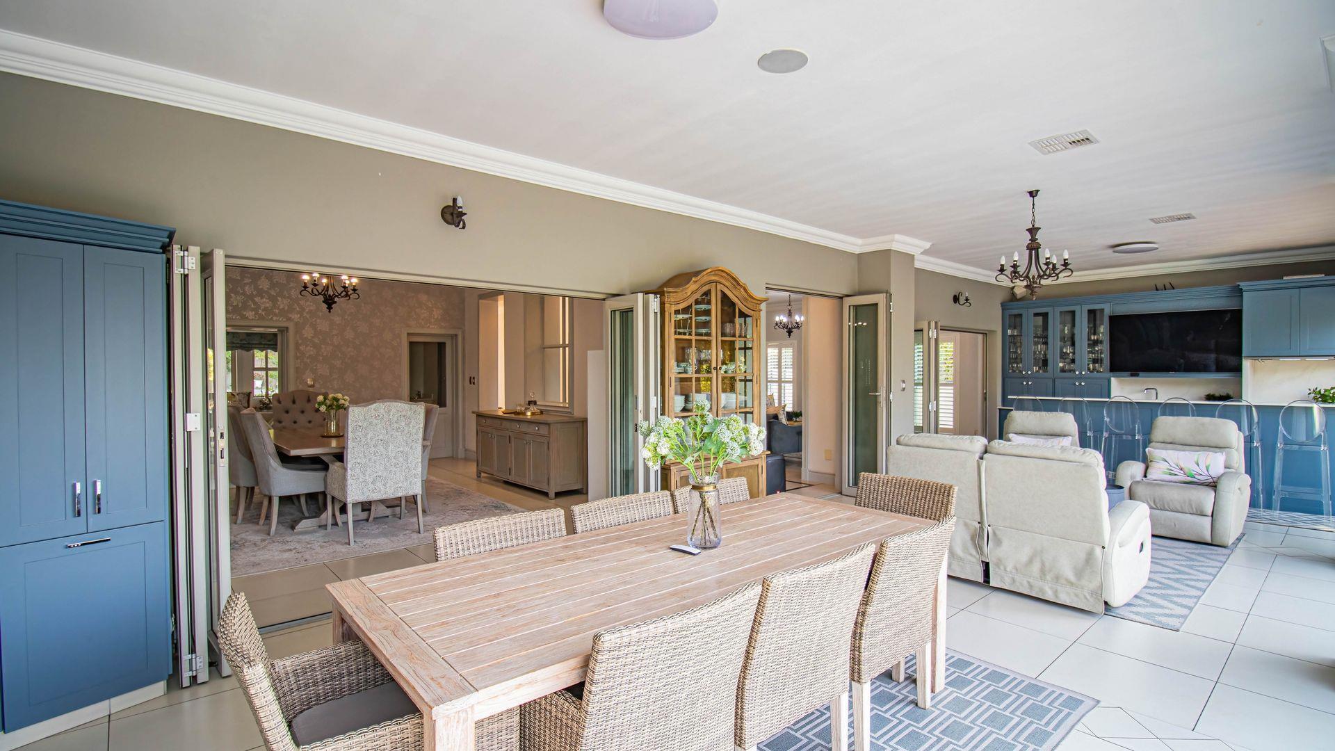 The expansive ground floor is perfectly suited to entertaining, with generous living, bar, and entertainment spaces opening seamlessly through stacking glass doors onto the landscaped garden, sun deck, and private heated swimming pool. This effortless indoor-outdoor flow allows for year-round enjoyment of the Highveld climate in a setting designed for both relaxation and hosting.