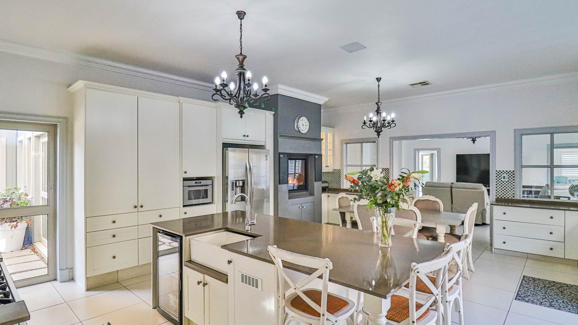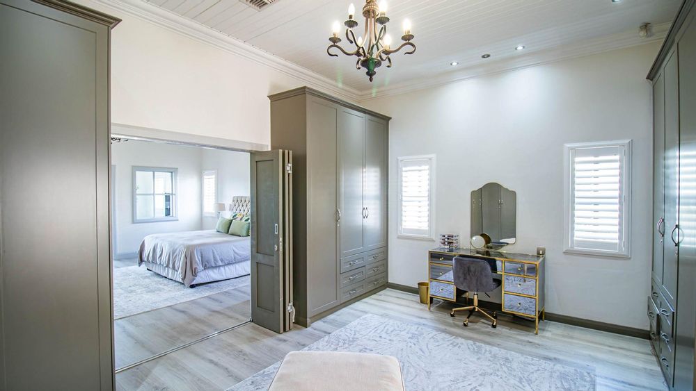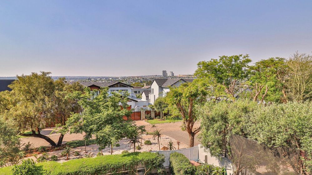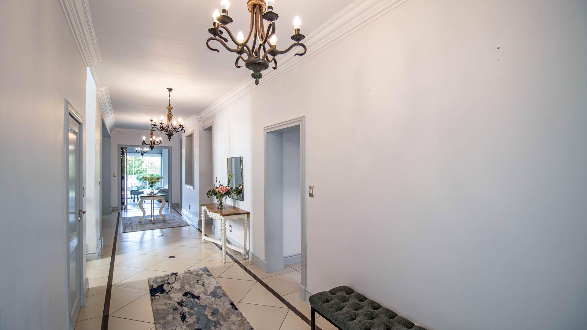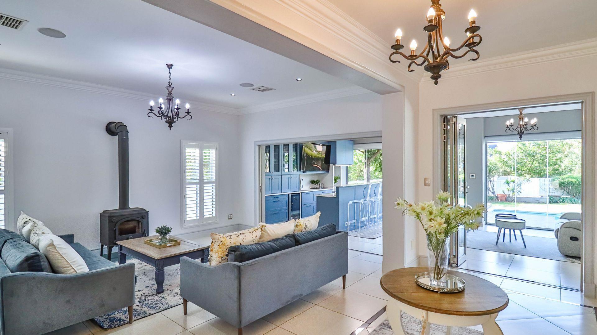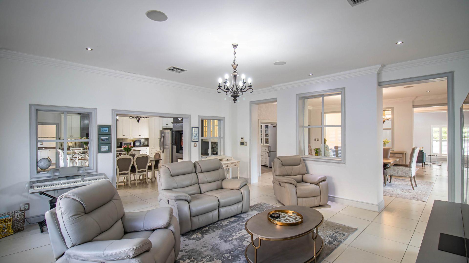 The expansive ground floor is perfectly suited to entertaining, with generous living, bar, and entertainment spaces opening seamlessly through stacking glass doors onto the landscaped garden, sun deck, and private heated swimming pool. This effortless indoor-outdoor flow allows for year-round enjoyment of the Highveld climate in a setting designed for both relaxation and hosting.
