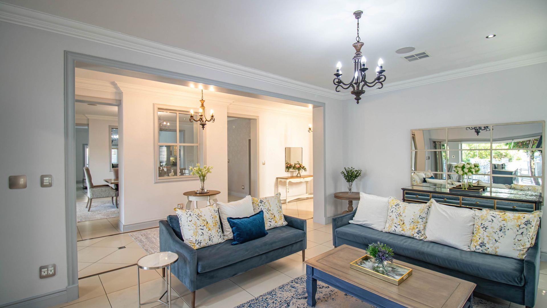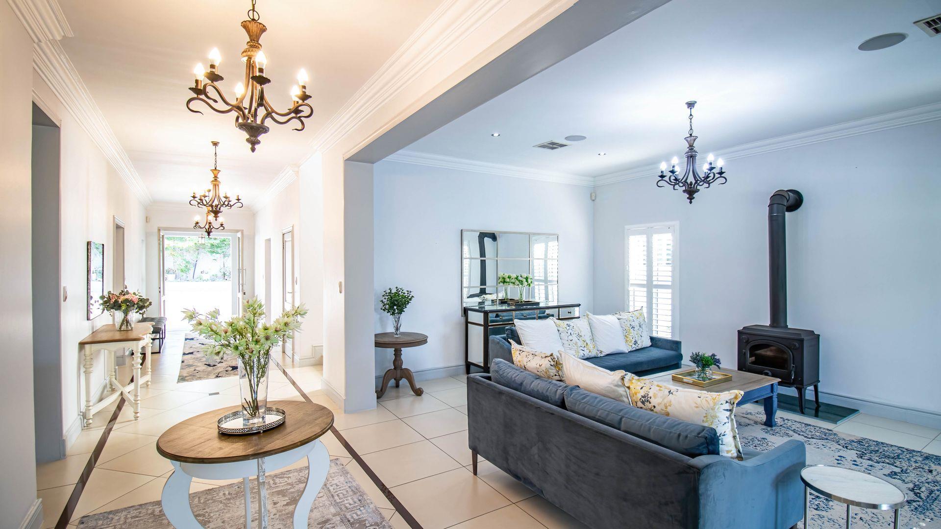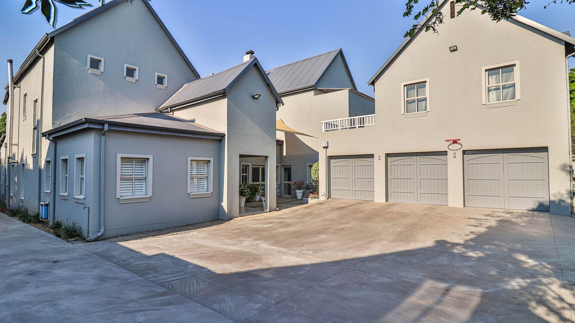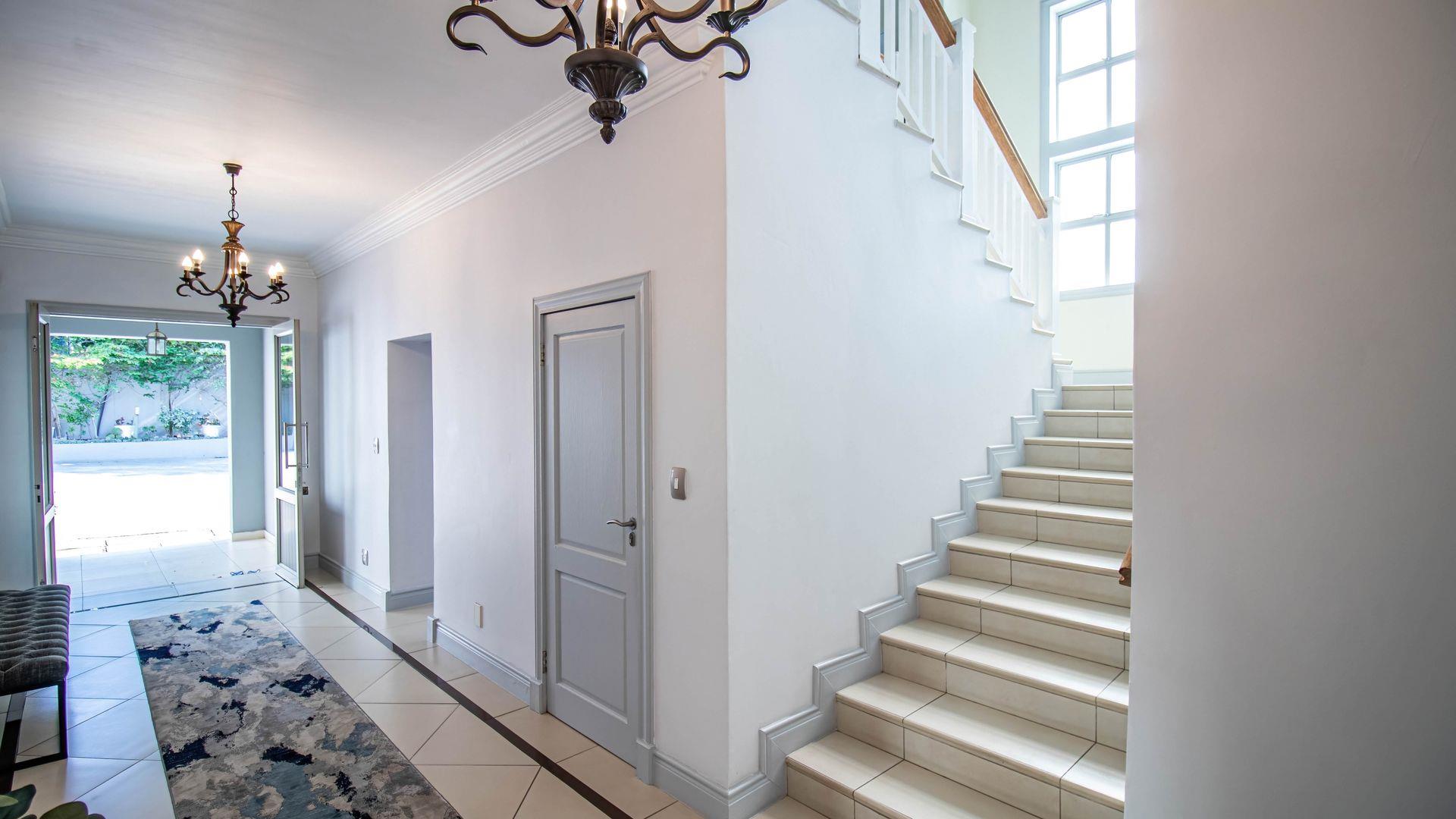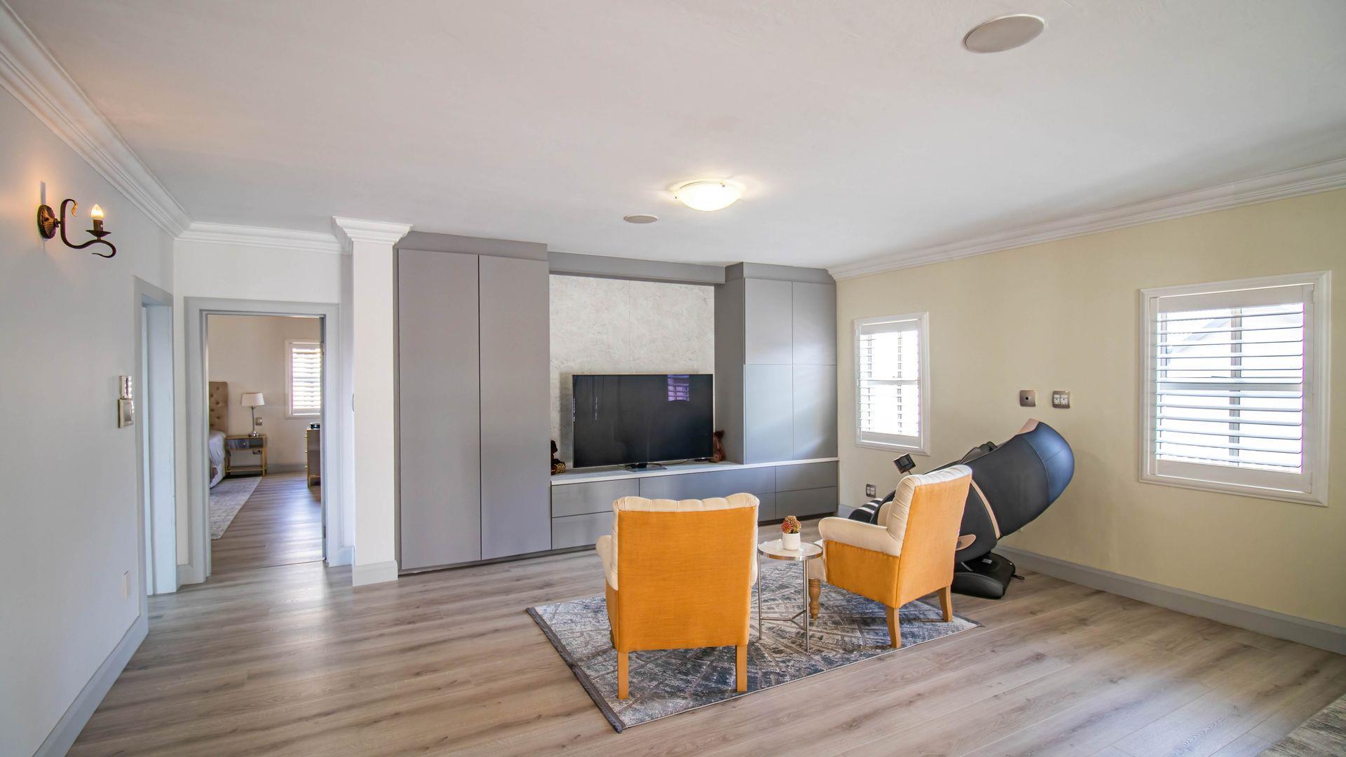 The expansive ground floor is perfectly suited to entertaining, with generous living, bar, and entertainment spaces opening seamlessly through stacking glass doors onto the landscaped garden, sun deck, and private heated swimming pool. This effortless indoor-outdoor flow allows for year-round enjoyment of the Highveld climate in a setting designed for both relaxation and hosting.