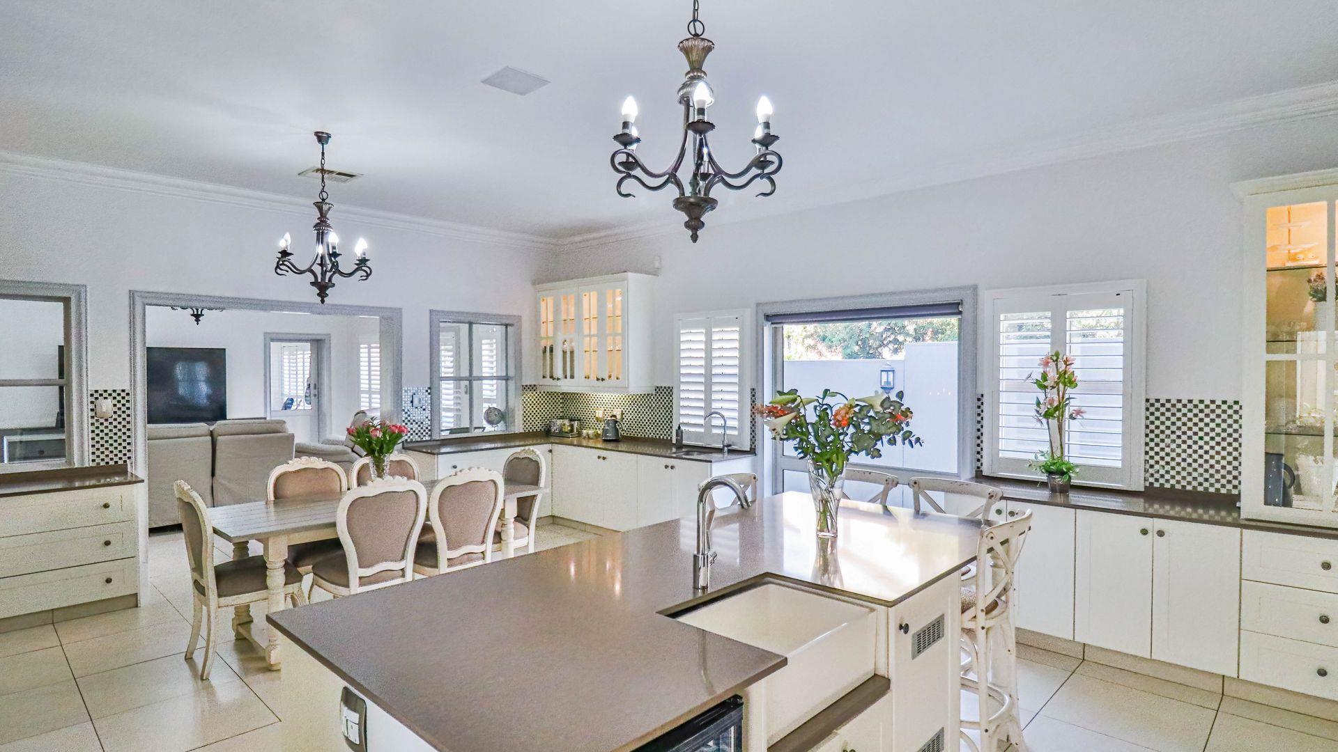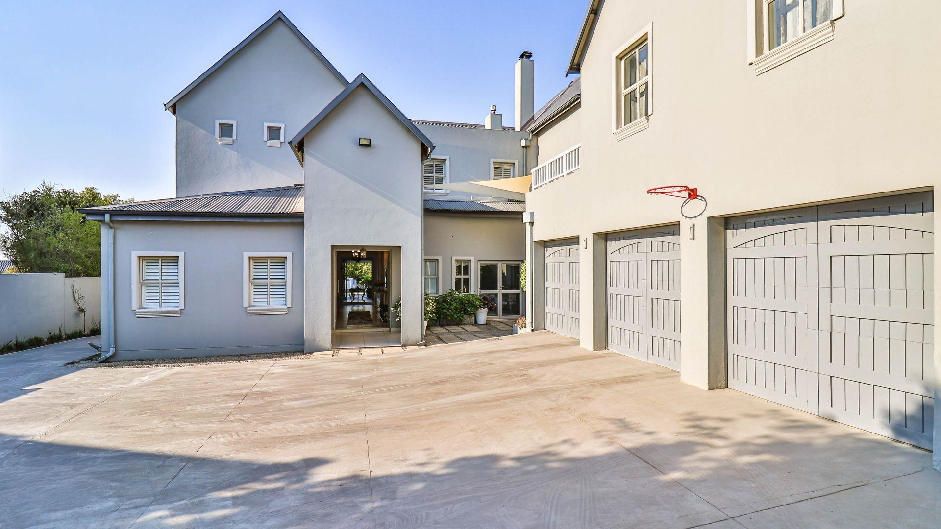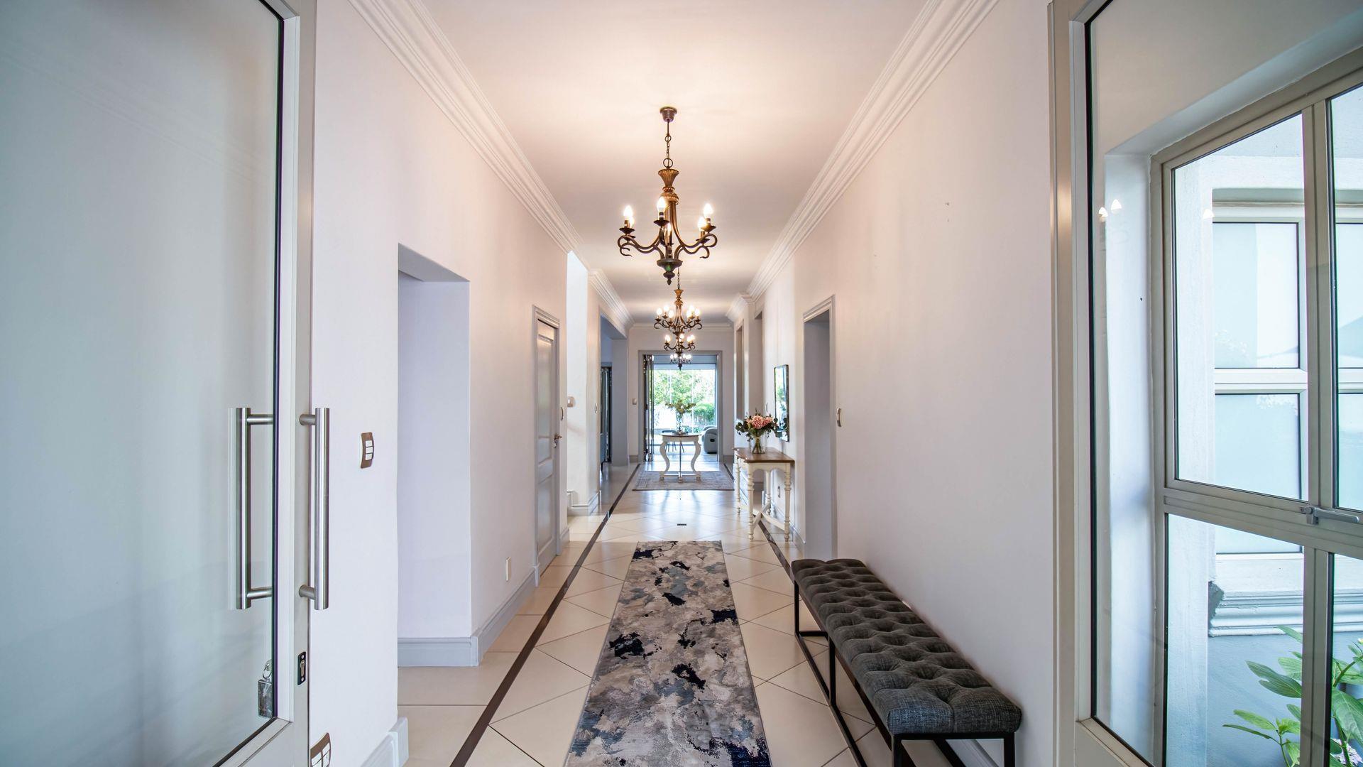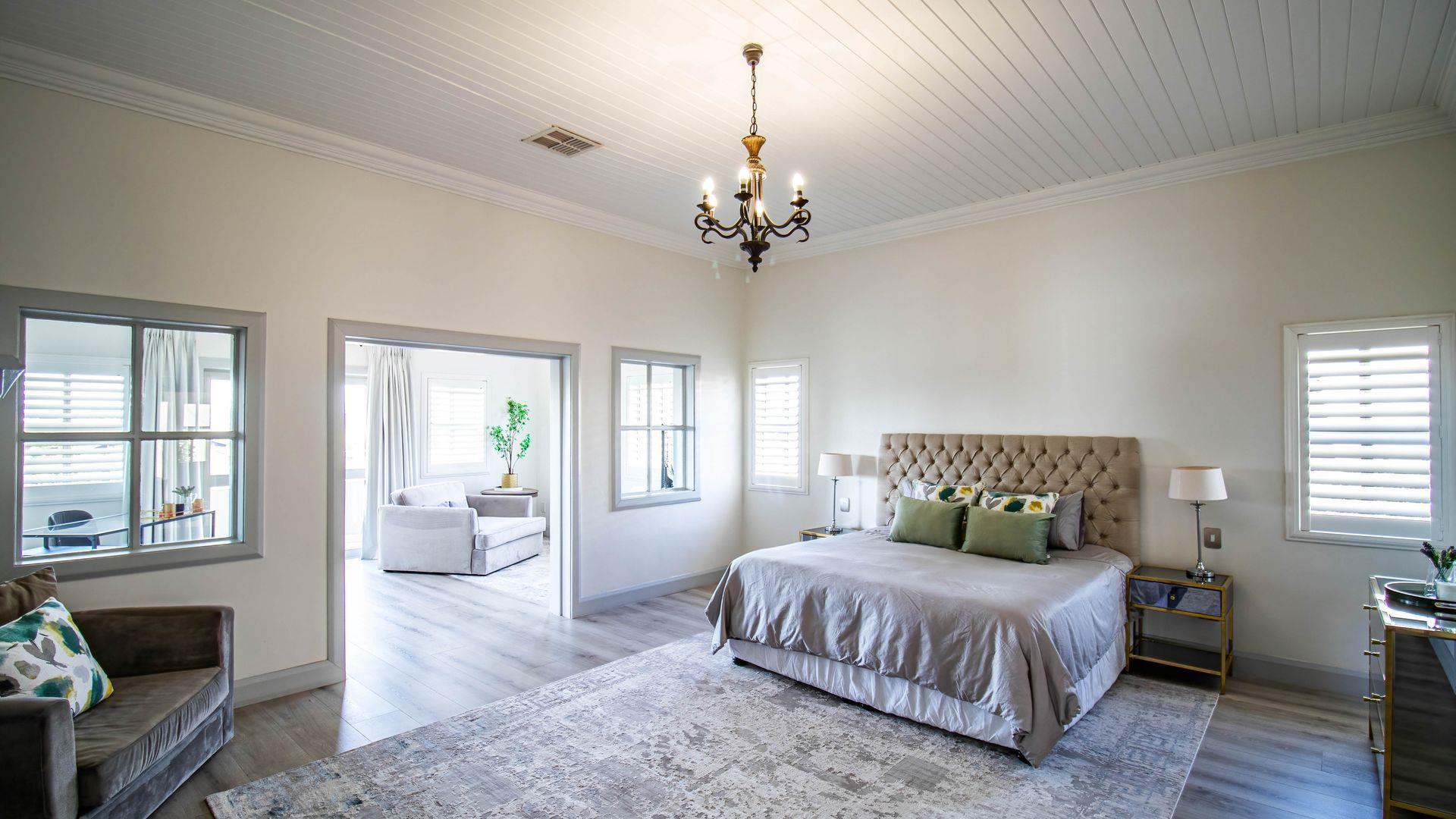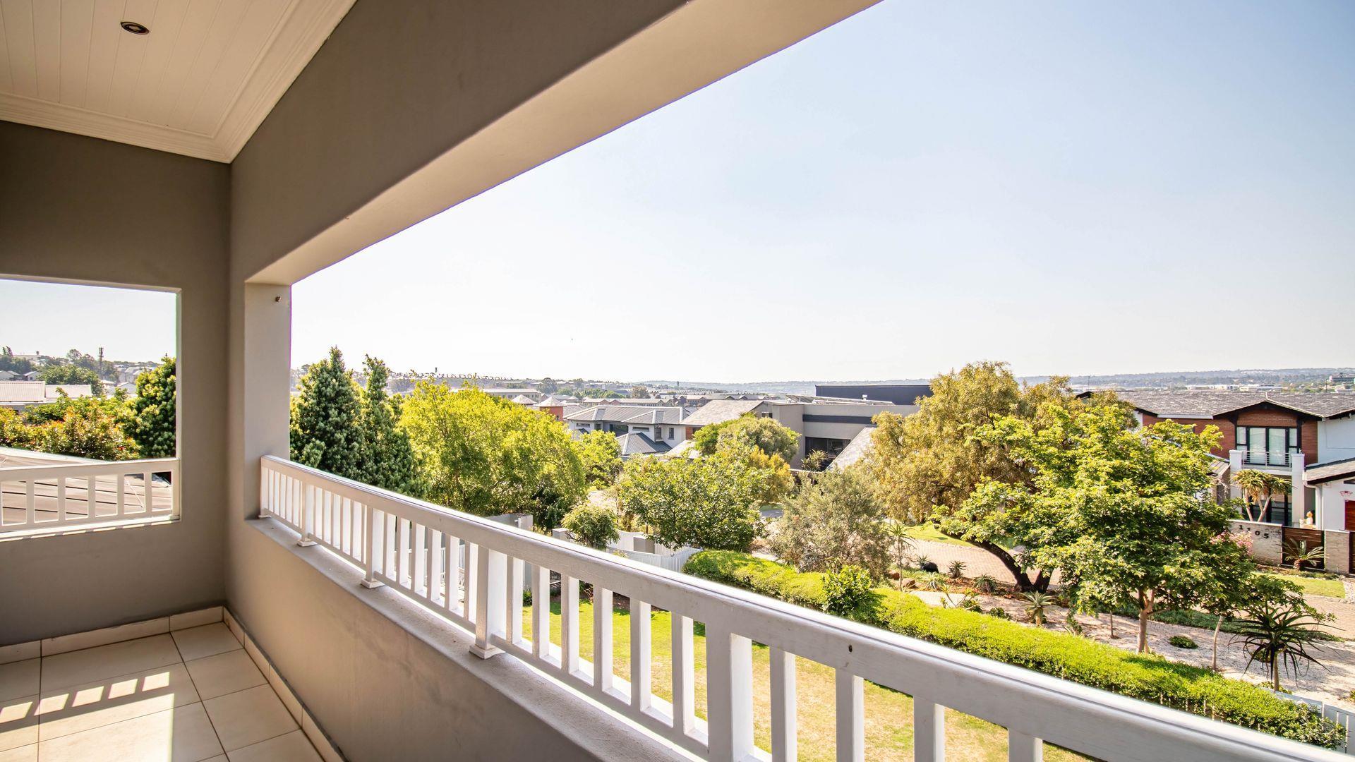 The expansive ground floor is perfectly suited to entertaining, with generous living, bar, and entertainment spaces opening seamlessly through stacking glass doors onto the landscaped garden, sun deck, and private heated swimming pool. This effortless indoor-outdoor flow allows for year-round enjoyment of the Highveld climate in a setting designed for both relaxation and hosting.