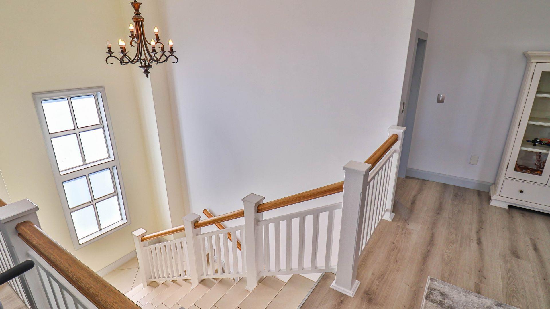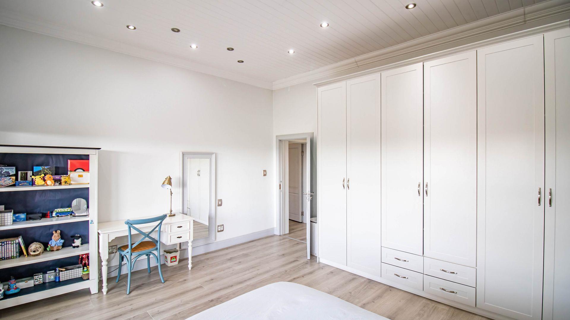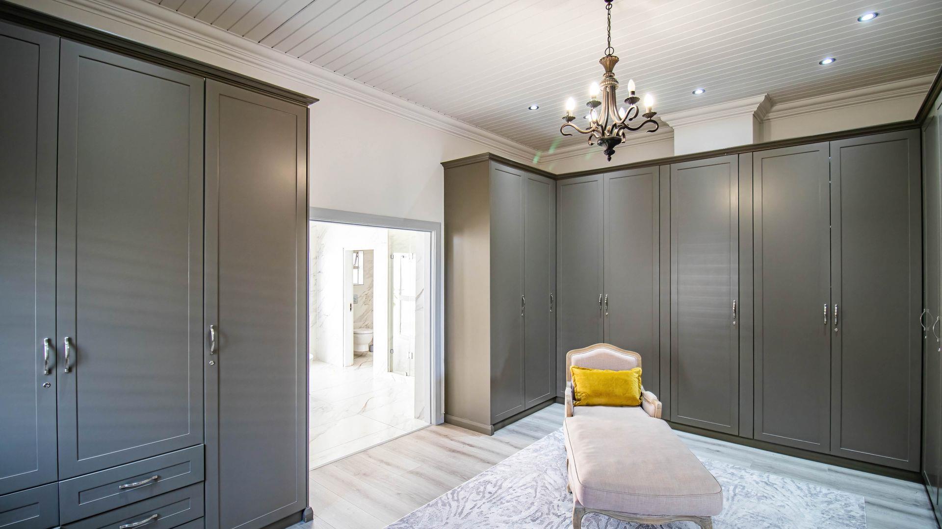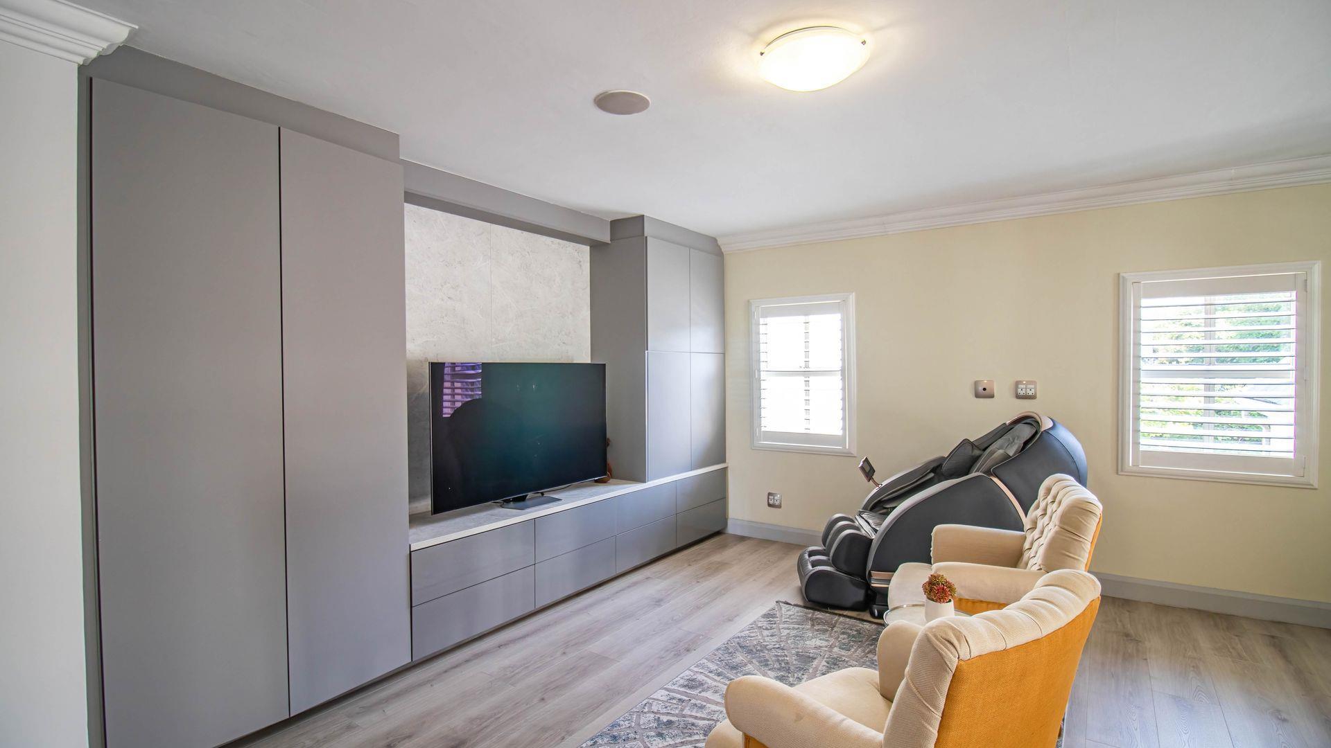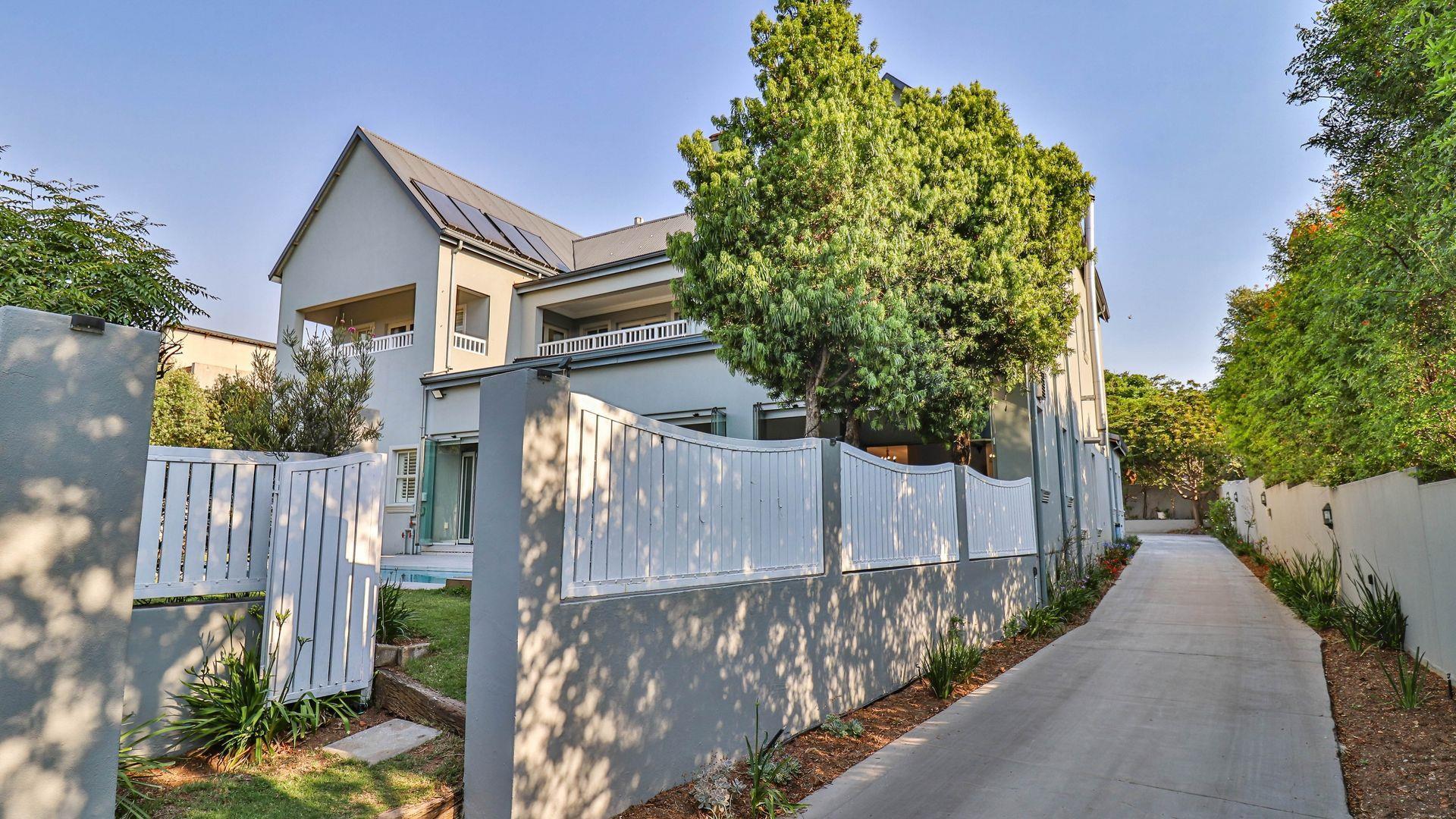 The expansive ground floor is perfectly suited to entertaining, with generous living, bar, and entertainment spaces opening seamlessly through stacking glass doors onto the landscaped garden, sun deck, and private heated swimming pool. This effortless indoor-outdoor flow allows for year-round enjoyment of the Highveld climate in a setting designed for both relaxation and hosting.