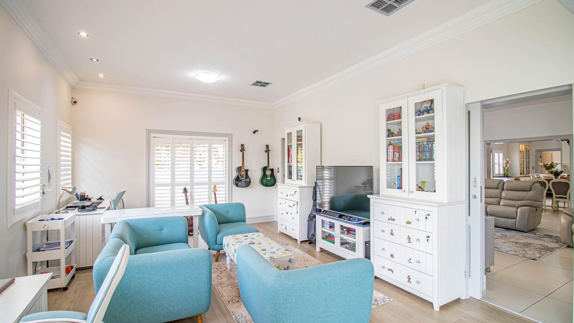 At the heart of the home is a contemporary open-plan kitchen with its own dining area, beautifully anchored by a stylish gas fireplace, creating a warm and inviting space for family gatherings and entertaining. Multiple reception areas include a formal lounge, TV lounge, children’s study, and a private home office, offering exceptional versatility for modern living and remote working.