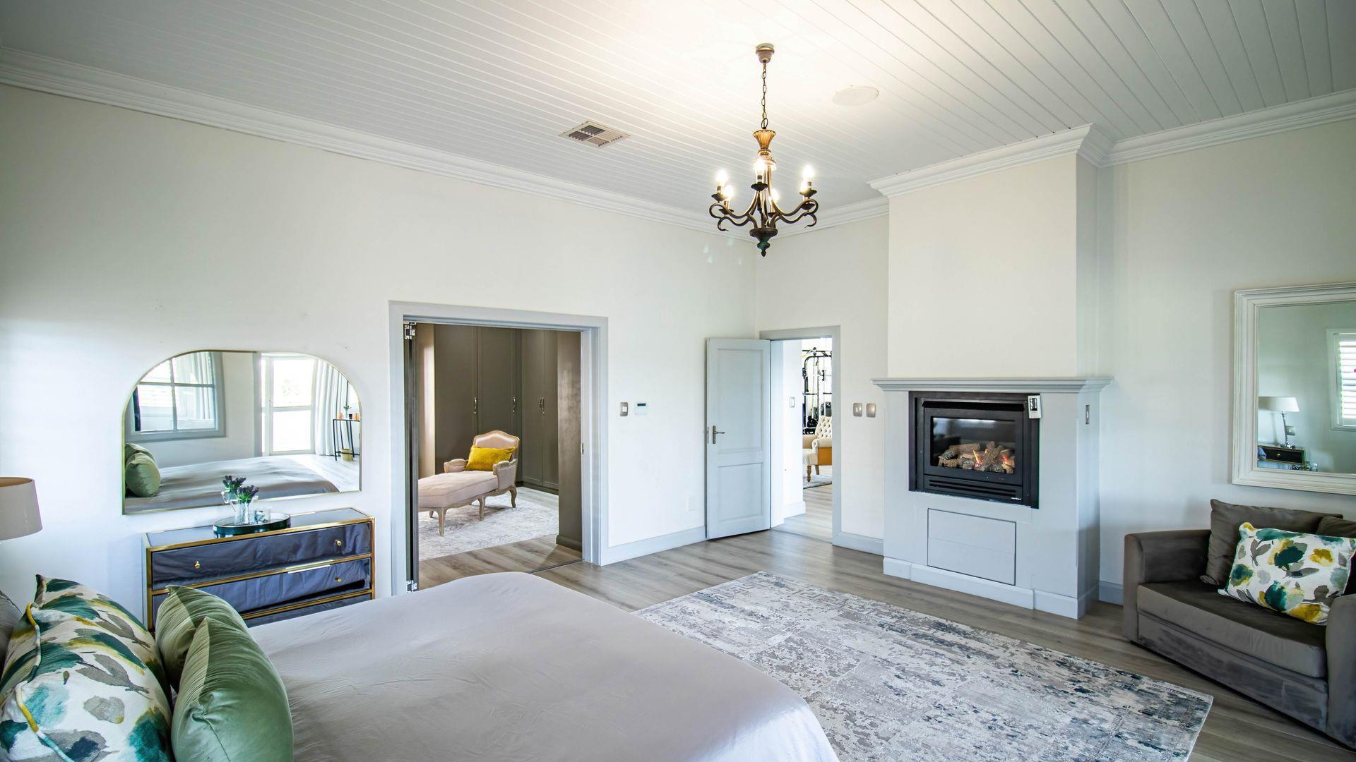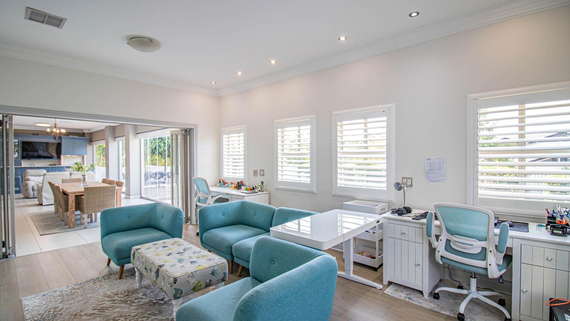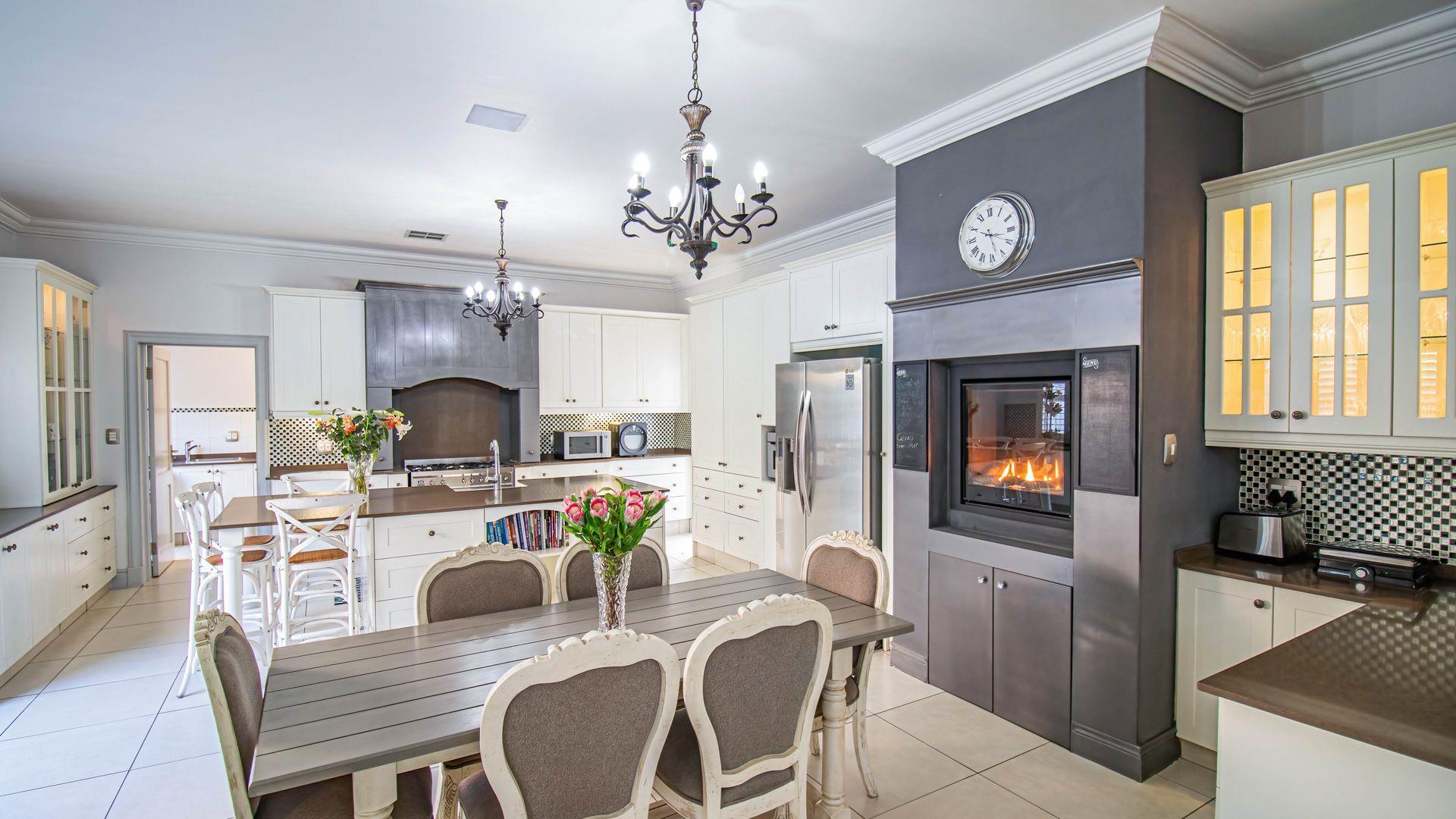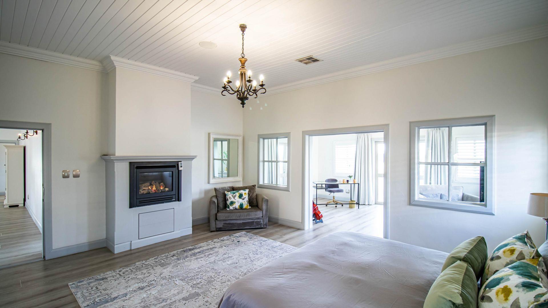 Designed for sophisticated family living and executive entertaining, the home features central air conditioning throughout, a built-in vacuum system, integrated speakers across most areas, and full backup power and water solutions. Warmth and ambience are provided by four closed-combustion gas fireplaces, complemented by a Morso wood-burning fireplace for cosy winter evenings. Luxaflex shutters, Duette blinds, and motorised roller blinds enhance the elegant aesthetic while offering privacy and comfort throughout the home.