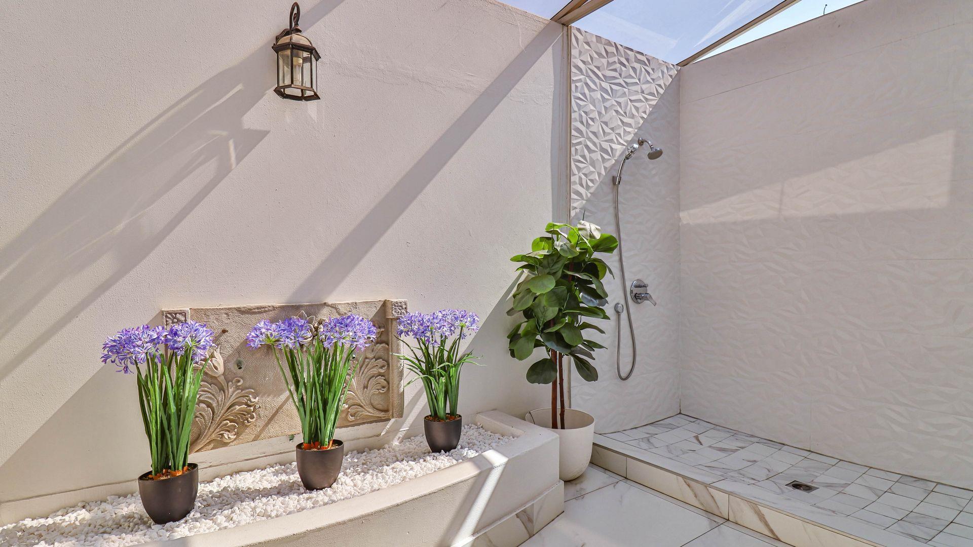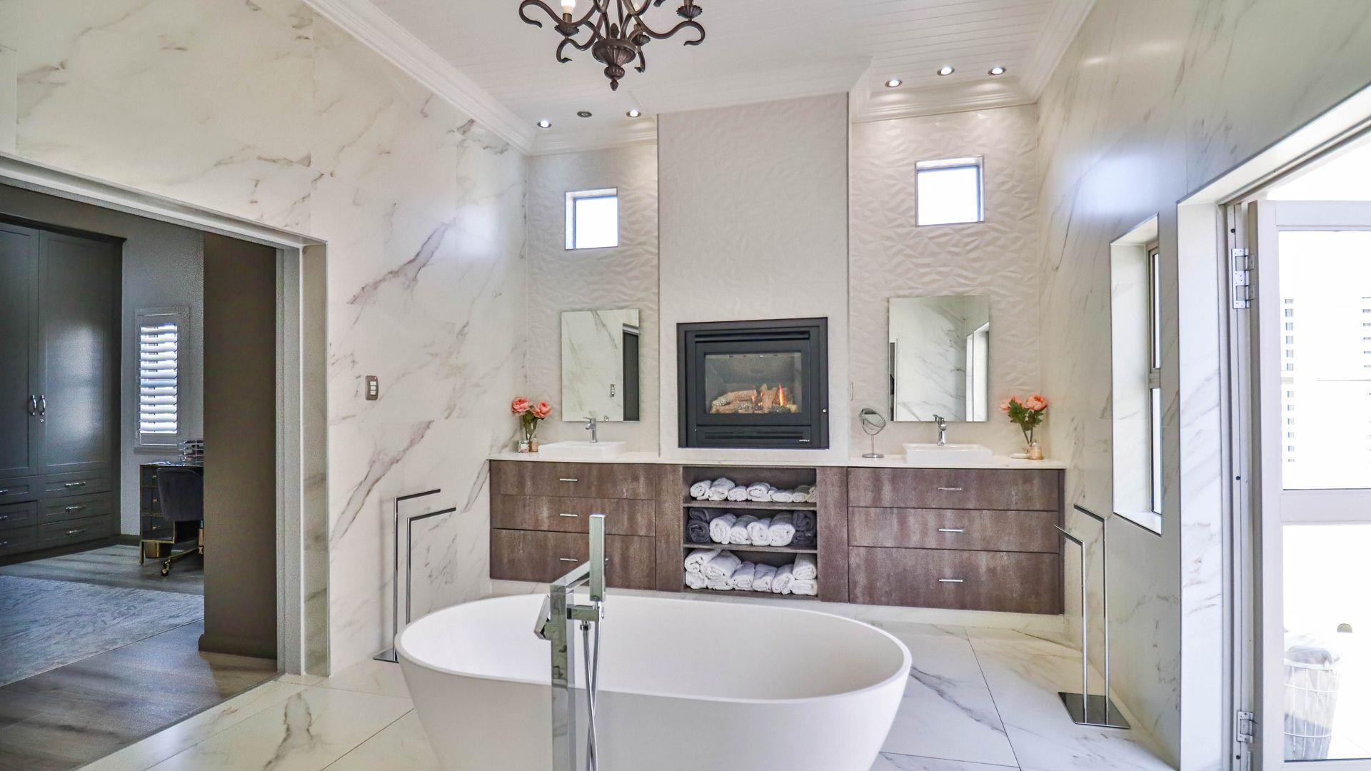 The main suite is a true sanctuary, featuring a gas fireplace, private lounge, and access to a covered balcony with scenic views. The luxurious en-suite bathroom is finished in elegant white tiles and includes a freestanding bath, expansive glass shower, and its own gas fireplace, as well as a private balcony with an outdoor shower for a unique under-the-stars experience. A spacious custom dressing room with built-in cabinetry, dedicated vanity space, and soft ambient lighting completes this exceptional retreat.