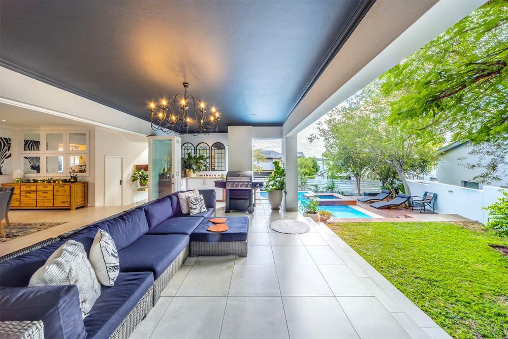 A bar area and a spacious lounge create the perfect setting for relaxation and socialising. Stacking doors lead out to an expansive patio overlooking a landscaped garden, a sparkling pool, and a heated jacuzzi complete with a tranquil water feature, making outdoor living a dream.