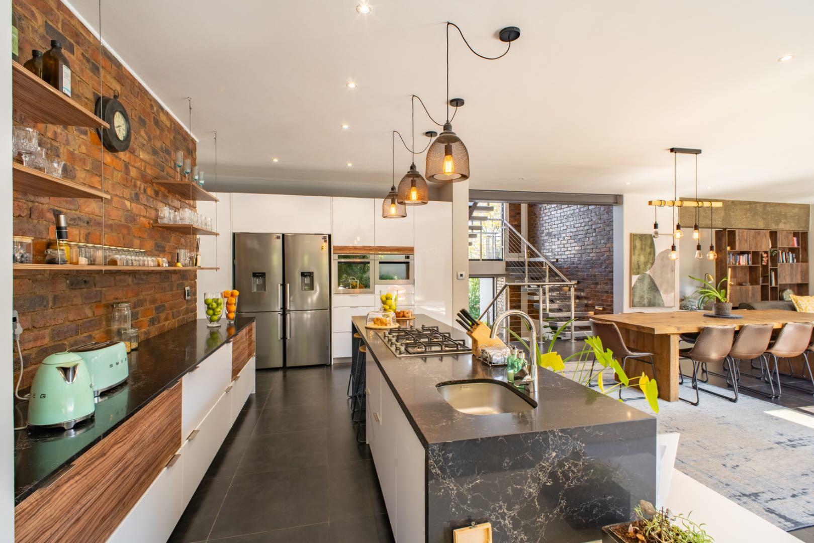 On the first level, an open-plan gourmet kitchen with a separate scullery flows effortlessly into a stylish TV lounge. Stackable glass doors invite you to the beautifully landscaped garden and sparkling swimming pool, perfect for seamless indoor-outdoor living. A formal dining room leads into a grand formal lounge, complete with a statement wood-burning fireplace, offering warmth and charm during cooler months.