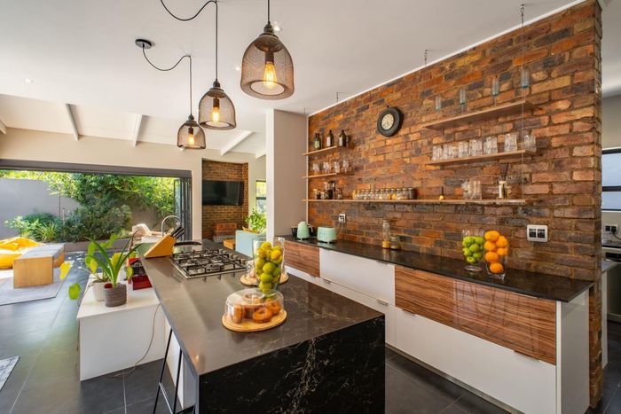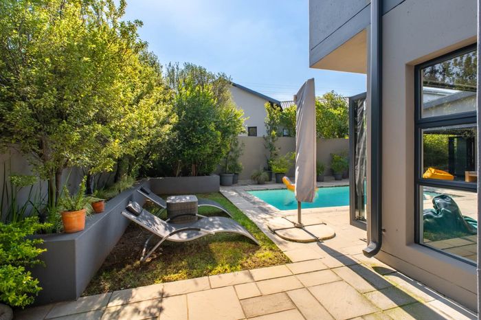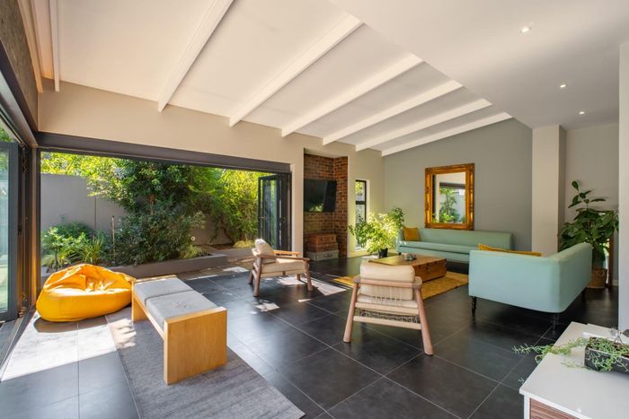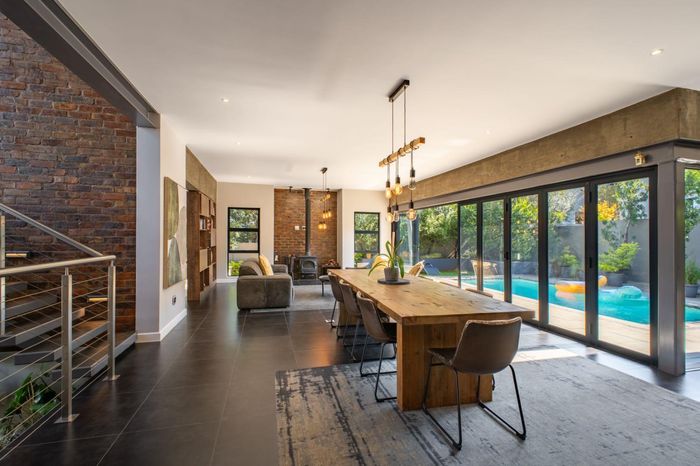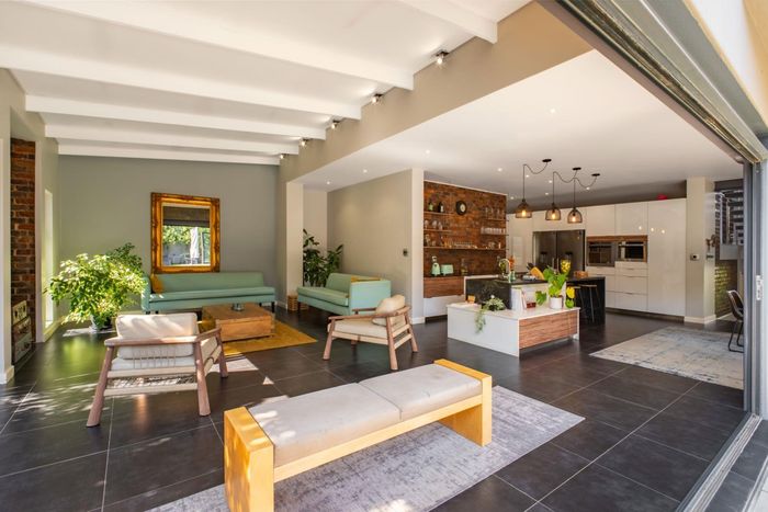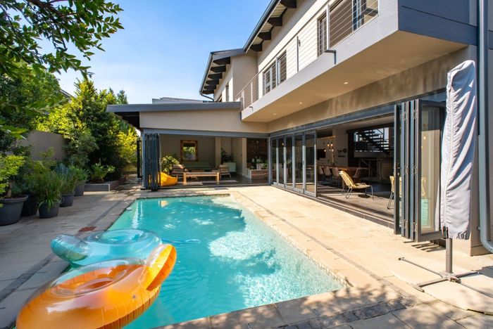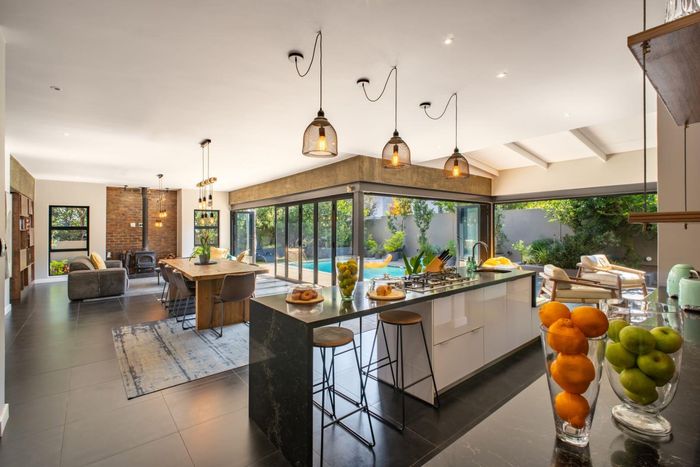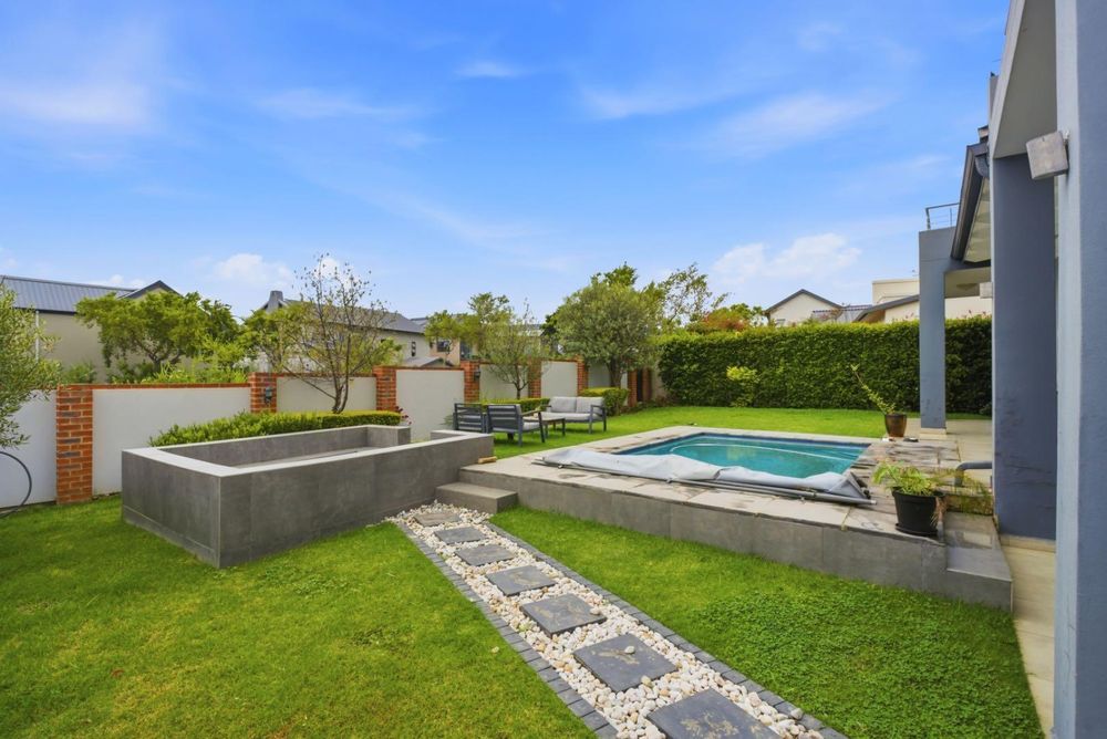 Stack doors from the covered patio open onto a landscaped garden, sparkling pool, and a charming boma area, the perfect setting for relaxed weekends, family gatherings, and sunset evenings around the fire.