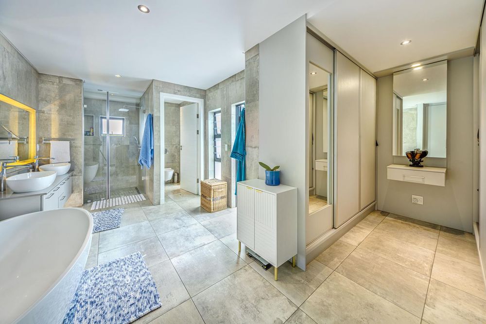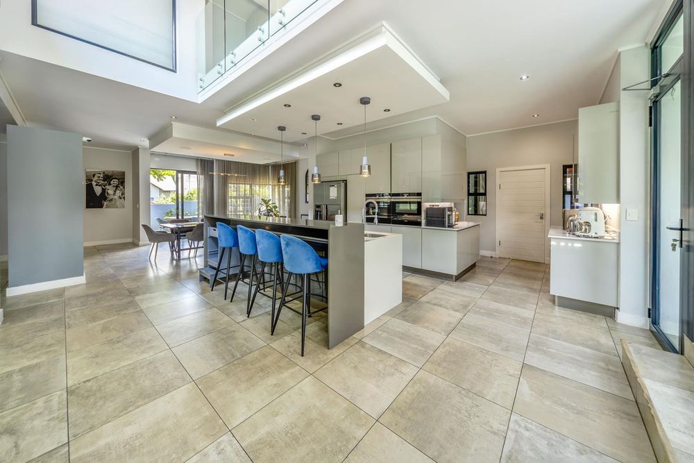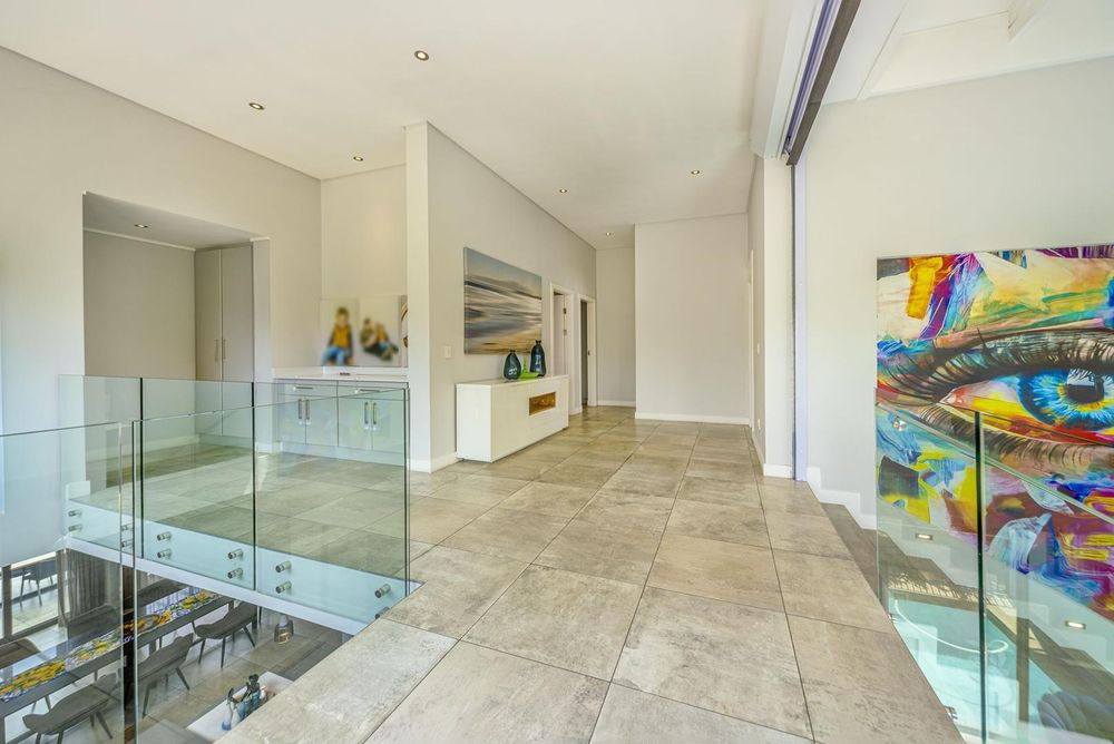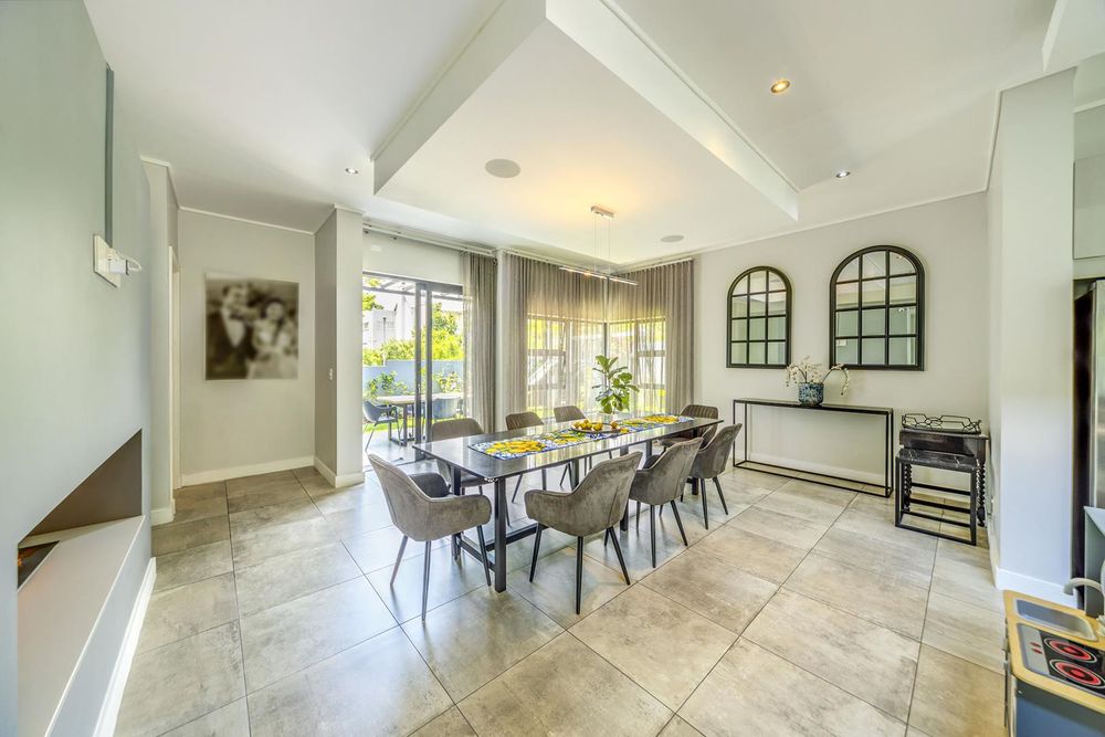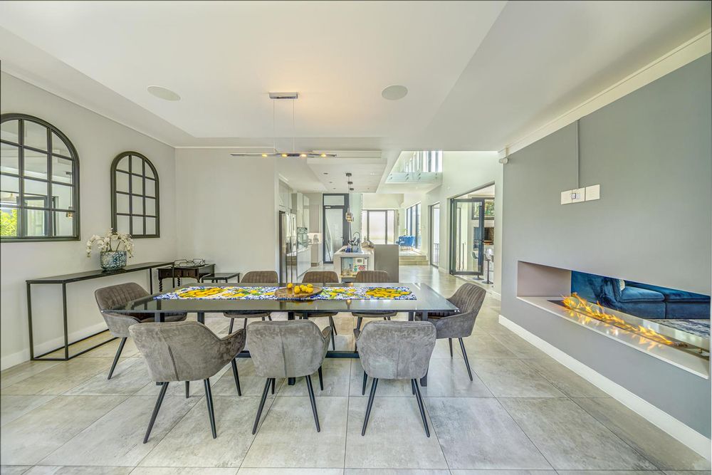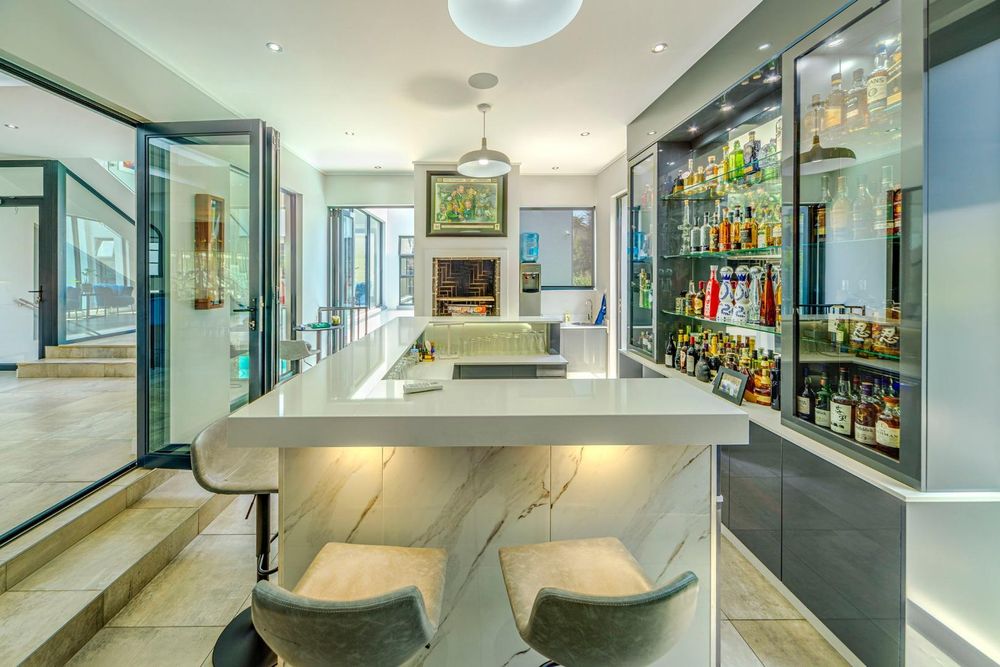 Adjacent to the kitchen, the dining area which is separated by a cozy gas fireplace into a comfortable TV lounge equipped with air conditioning. Expansive stack doors open to a sophisticated bar area with a built-in braai and bar, perfect for entertaining.