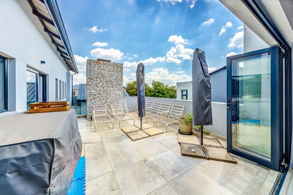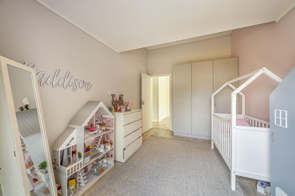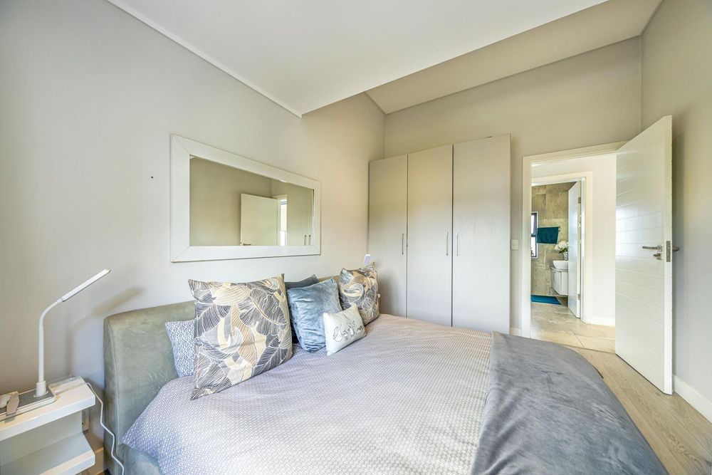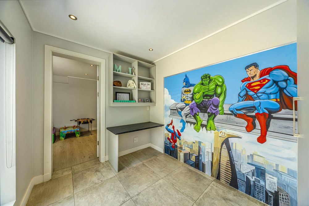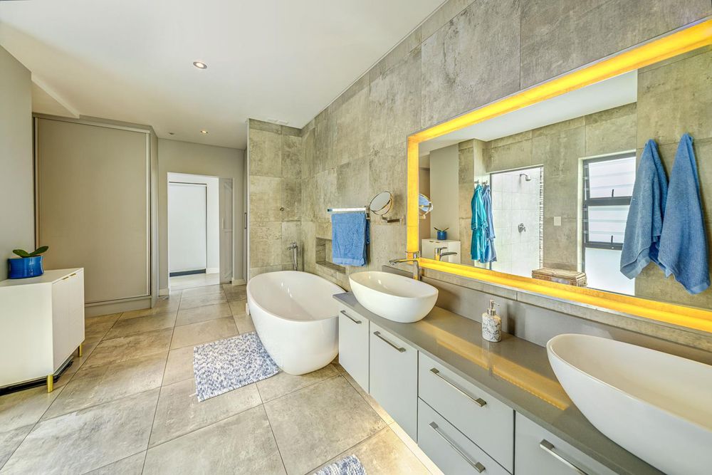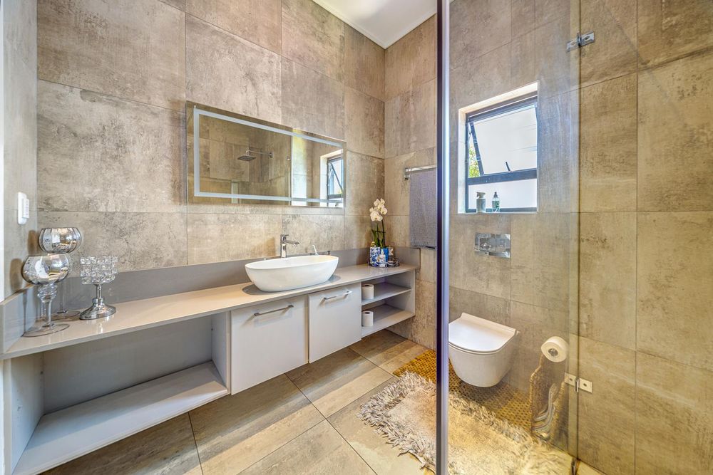 Adjacent to the kitchen, the dining area which is separated by a cozy gas fireplace into a comfortable TV lounge equipped with air conditioning. Expansive stack doors open to a sophisticated bar area with a built-in braai and bar, perfect for entertaining.