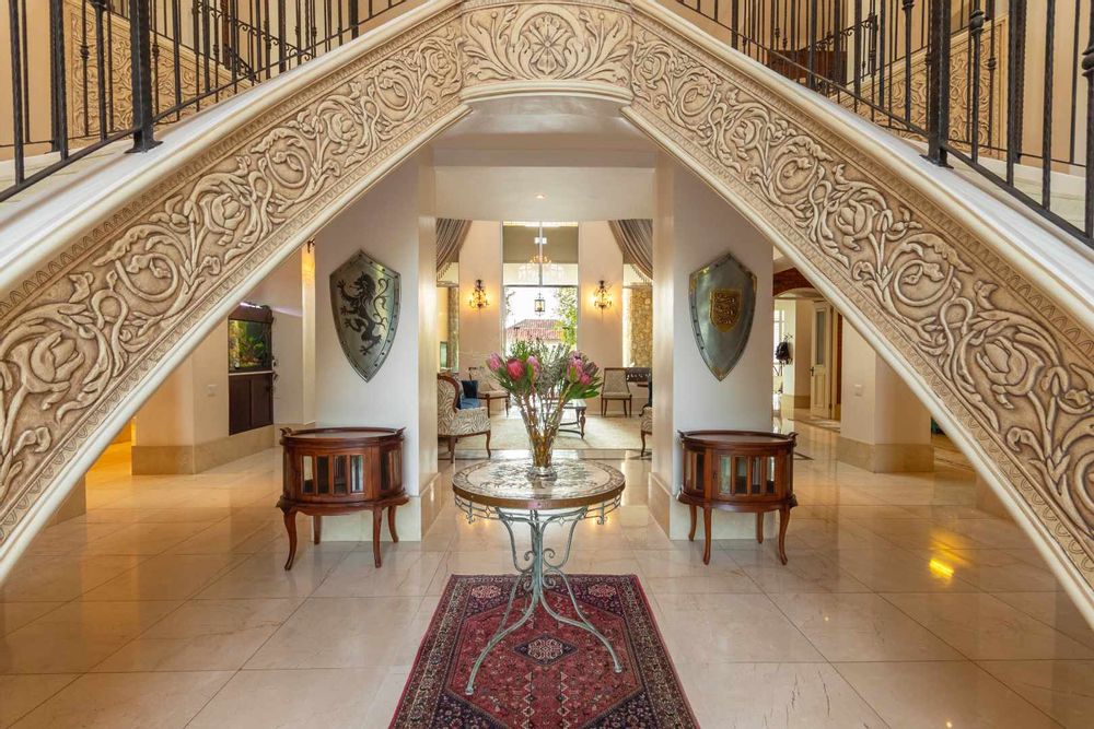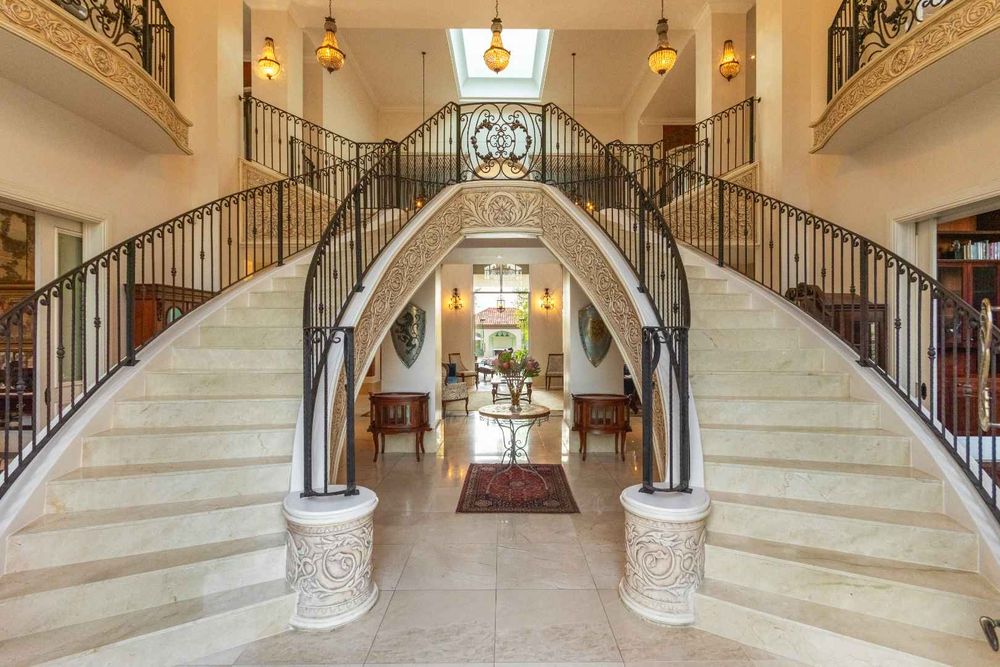 From the moment you step into the marble-clad foyer, the home’s grandeur unfolds with sweeping twin staircases, soaring volumes, and curated architectural details that create a lasting impression.