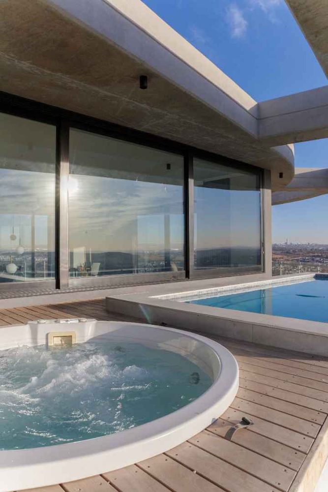 Ascend the marble staircase to the upper level, where grandeur meets entertainment on an unprecedented scale. A magnificent indoor entertainment area awaits, complemented by a guest bathroom. However, the true pièce de résistance awaits outdoors—an expansive 110-square-meter patio, where a private pool and jacuzzi invite you to indulge in pure bliss while soaking in the awe-inspiring views that stretch beyond the horizon. In this al fresco oasis, luxury takes on new meaning. A meticulously designed space awaits, where outside dining under the stars becomes an everyday affair, and lounging in ultimate comfort is simply the norm. Privacy is paramount, ensuring that every moment spent on the patio feels like an exclusive retreat—a sanctuary where time stands still, and every breath is filled with the essence of luxury.