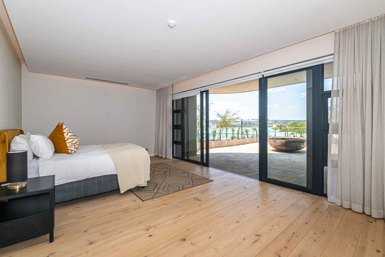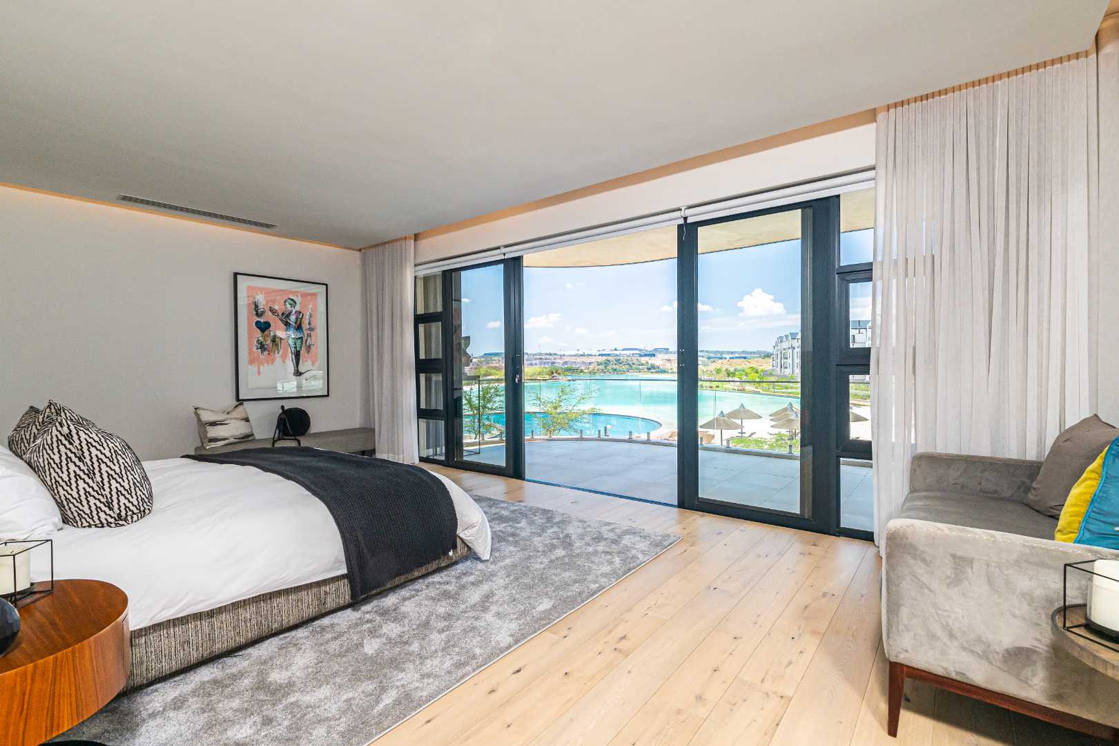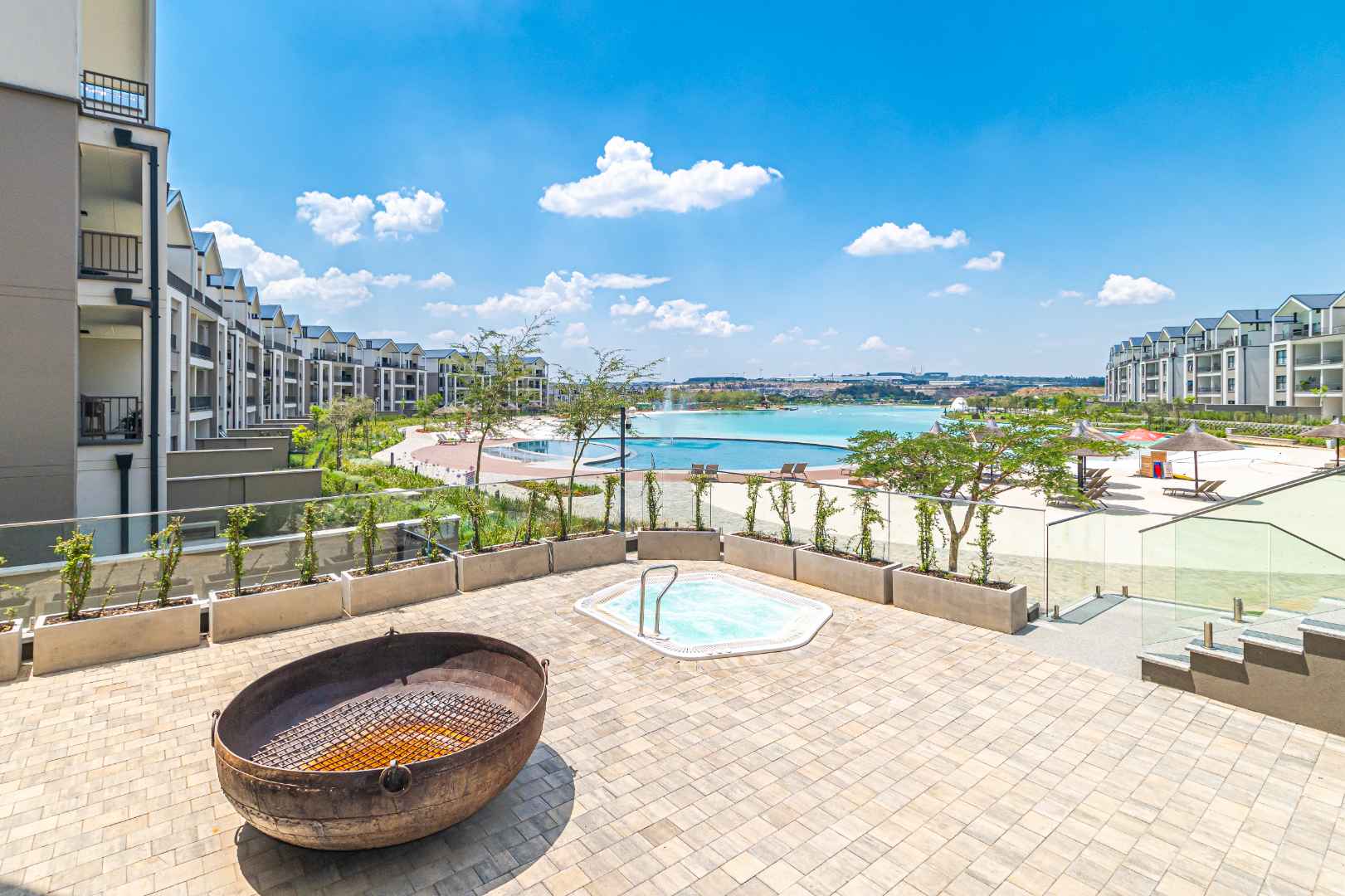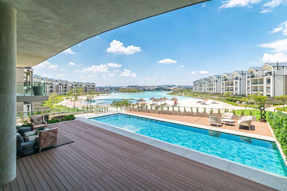 The villa features a sparkling swimming pool and a relaxing jacuzzi, perfect for unwinding after a long day. An expansive outdoor deck offers breathtaking views of the crystal lagoon and man-made beach, providing a unique holiday beach living experience in the heart of Waterfall City.