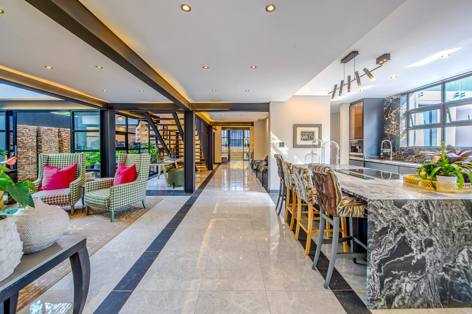 The garden level offers a beautiful double-volume lounge area, patio, braai, guest bedroom, en suite and an expansive garden with pool.