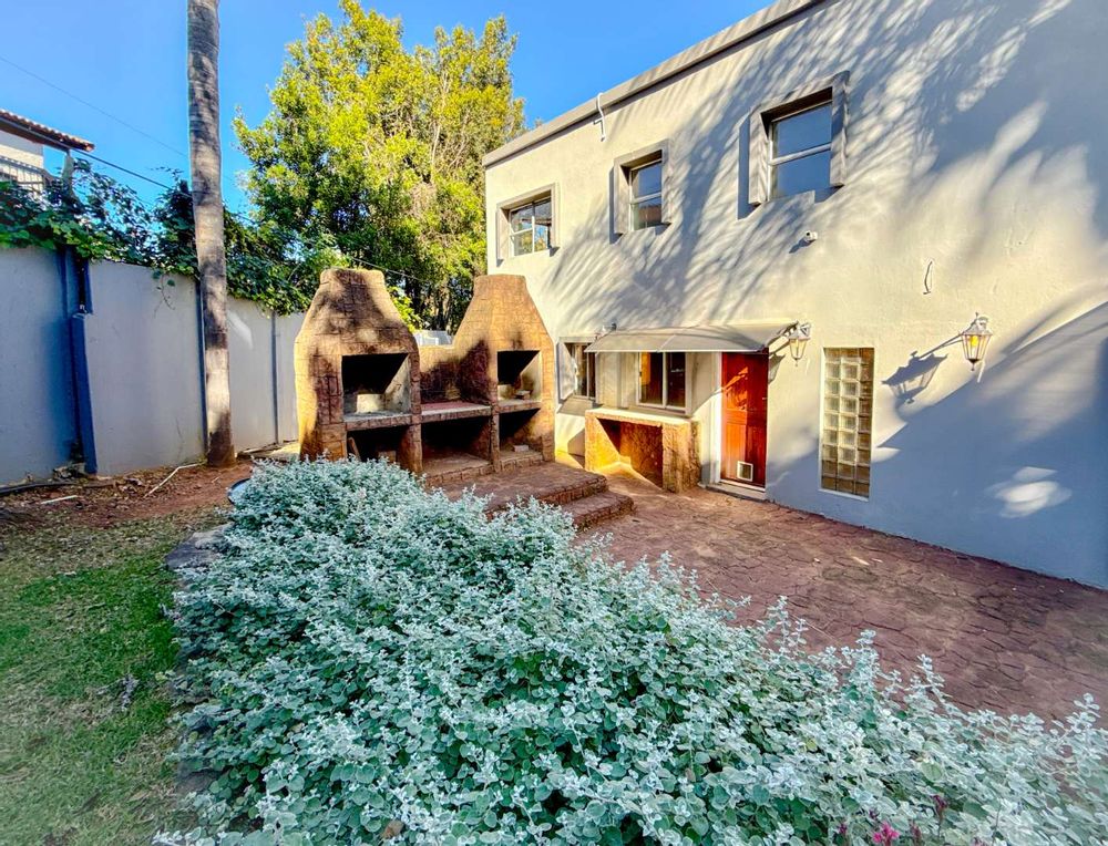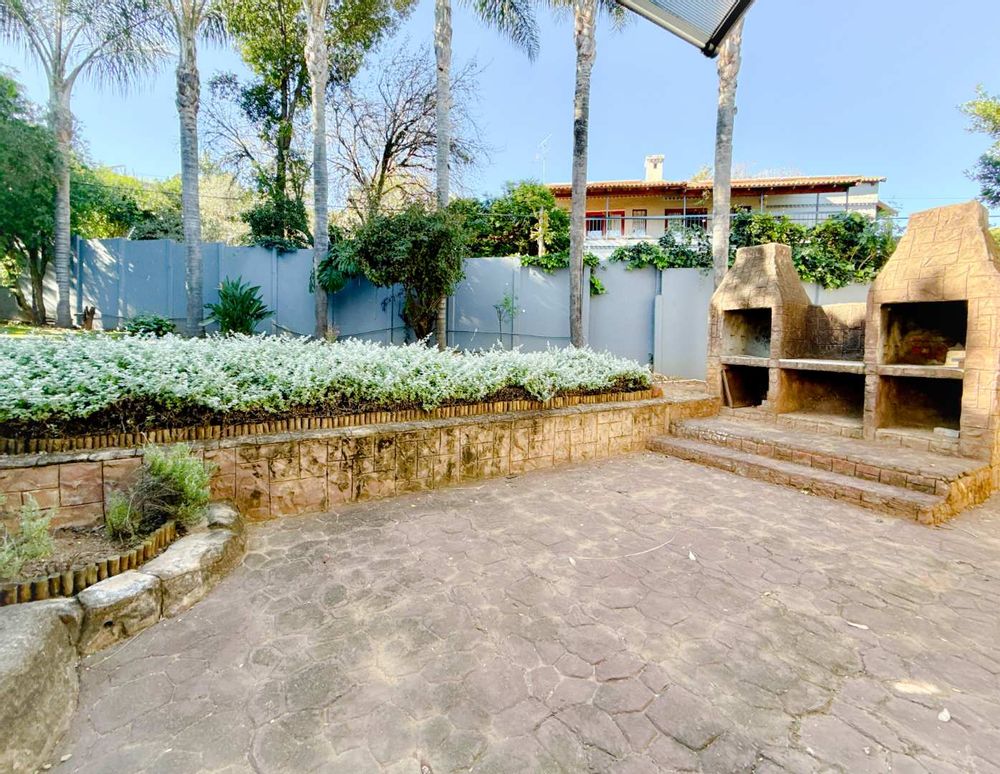 Covered entertainment patio with built-in braai overlooking a sparkling pool and lush garden.