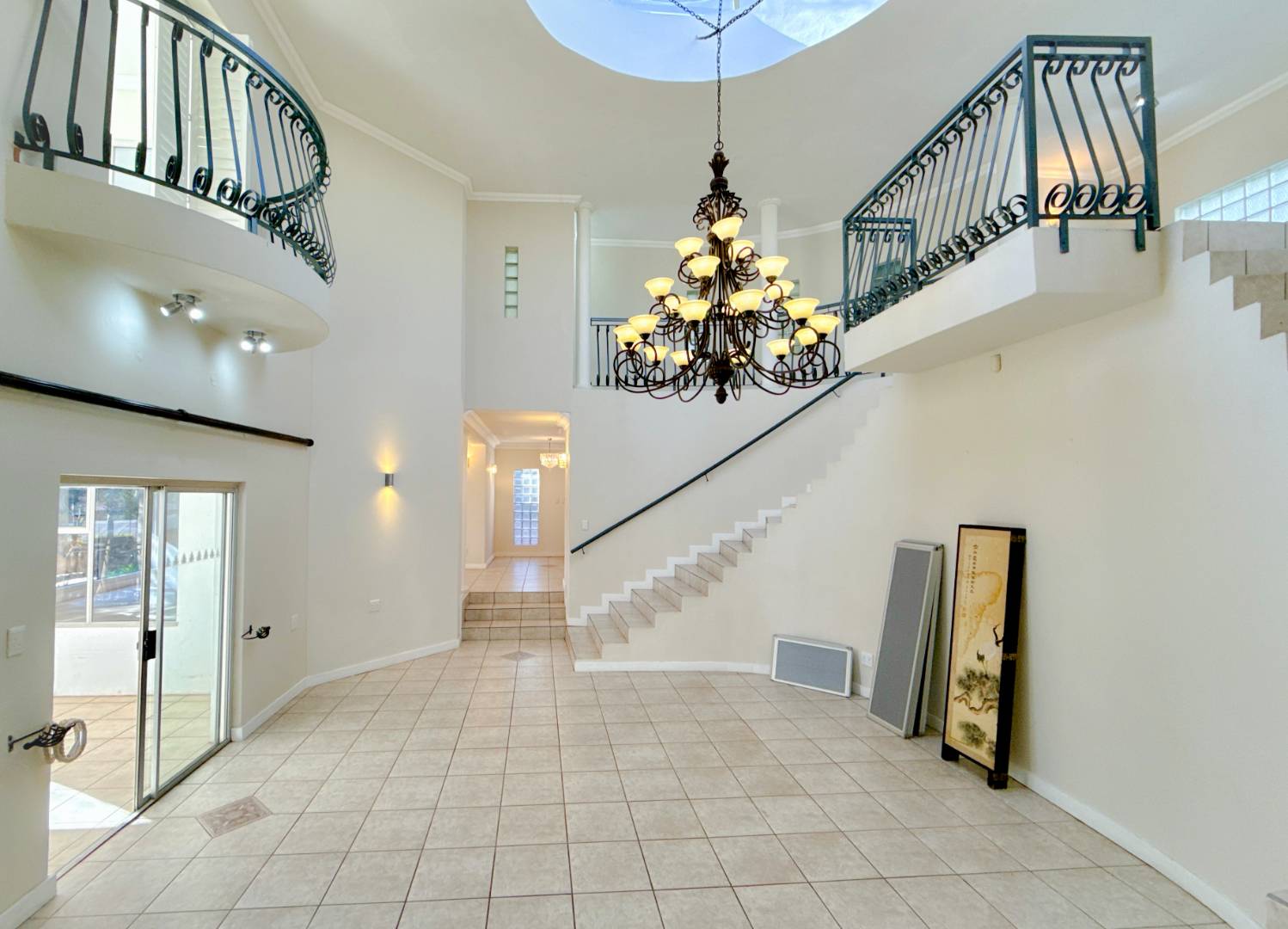 Double-volume foyer with twin balustrade staircases for a dramatic and welcoming first impression.