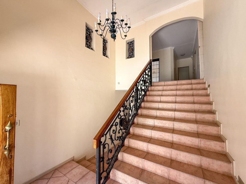 Grand double-volume entrance with sweeping staircase, chandelier & stained-glass windows