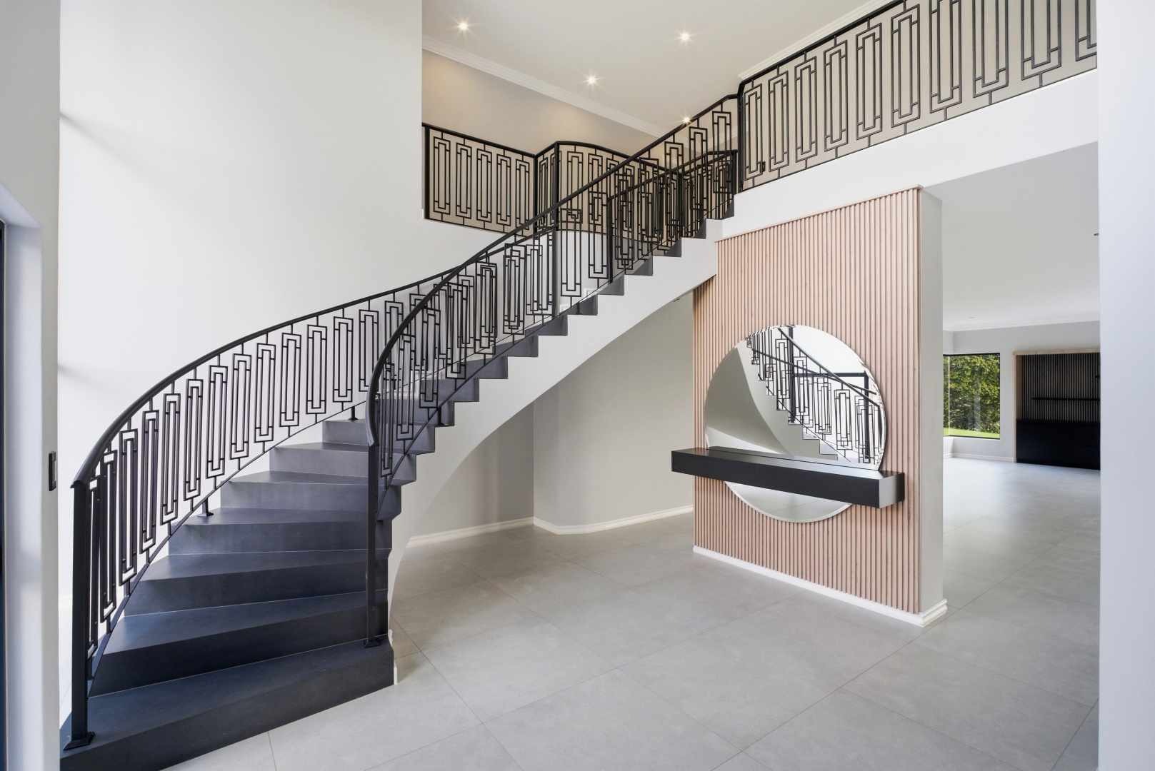 As you step into this luxurious residence, you are immediately greeted by a grand double-volume entrance. The space is both welcoming and impressive, highlighted by a magnificent sweeping staircase to your left. This home offers an unparalleled living experience, combining sophisticated design with the beauty of its natural environment.