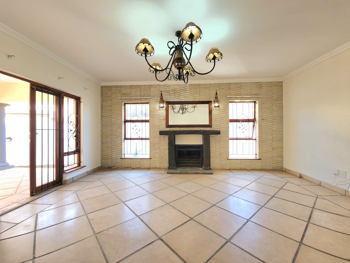 Welcoming lounge with a cozy fireplace, opening directly onto the covered patio and built-in braai area