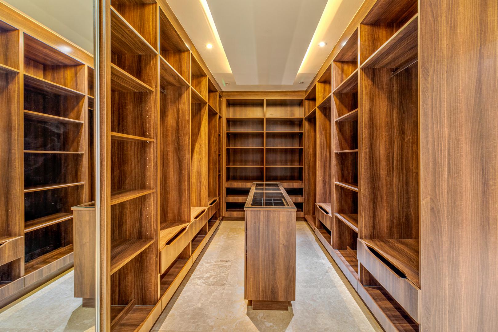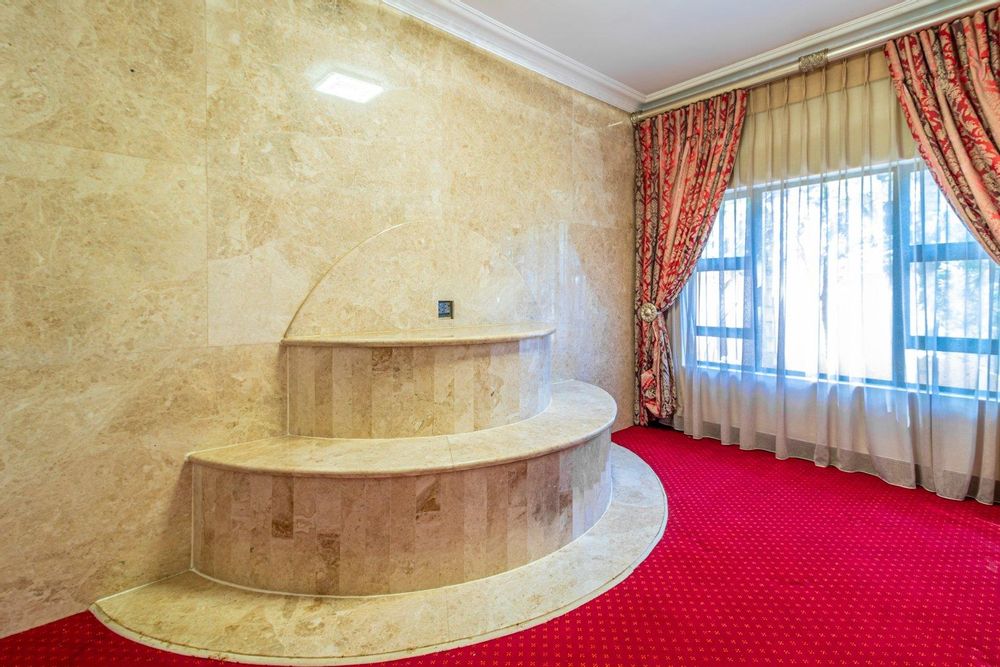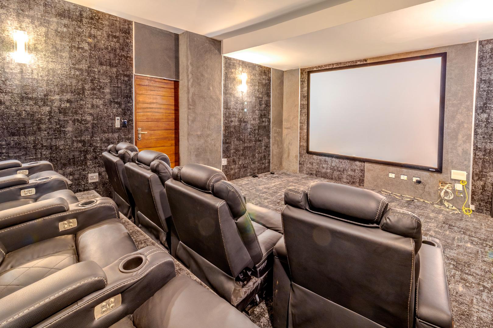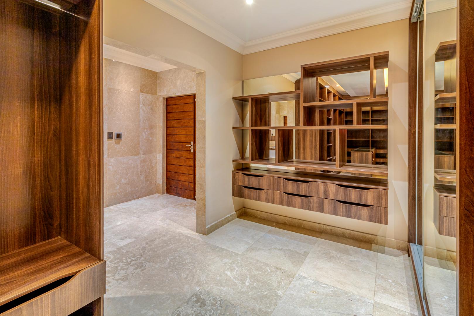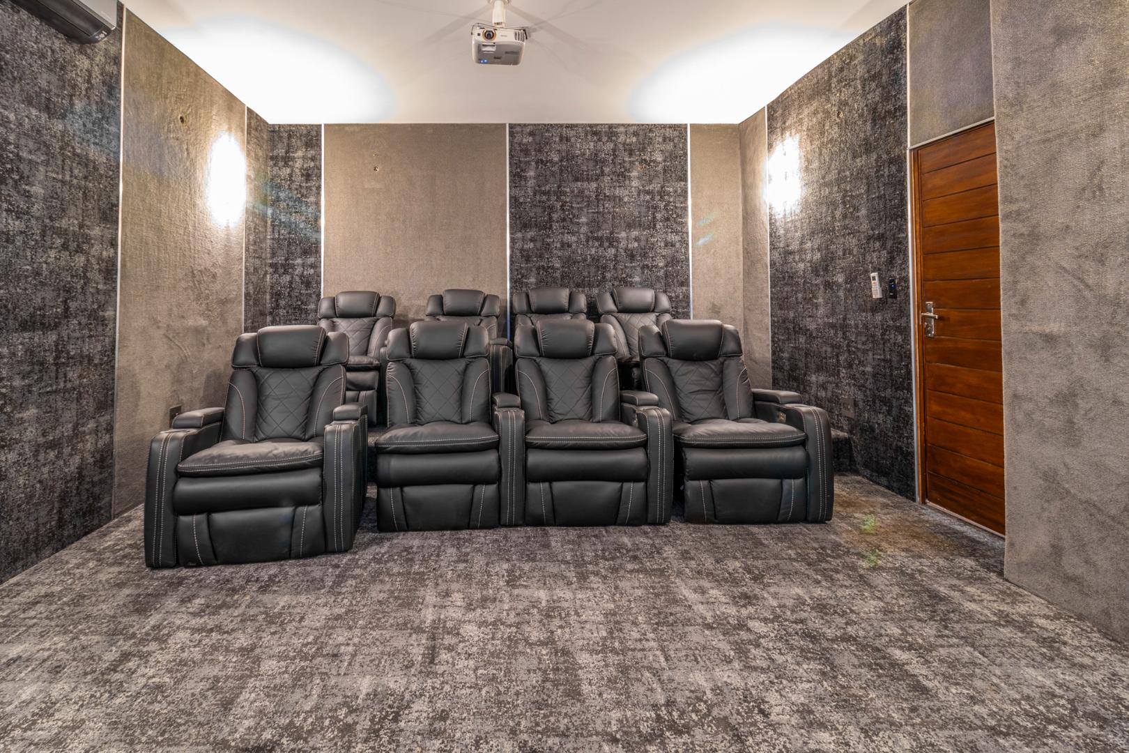 This exceptional residence also offers underfloor heating, a cinema room with a projector and built-in speakers, a cozy pyjama lounge, a generator, four garages with glass doors, ample parking space, and a staff room with a bathroom.