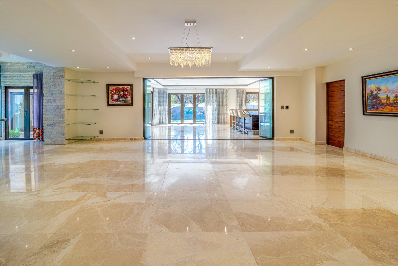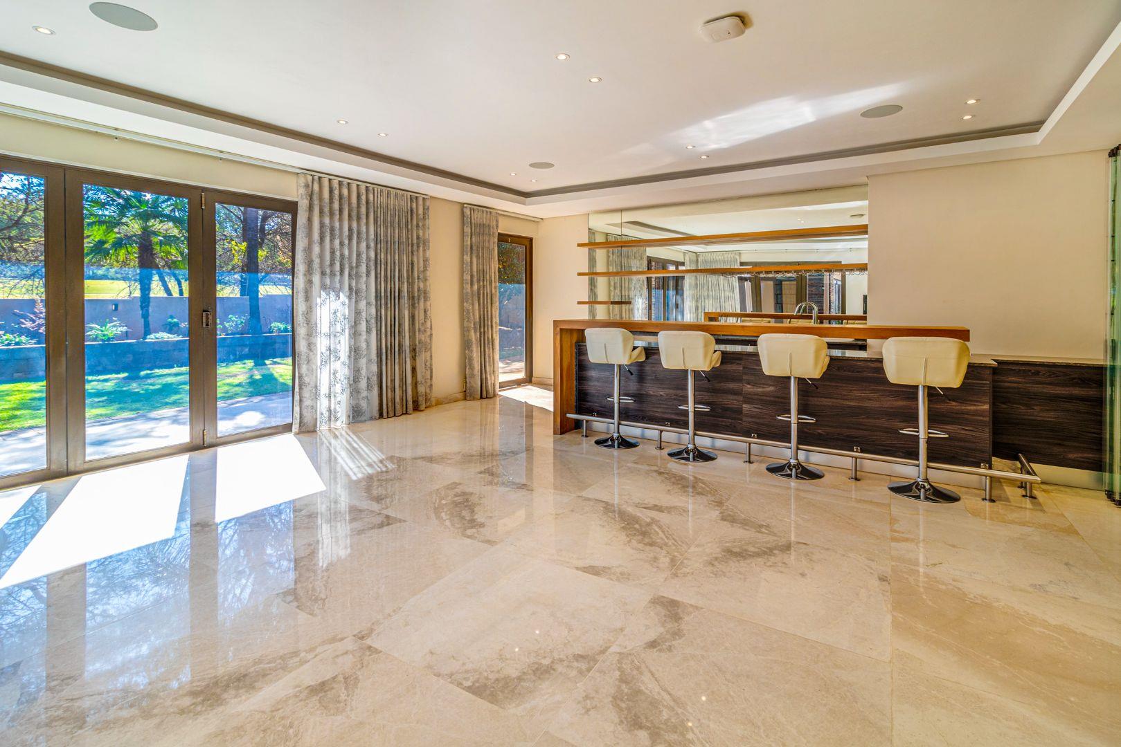 The expansive living areas encompass a formal lounge, dining room, and a second lounge complete with a bar and built-in braai. The enclosed, heated pool offers year-round relaxation and showcases views of the picturesque green belt and 3rd hole.