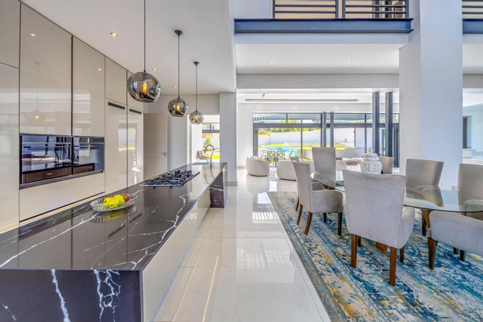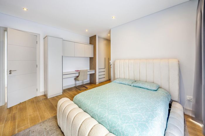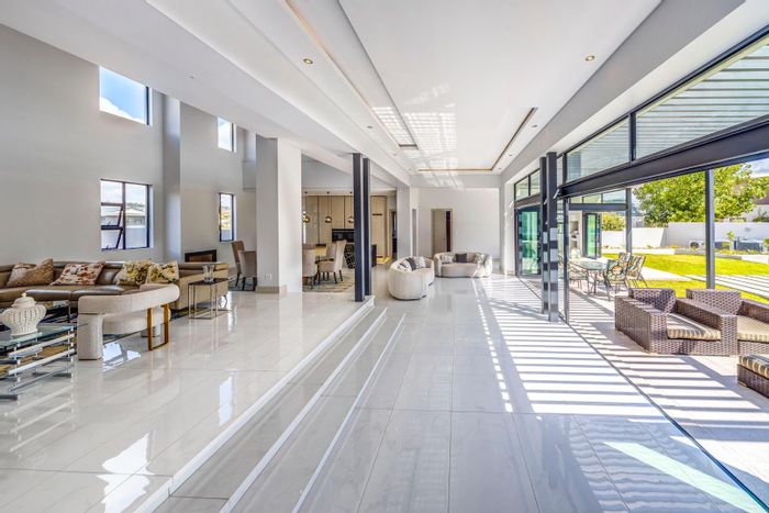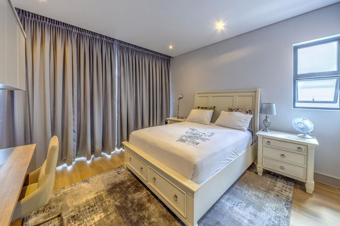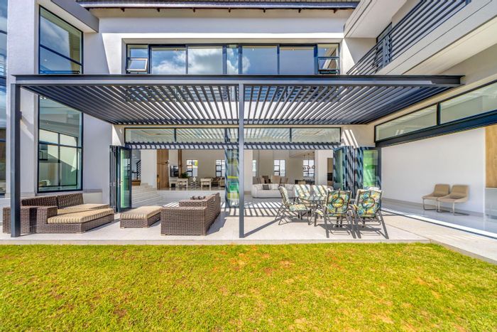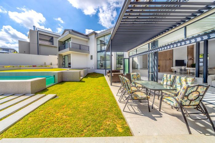 Fully furnished contemporary townhouse with butterfly roof and double-volume entrance, garden patio with braai and hot tub; near major routes, shopping and schools — 3 beds, 2.5 baths, double garage.