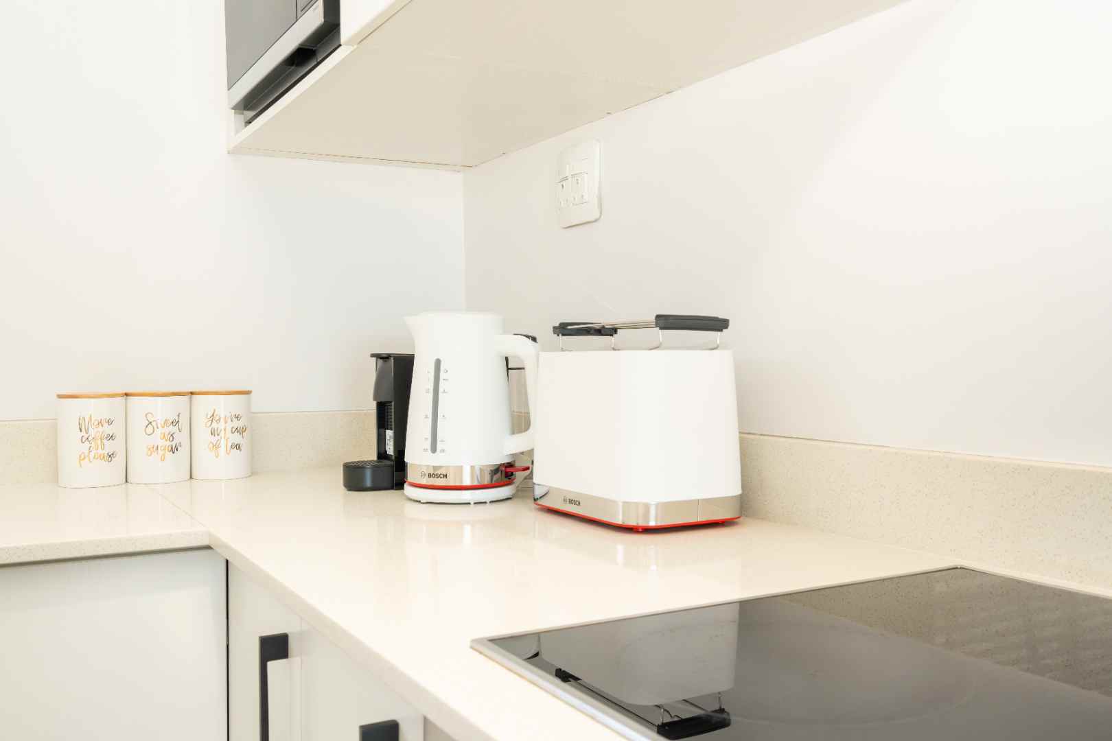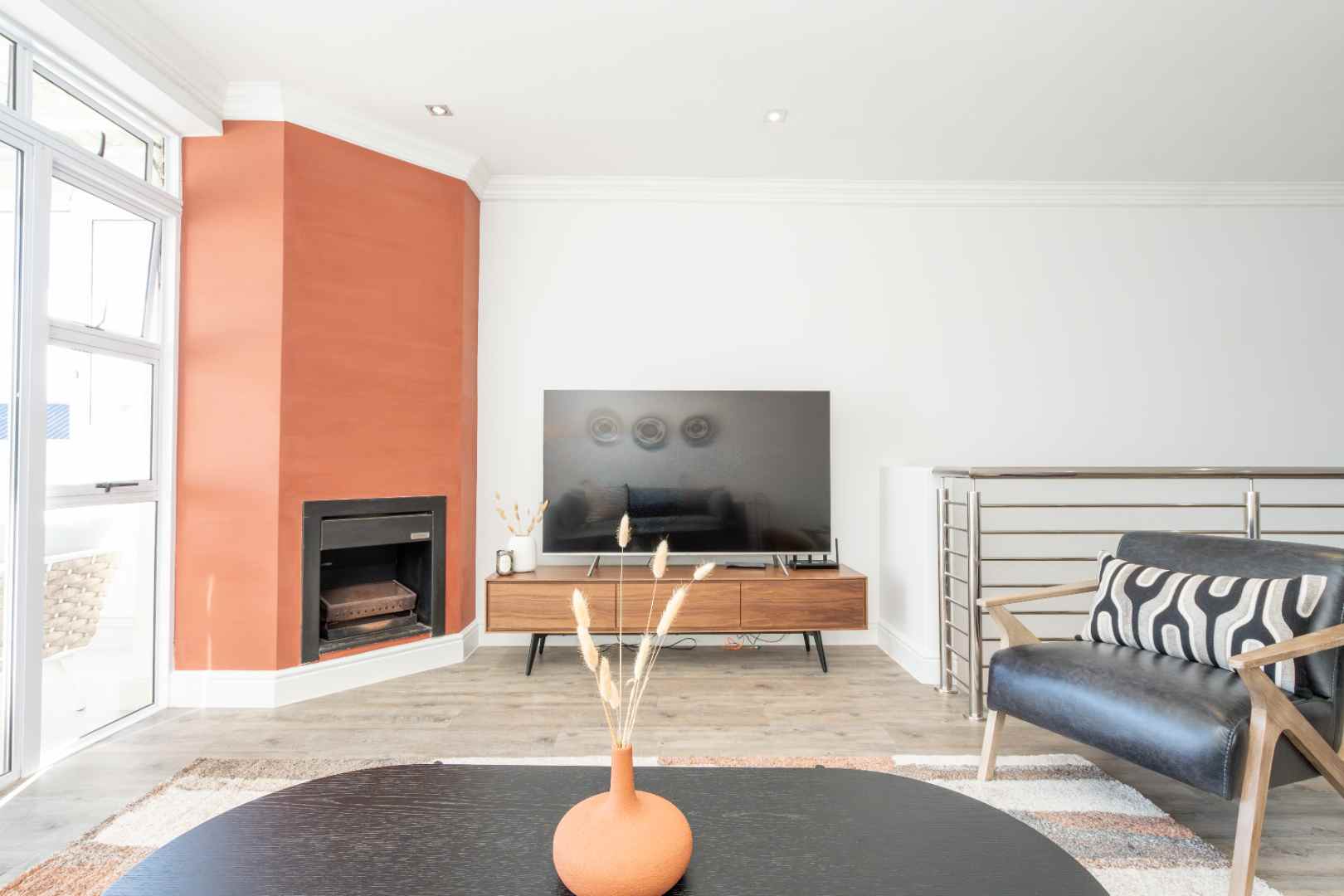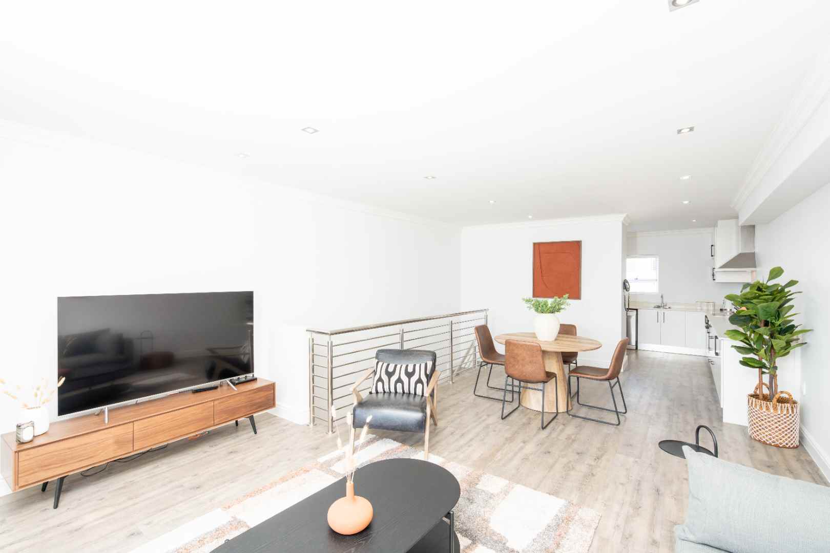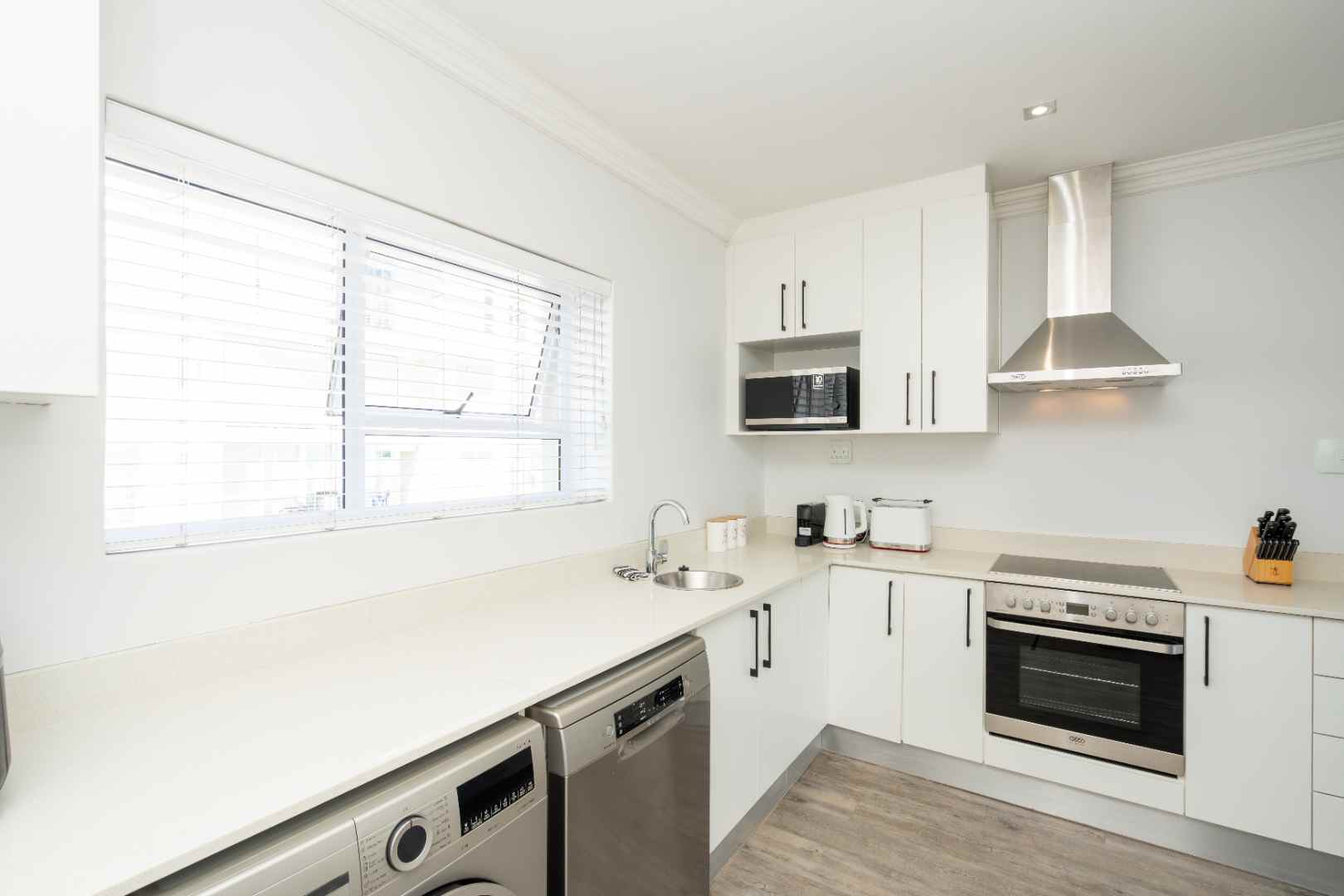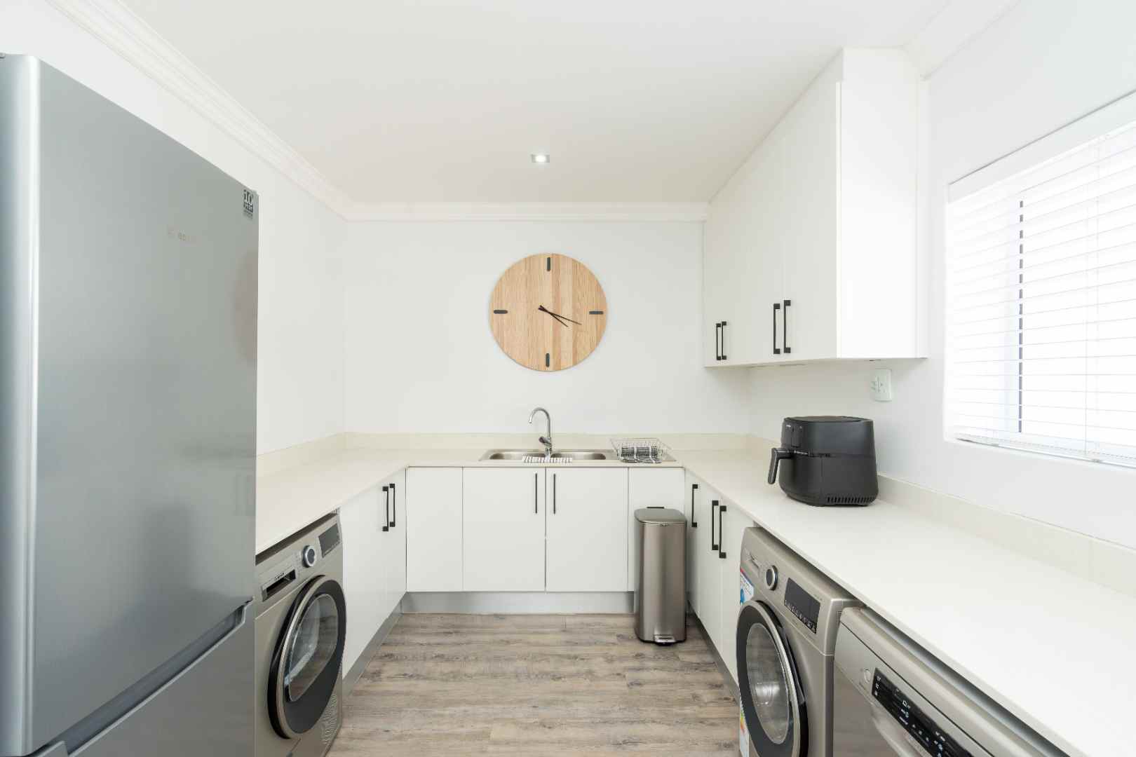 Large open-plan living spaces: smart TV, full kitchen (airfryer, dishwasher, washer, dryer and fridge).