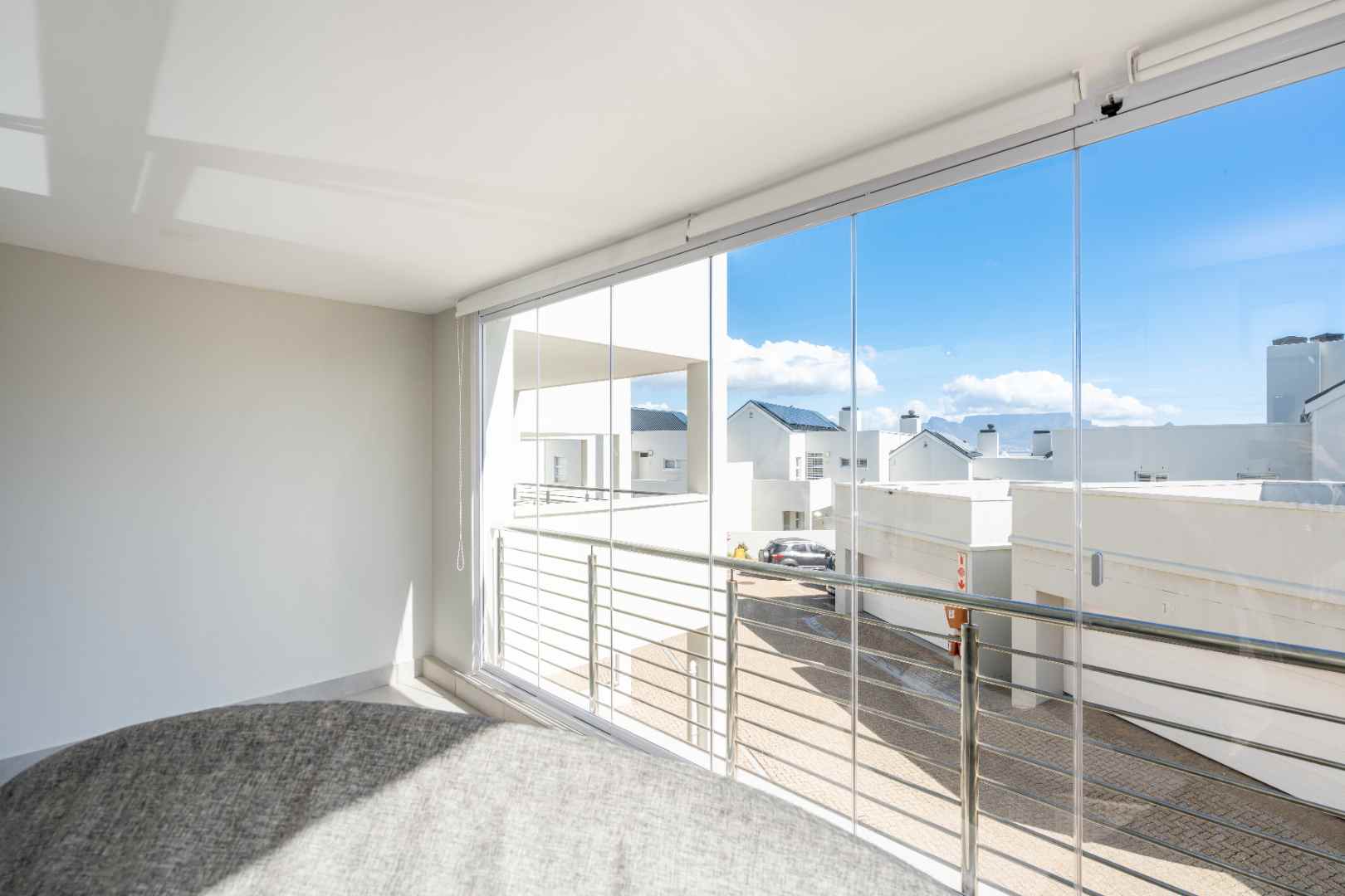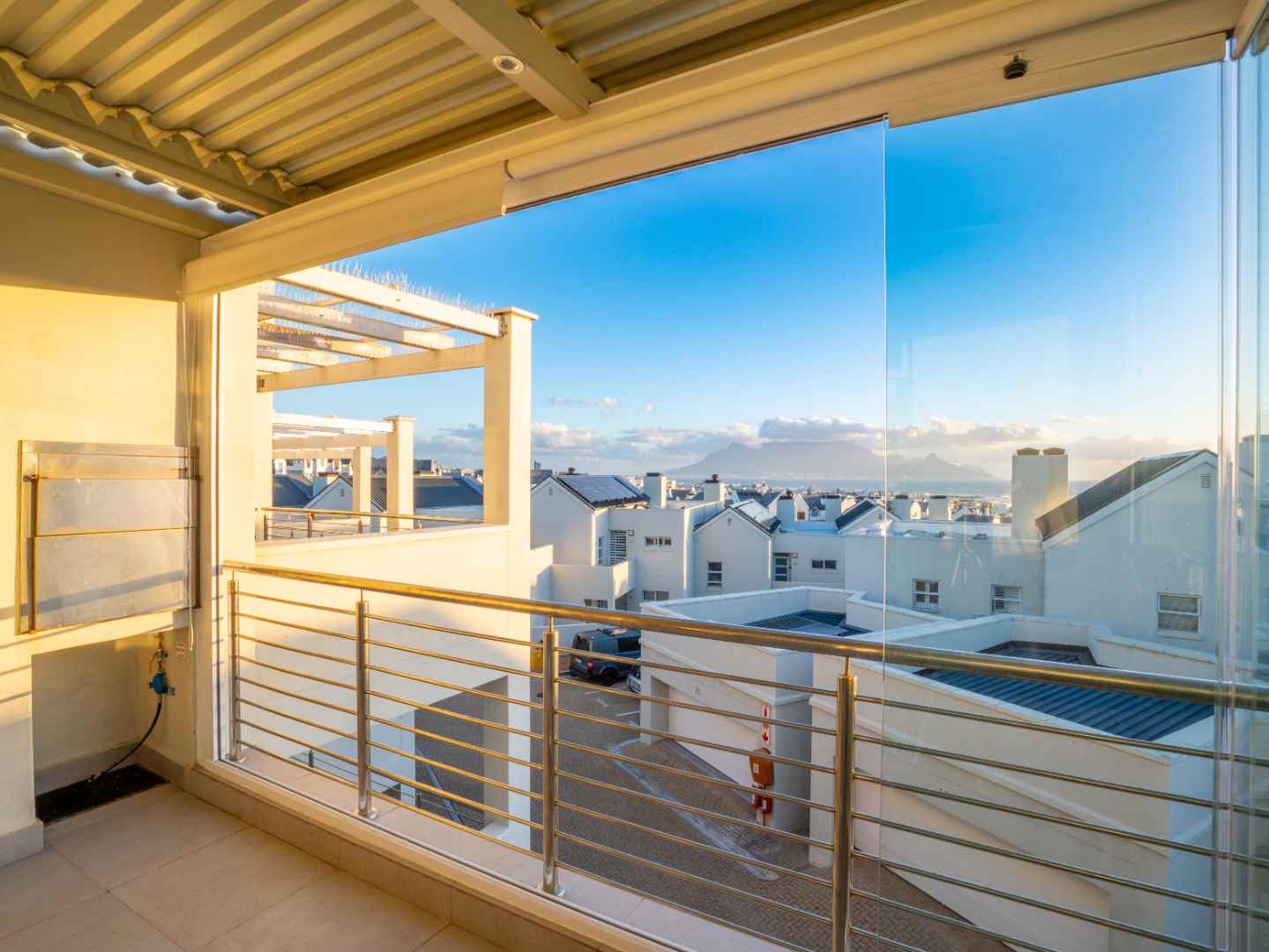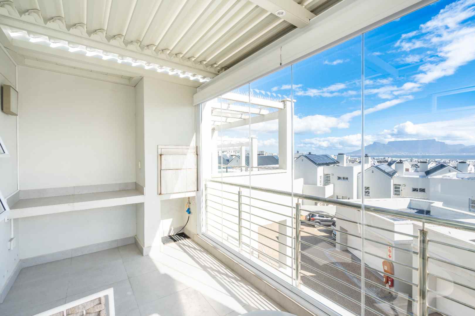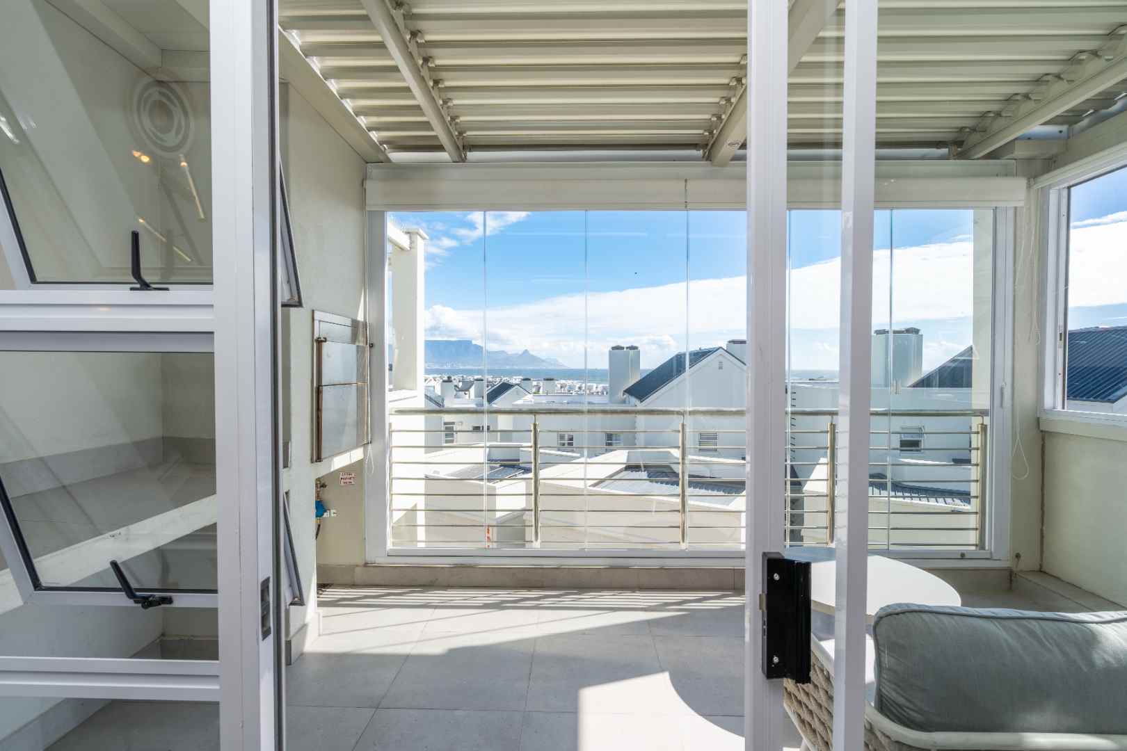 Slide open the doors to the enclosed second balcony, where comfortable outdoor seating and a gas braai invite you to relax and soak in the panoramic, uninterrupted views of the Table Mountain backdrop.